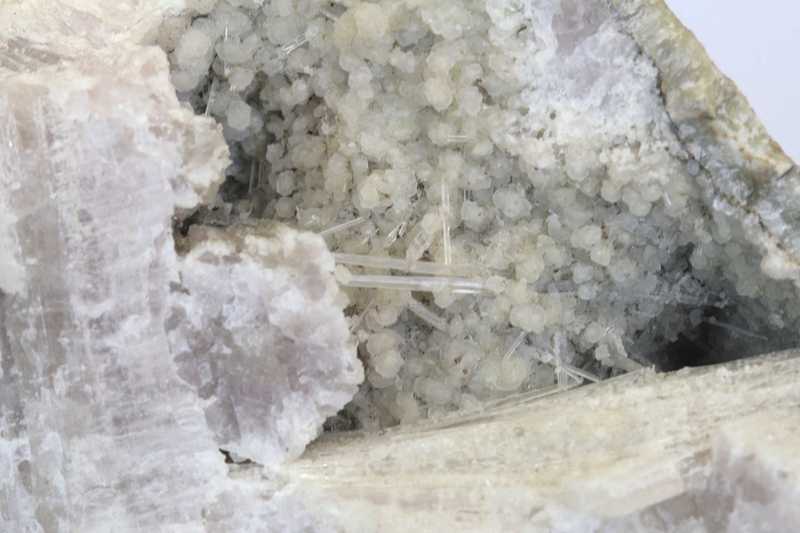 Ästhetisches Aragonit-Exemplar aus der klassischen Lokalität Všechlapy. Sehr schöne Probe einer Druse von leicht violett gefärbten Aragonitkristallen, die in einer Höhlung farblose Calcitkristalle überwachsen, aus denen stängelartige Aragonitkristalle herauswachsen .
