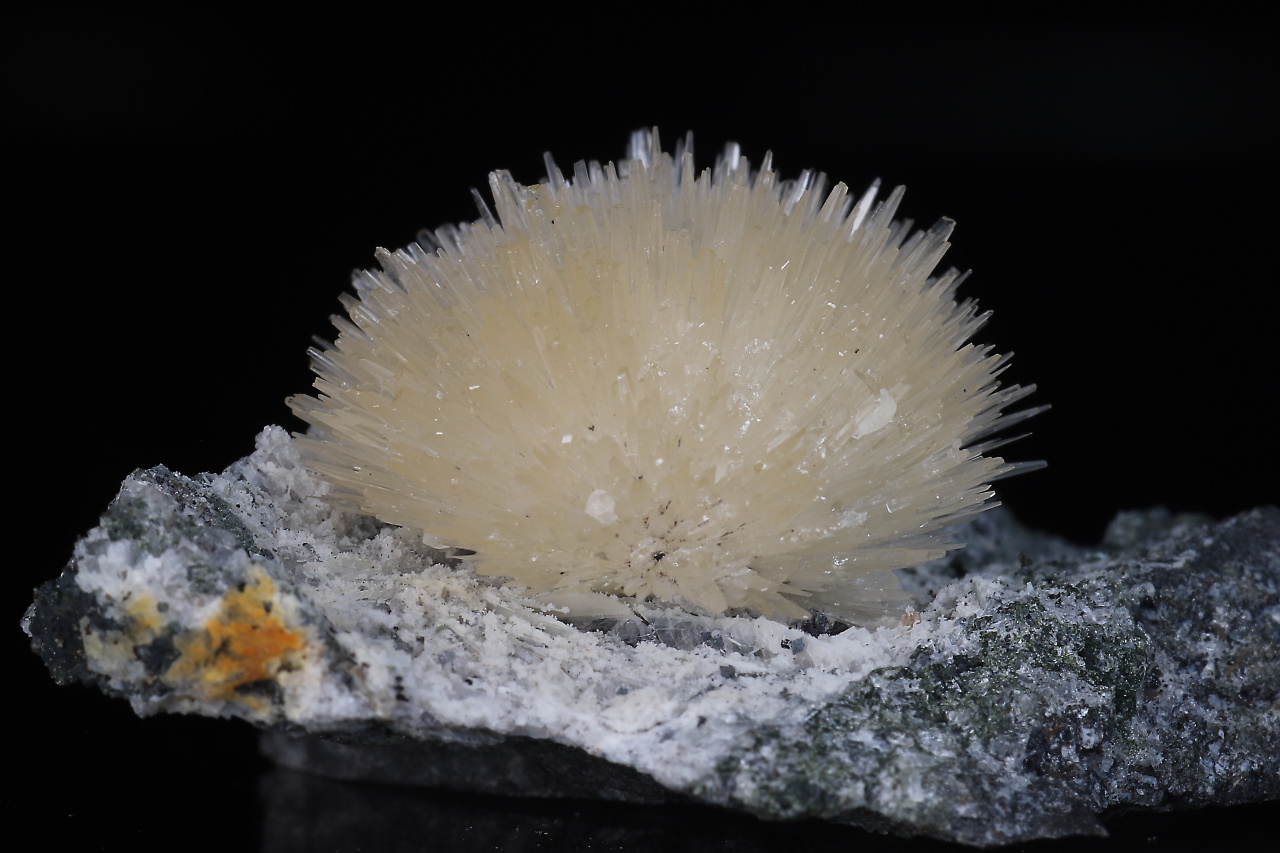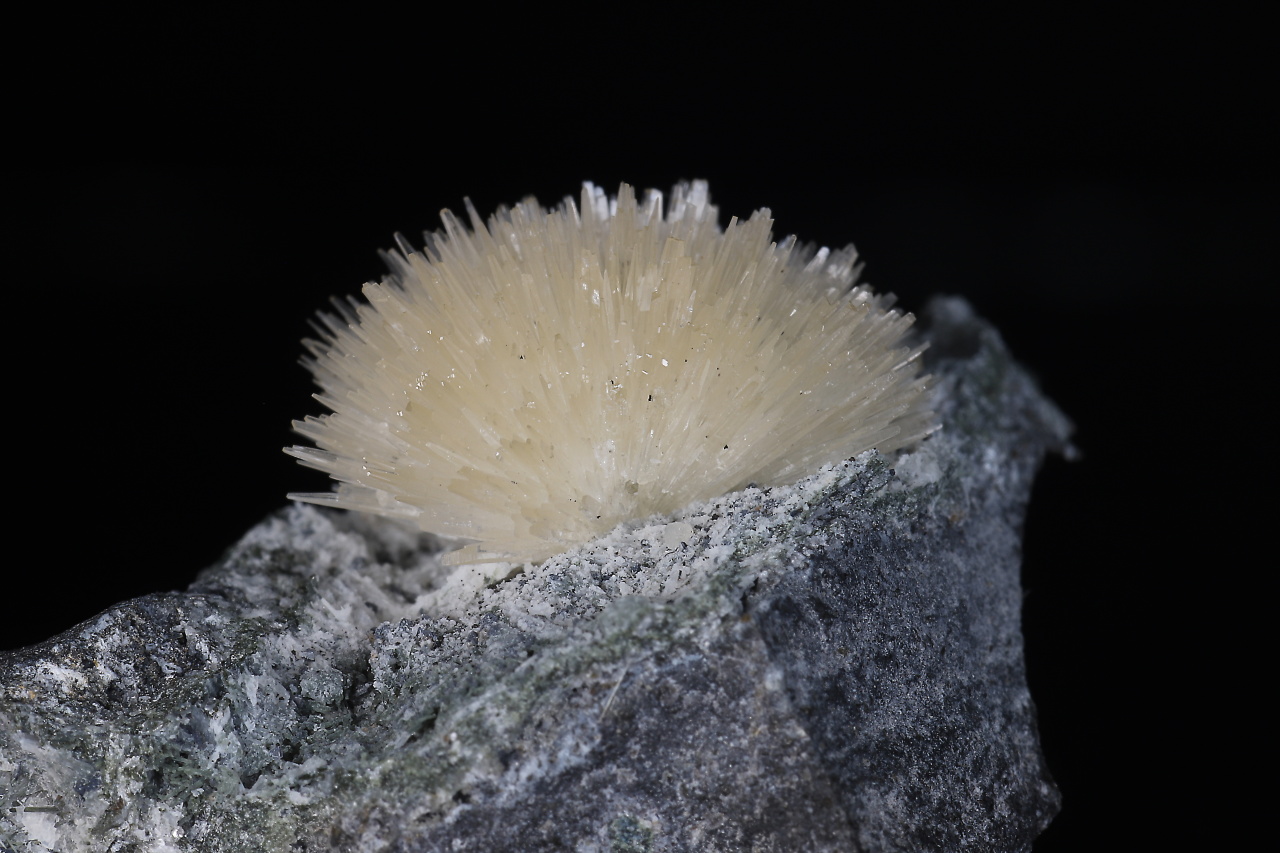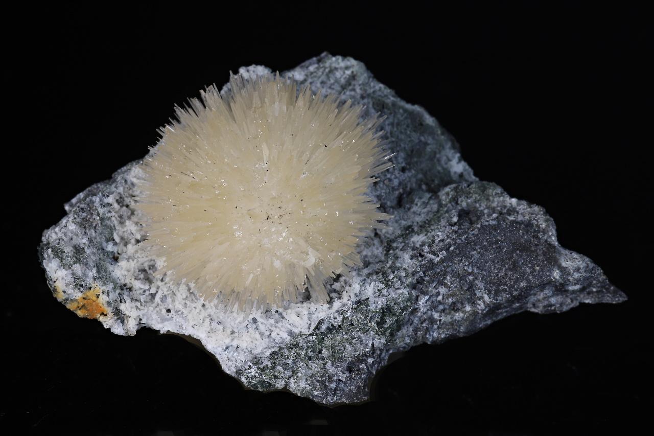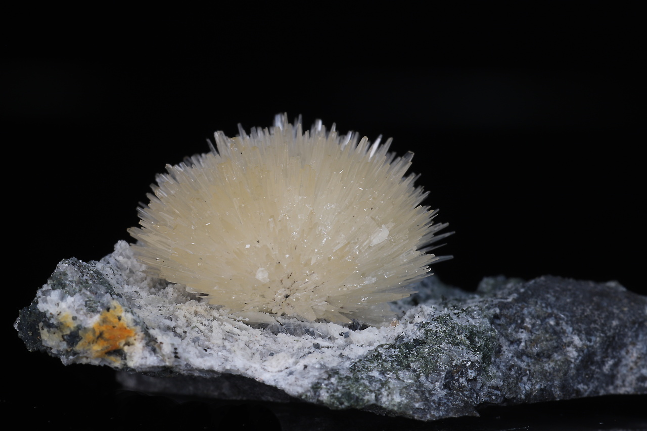Malý, ale velmi estetický vzorek ježkovitého agregátu krystalů aragonitu na podložce, která je zespoda upravená řezem. Ukázka pochází z vulkanické oblasti z lomu Bulhary na Slovensku.