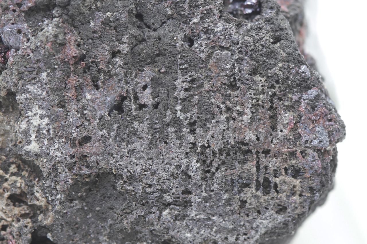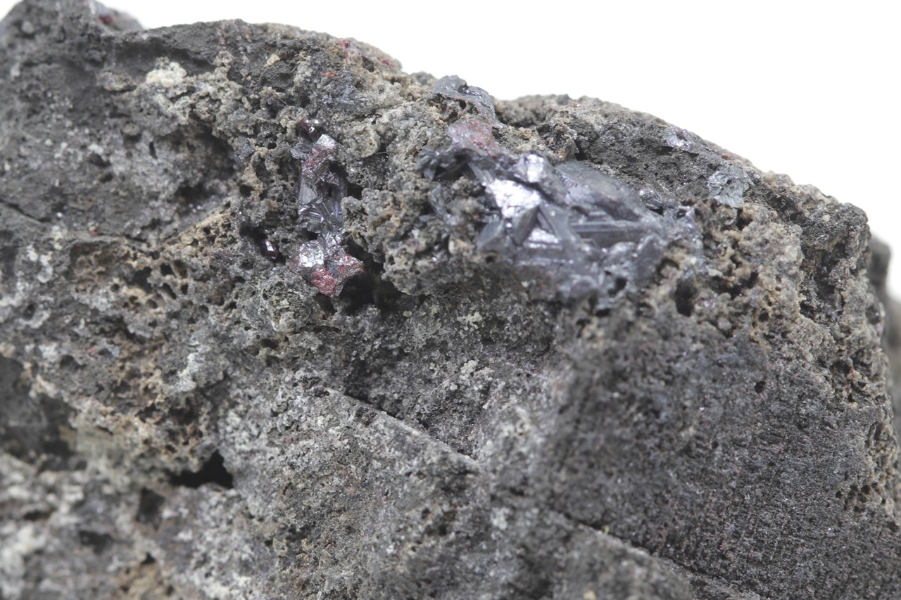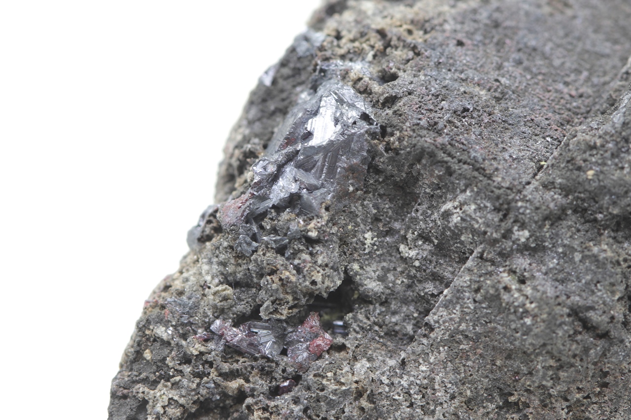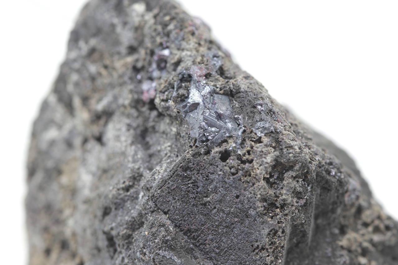 Probe eines massiven graubraunen Arsens, das zahlreiche kleinere Hohlräume enthält, in denen sich kleine, glasartig glänzende und rot gefärbte Proustit-Kristalle befinden. Jedoch kommt auf der Probe auch ein Cluster von länglich gestreckten, längs gerillten Kristallen dieses Silbersulfids vor, welche stahlgrau sind. Es hat die Maße 7 mm. Argentit bildet sehr kleine grauschwarze unregelmäßige Aggregate. Für beide Minerale ist Jáchymov die Typlokalität. Es handelt sich um eine Probe aus dem Jahr 1967 aus dem Bergwerk Eliáš .