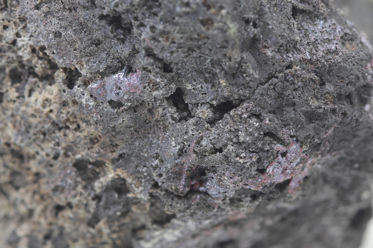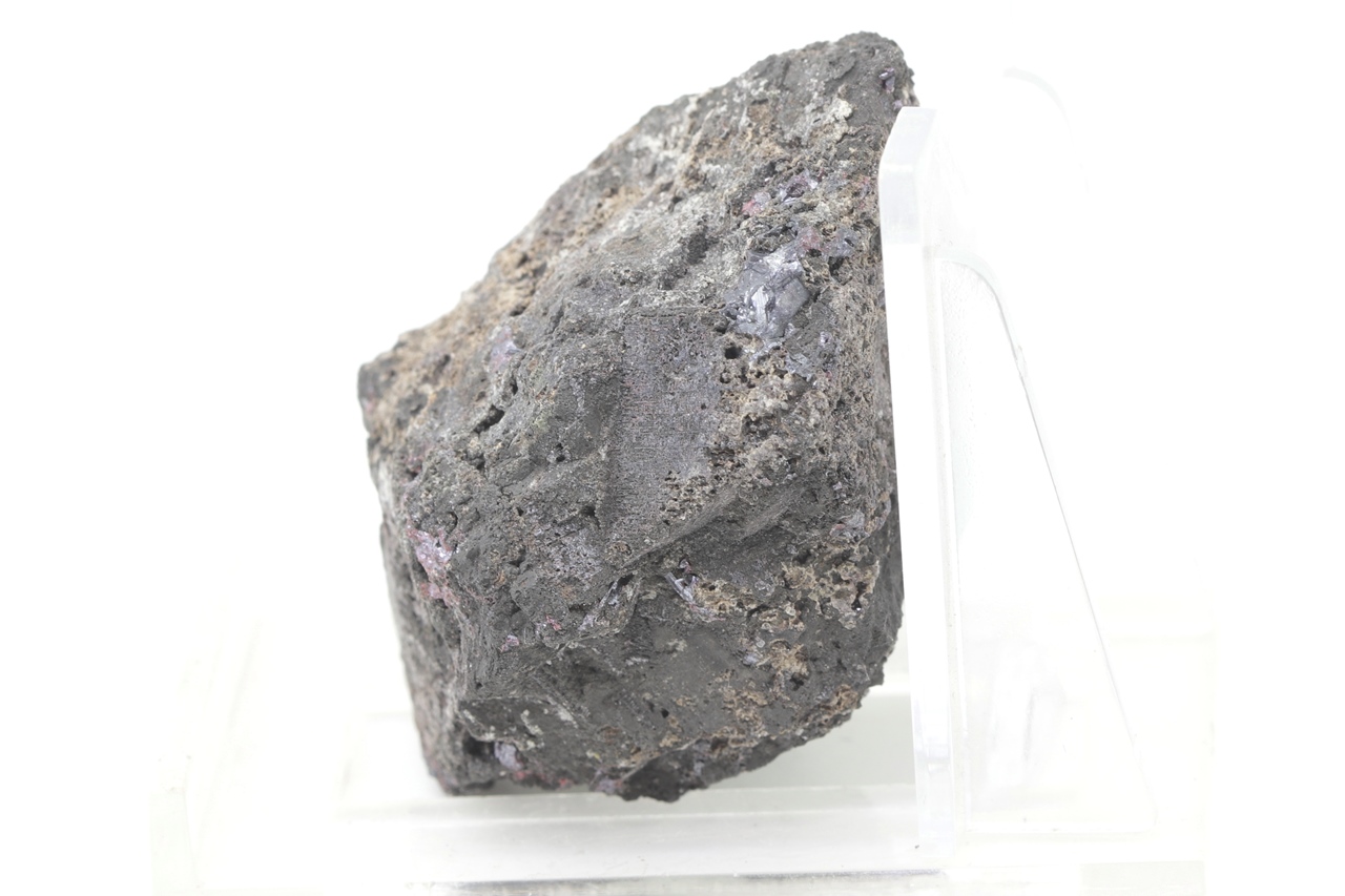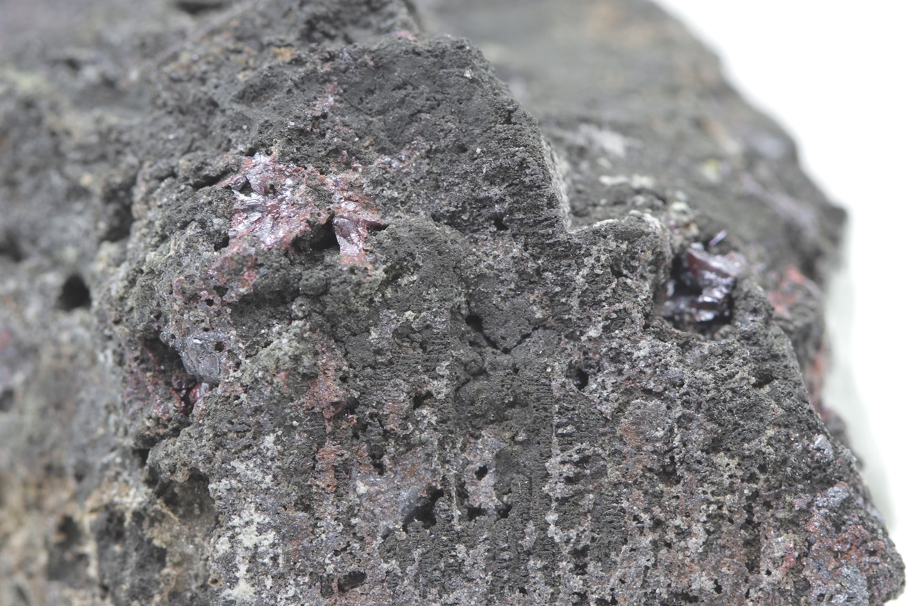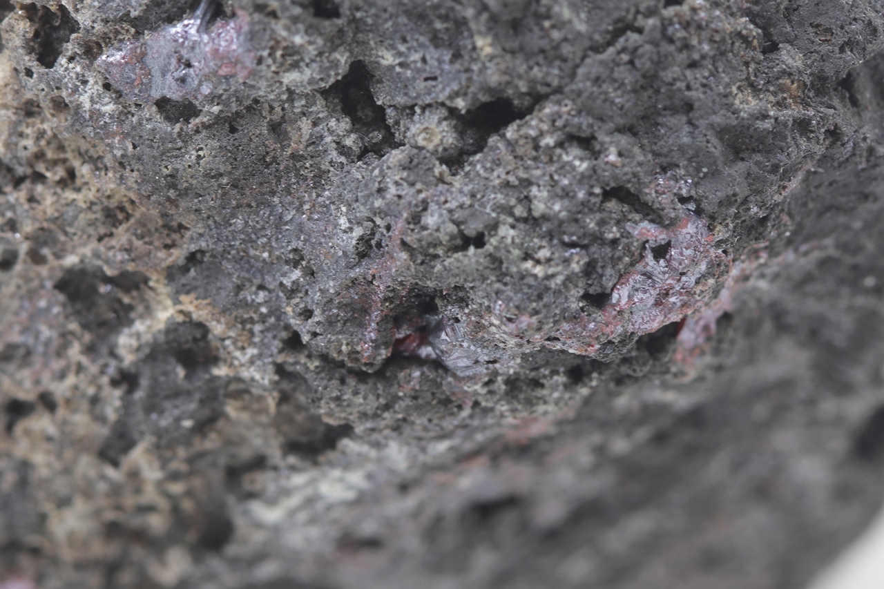 Probe eines massiven graubraunen Arsens, das zahlreiche kleinere Hohlräume enthält, in denen sich kleine, glasartig glänzende und rot gefärbte Proustit-Kristalle befinden. Jedoch kommt auf der Probe auch ein Cluster von länglich gestreckten, längs gerillten Kristallen dieses Silbersulfids vor, welche stahlgrau sind. Es hat die Maße 7 mm. Argentit bildet sehr kleine grauschwarze unregelmäßige Aggregate. Für beide Minerale ist Jáchymov die Typlokalität. Es handelt sich um eine Probe aus dem Jahr 1967 aus dem Bergwerk Eliáš .
