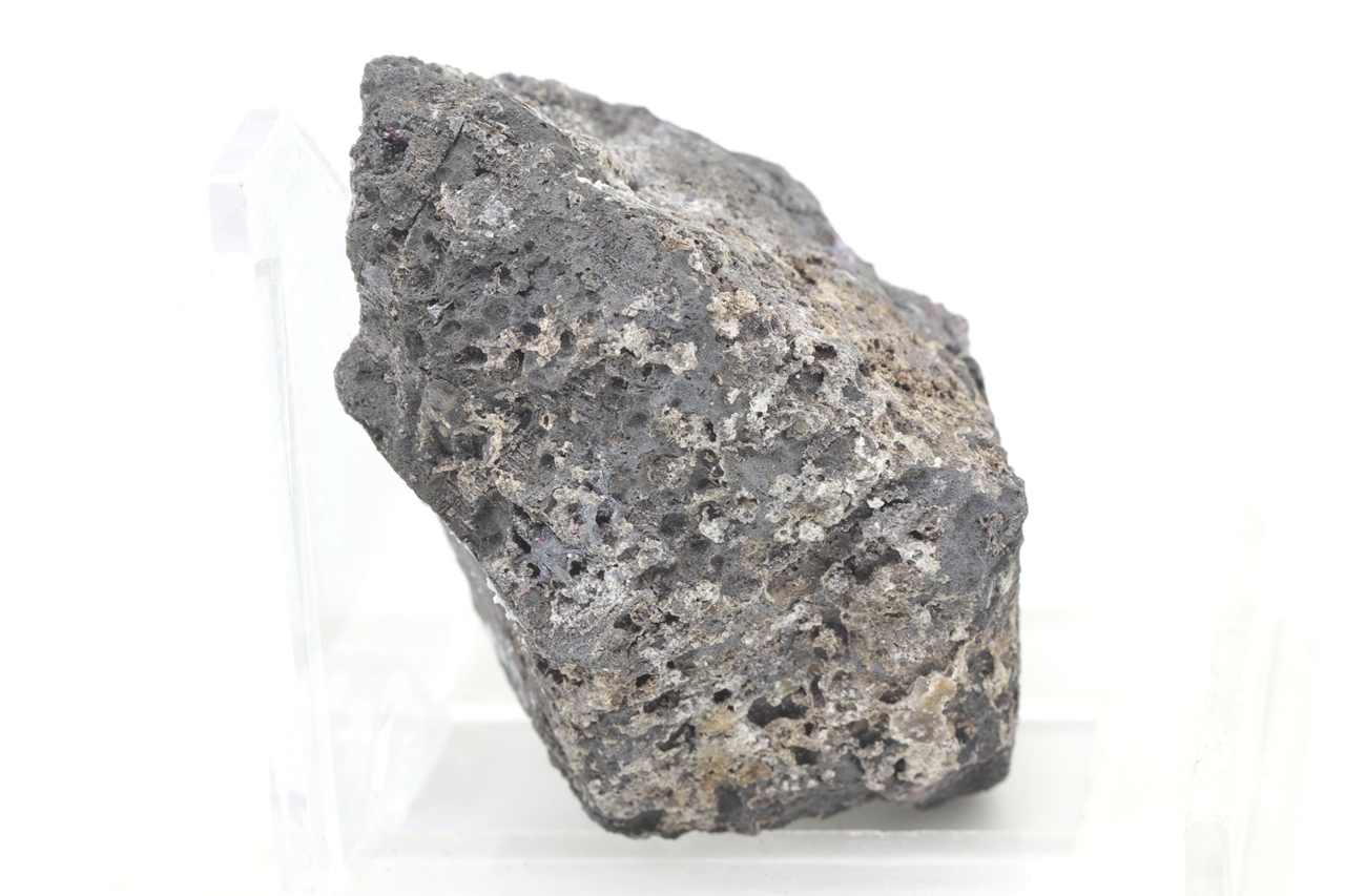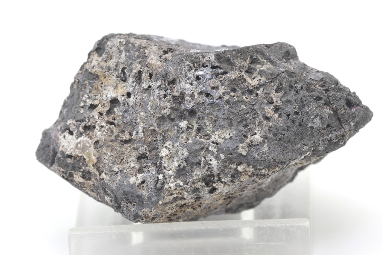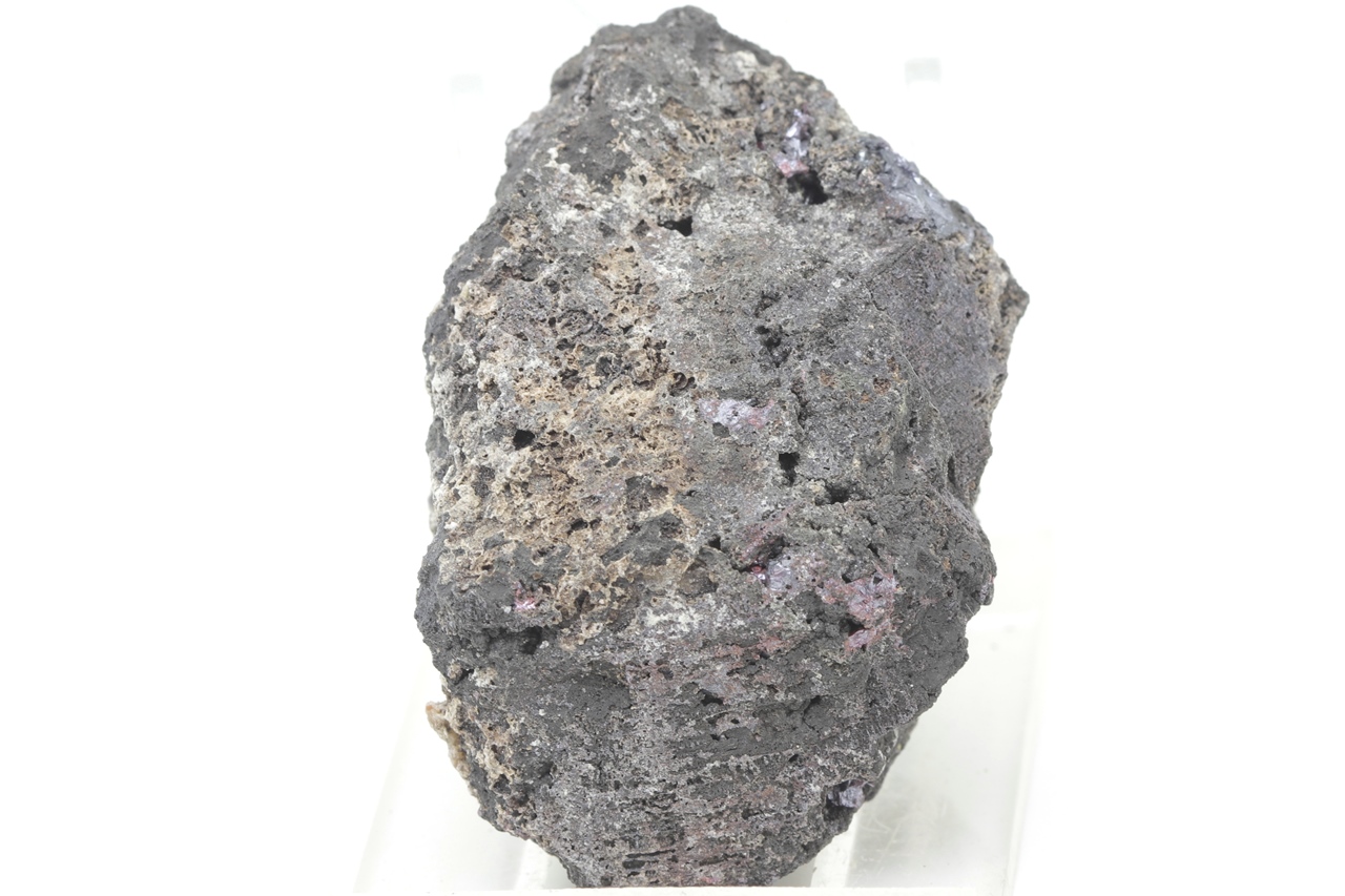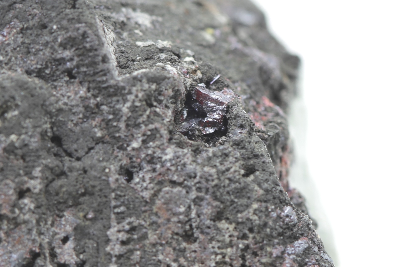 Probe eines massiven graubraunen Arsens, das zahlreiche kleinere Hohlräume enthält, in denen sich kleine, glasartig glänzende und rot gefärbte Proustit-Kristalle befinden. Jedoch kommt auf der Probe auch ein Cluster von länglich gestreckten, längs gerillten Kristallen dieses Silbersulfids vor, welche stahlgrau sind. Es hat die Maße 7 mm. Argentit bildet sehr kleine grauschwarze unregelmäßige Aggregate. Für beide Minerale ist Jáchymov die Typlokalität. Es handelt sich um eine Probe aus dem Jahr 1967 aus dem Bergwerk Eliáš .