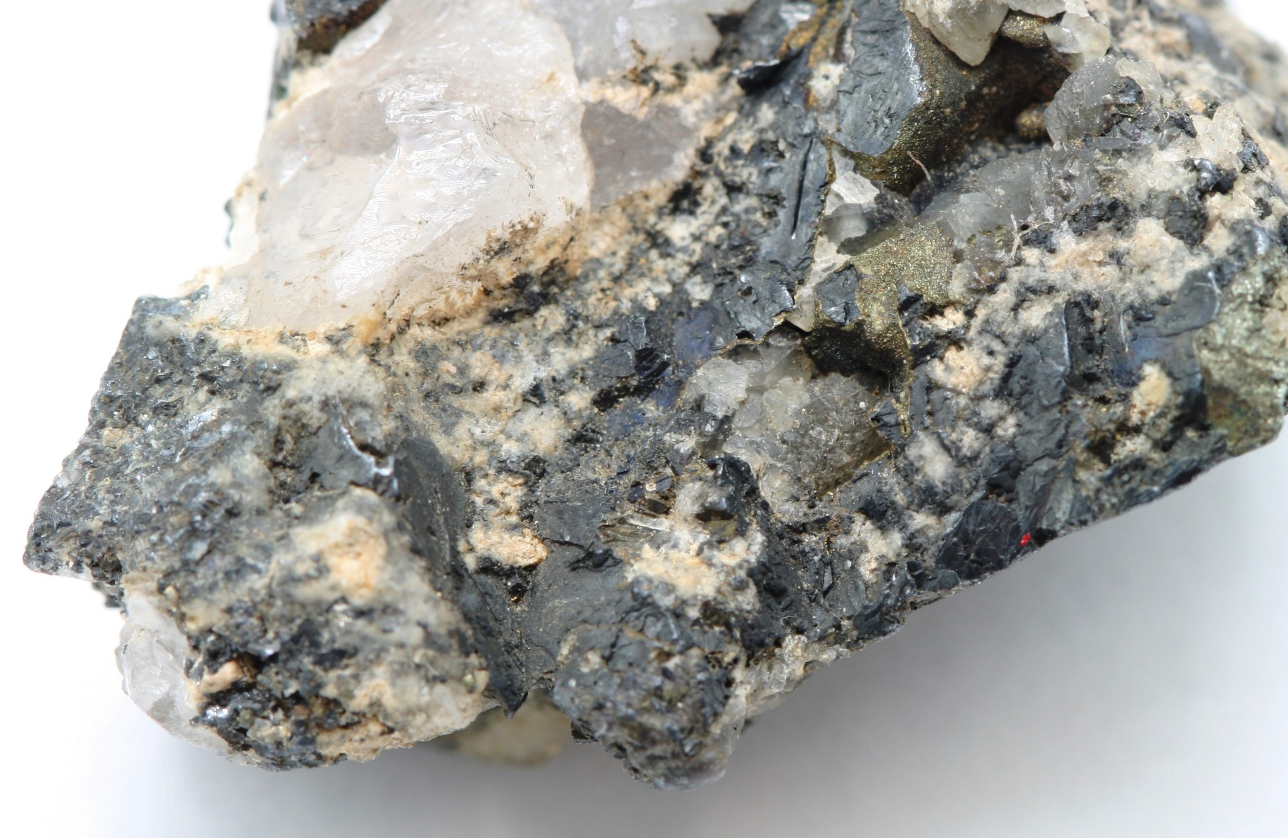 Krystal křišťálů, obrostlý černým masivním Argentitem a na povrchu je do dutiny ukončený drobně krystalickými kulovitými agregáty pyritu. Typická asociace stříbronosných žil Bánské Štiavnice.