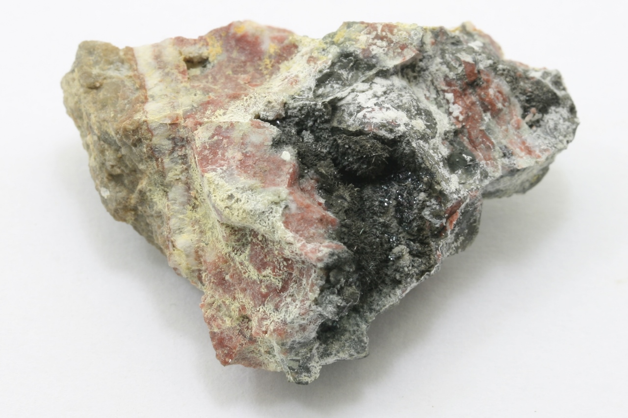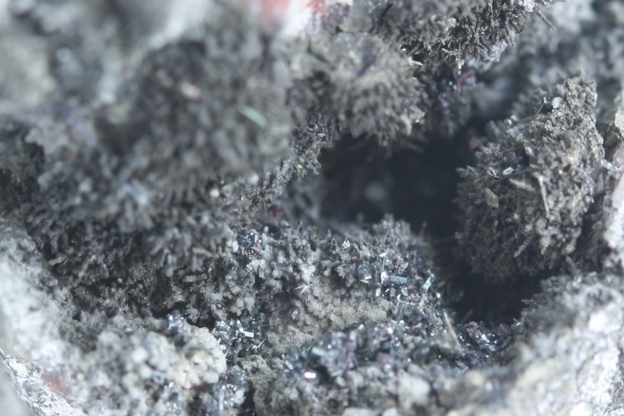 Dutina vyplněná lesklými sloupcovitými krystaly Argentopyritu a červenými krystaly Proustitu.