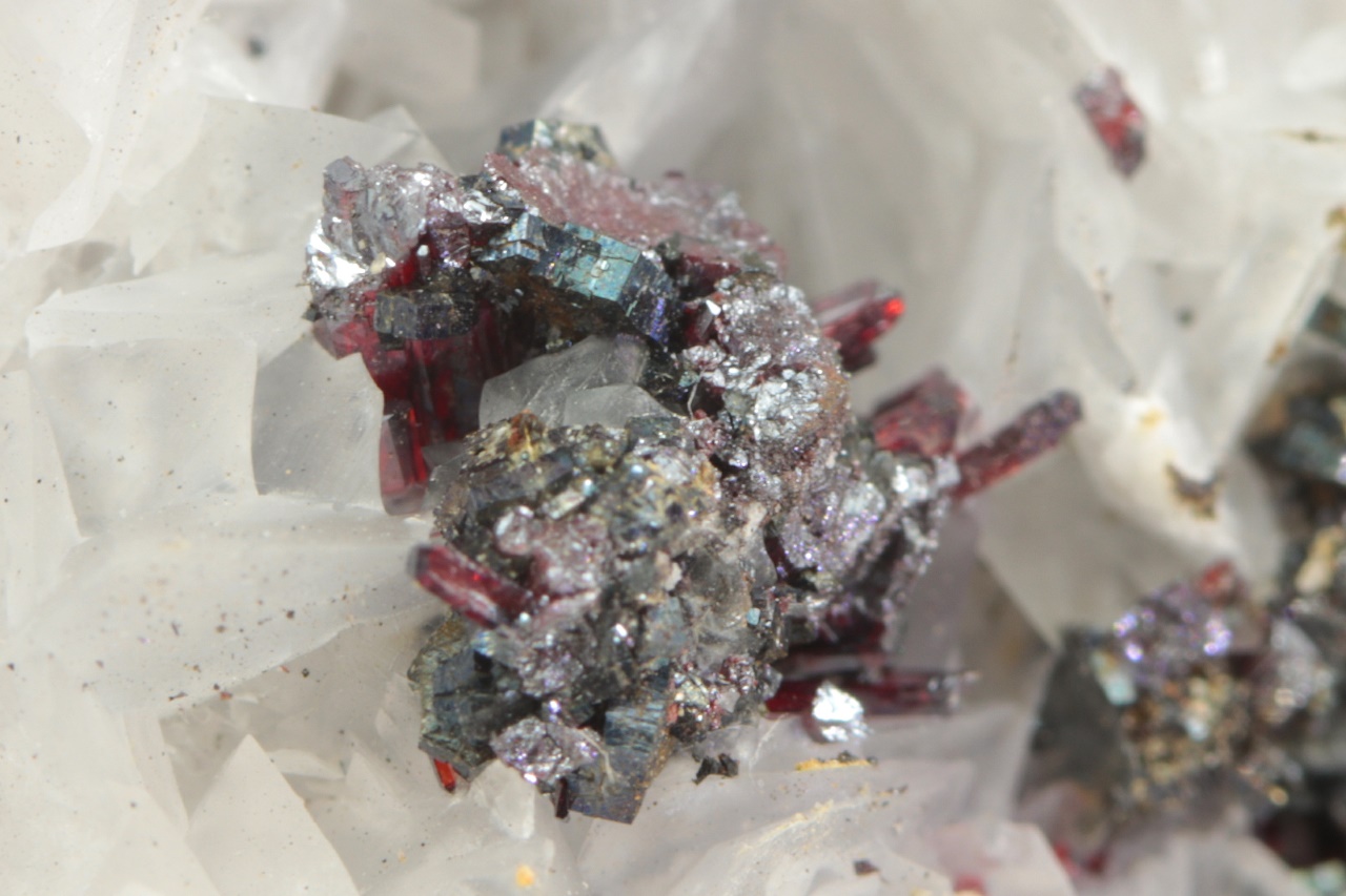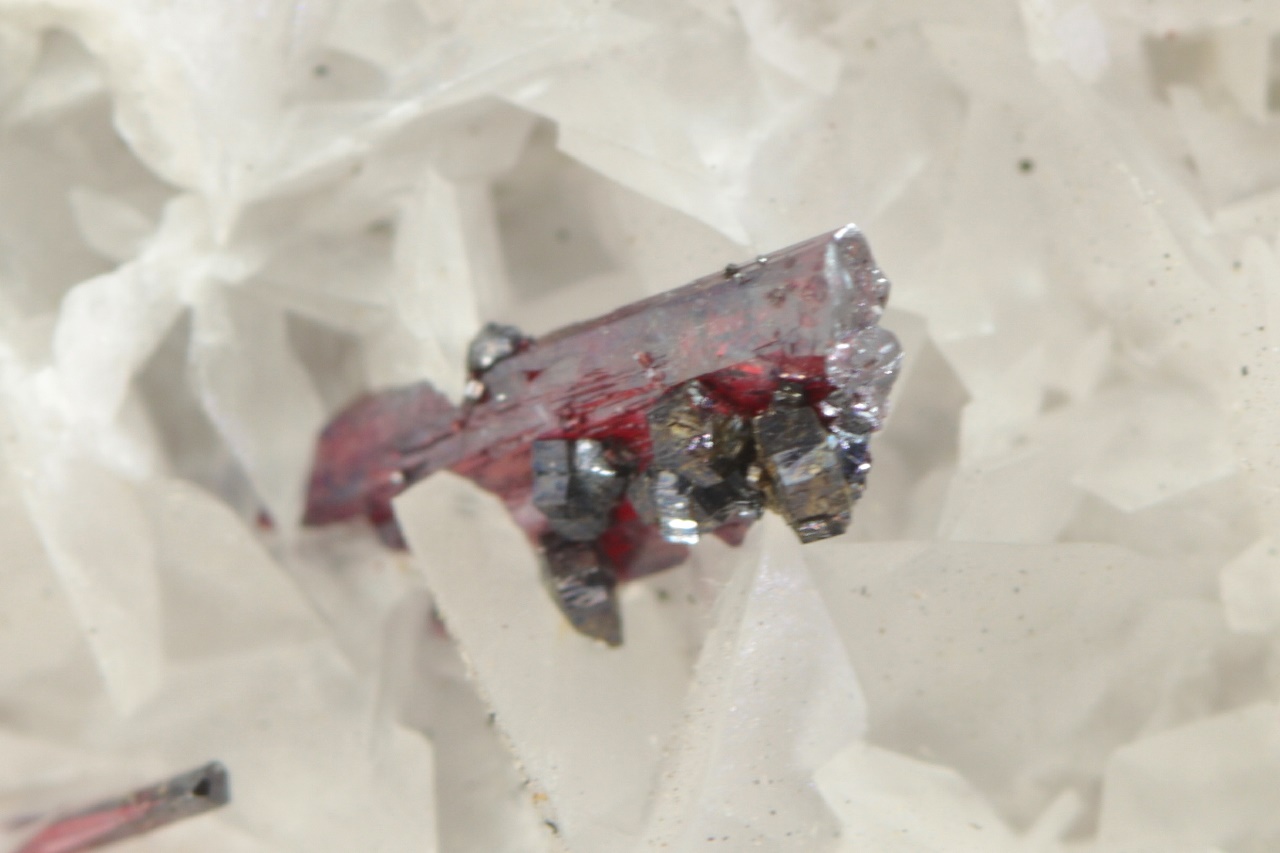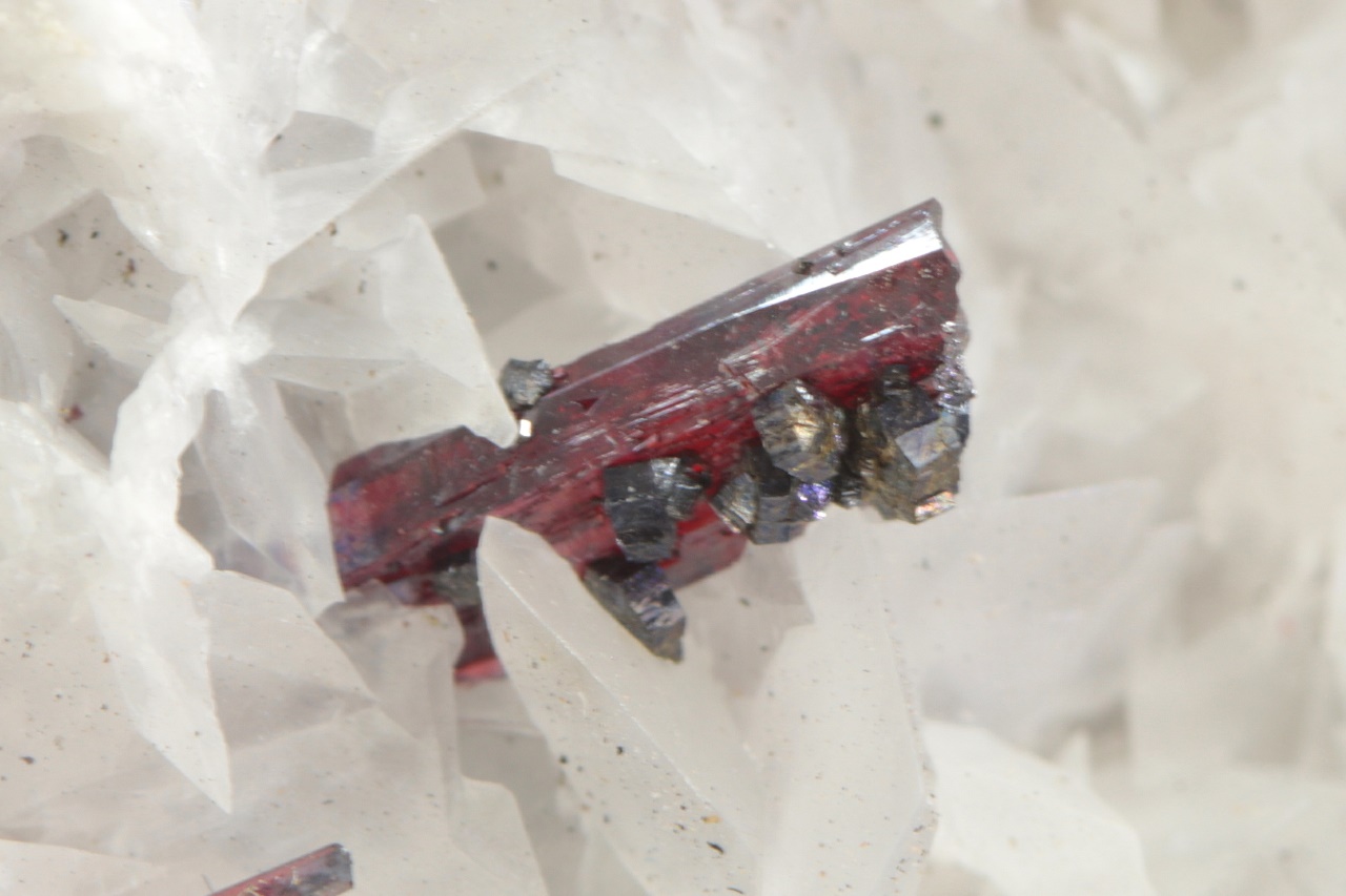 Nádherná ukázka červených lesklých krystalů proustitu na kontrastním sněhobílém kalcitu, na které narůstají tmavé, lehce naběhlé tabulky argentopyritu. Jedná se o velmi neobvyklou minerální asociaci. Největší krystal proustitu (v levé spodní části vzorku) je 8 mm velký. Vzorek byl analyzován.