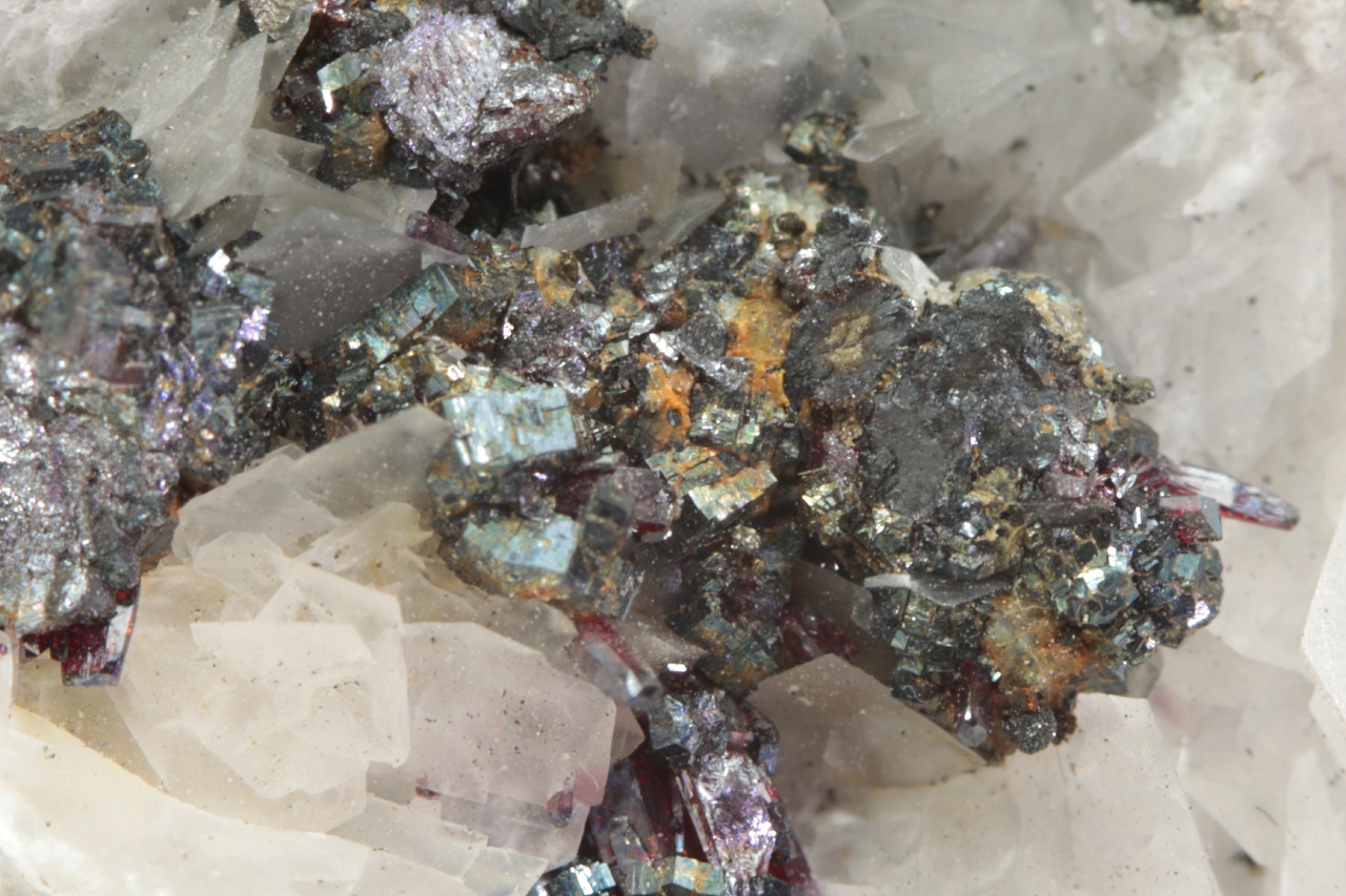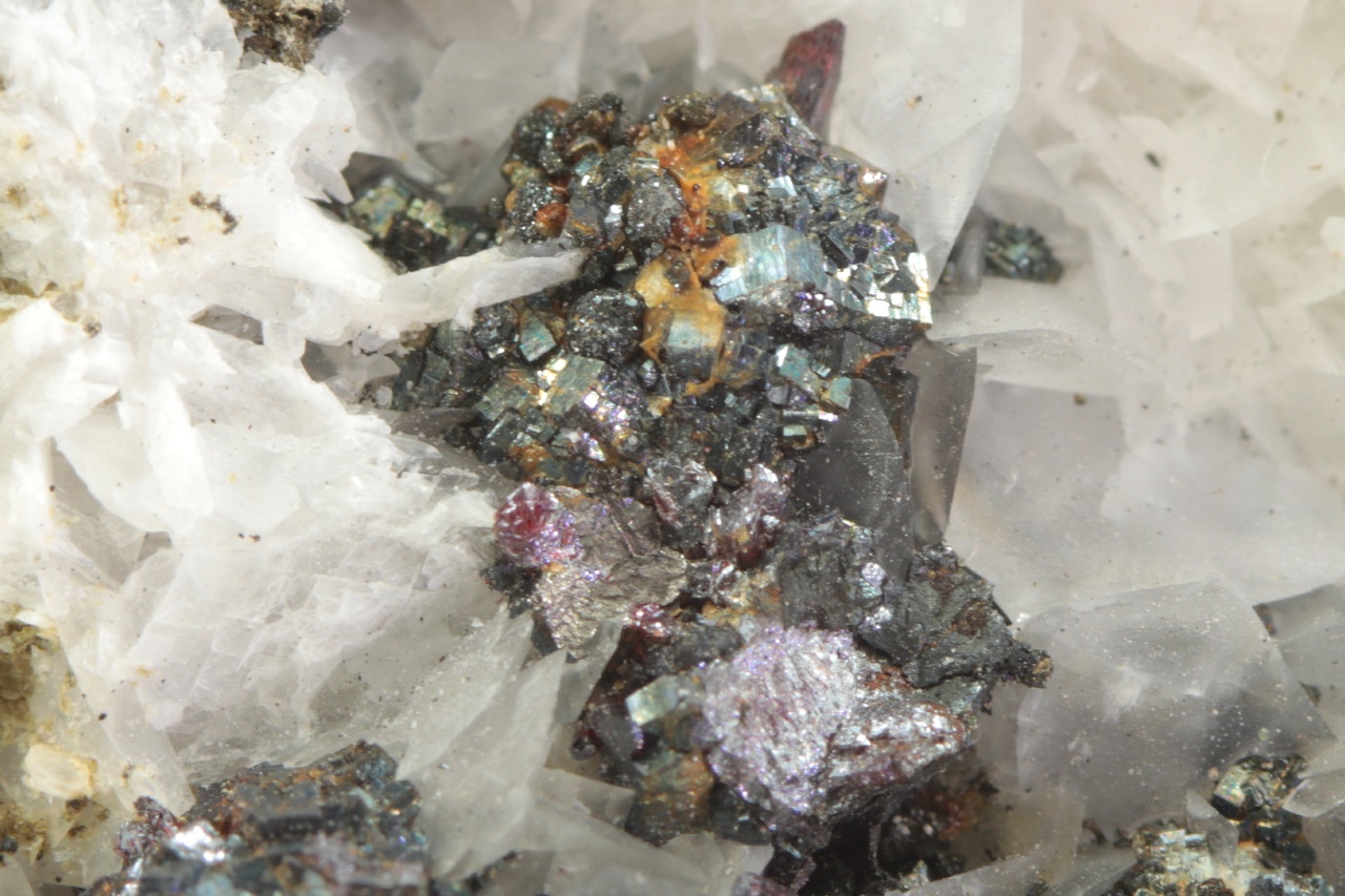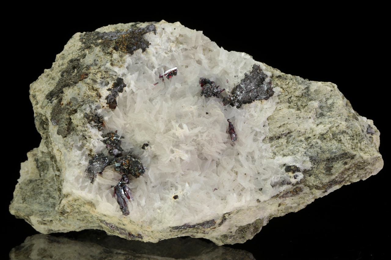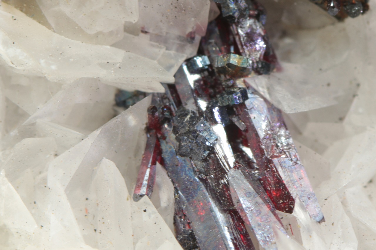 Nádherná ukázka červených lesklých krystalů proustitu na kontrastním sněhobílém kalcitu, na které narůstají tmavé, lehce naběhlé tabulky argentopyritu. Jedná se o velmi neobvyklou minerální asociaci. Největší krystal proustitu (v levé spodní části vzorku) je 8 mm velký. Vzorek byl analyzován.
