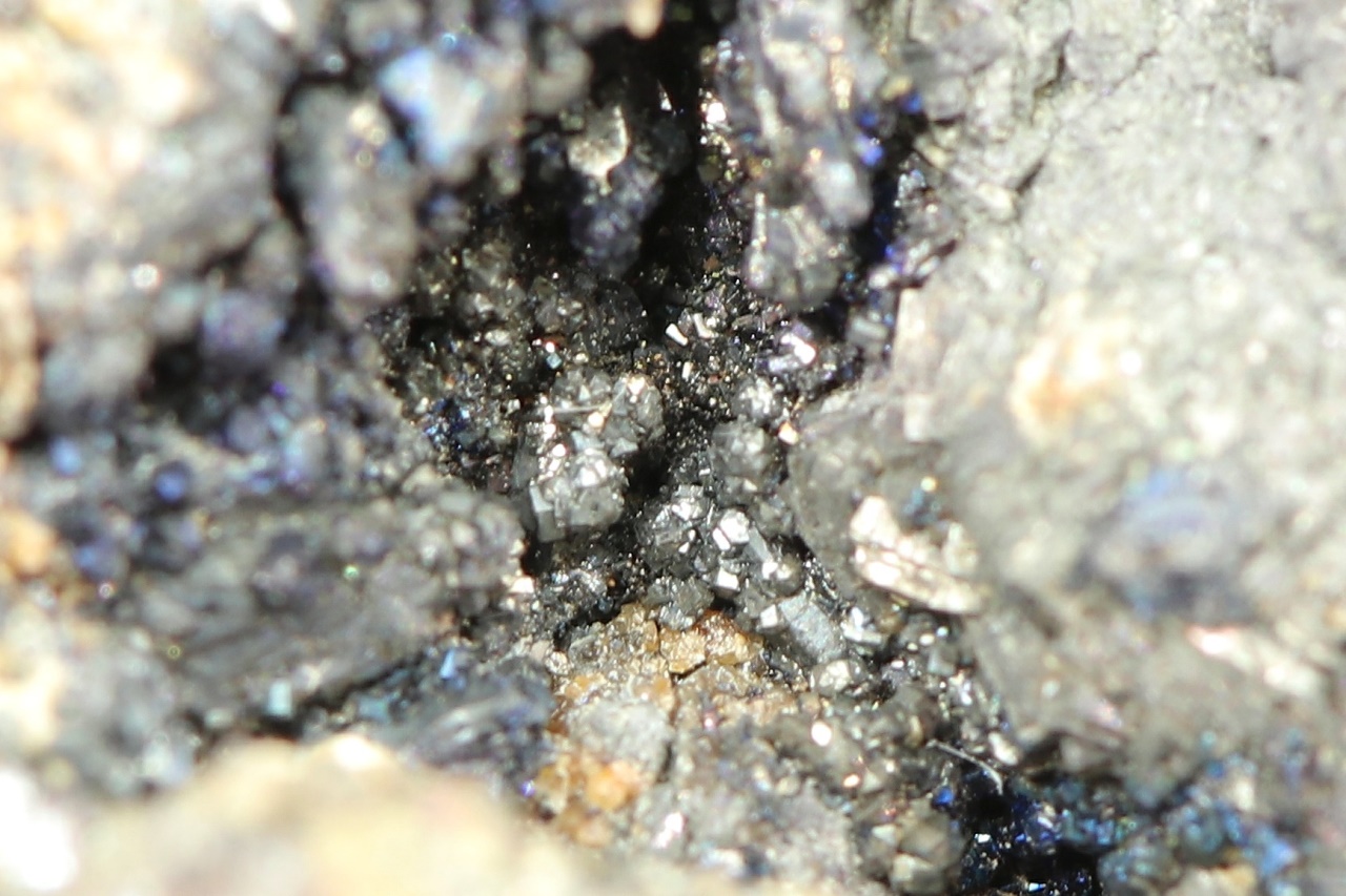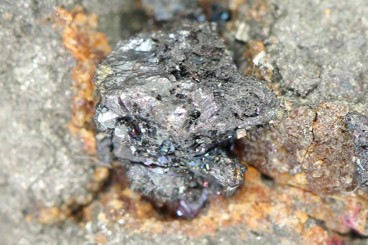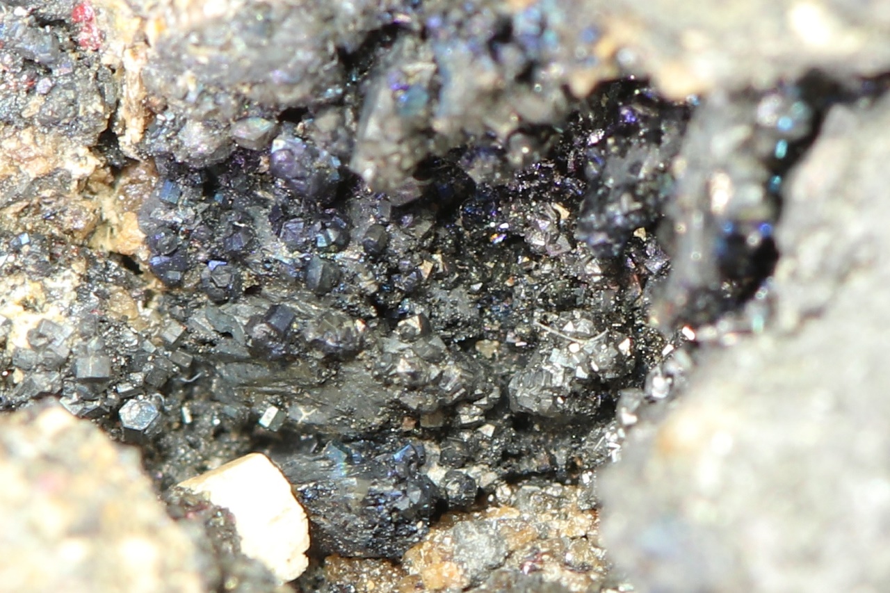 Fassförmige, sechseckige Kristalle von Argentopyrit mit Anlauffarben, die auf durchscheinende, metallisch glänzende rote Kristalle von Proustit wachsen. Die Höhlung im linken oberen Teil der Probe ist 1 cm groß .