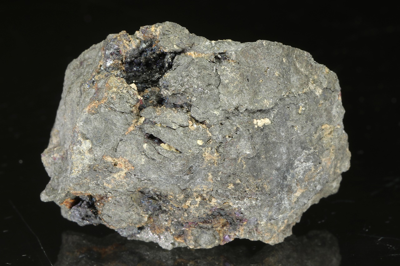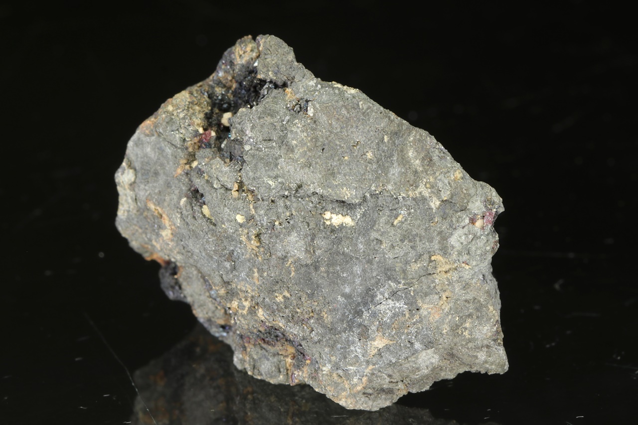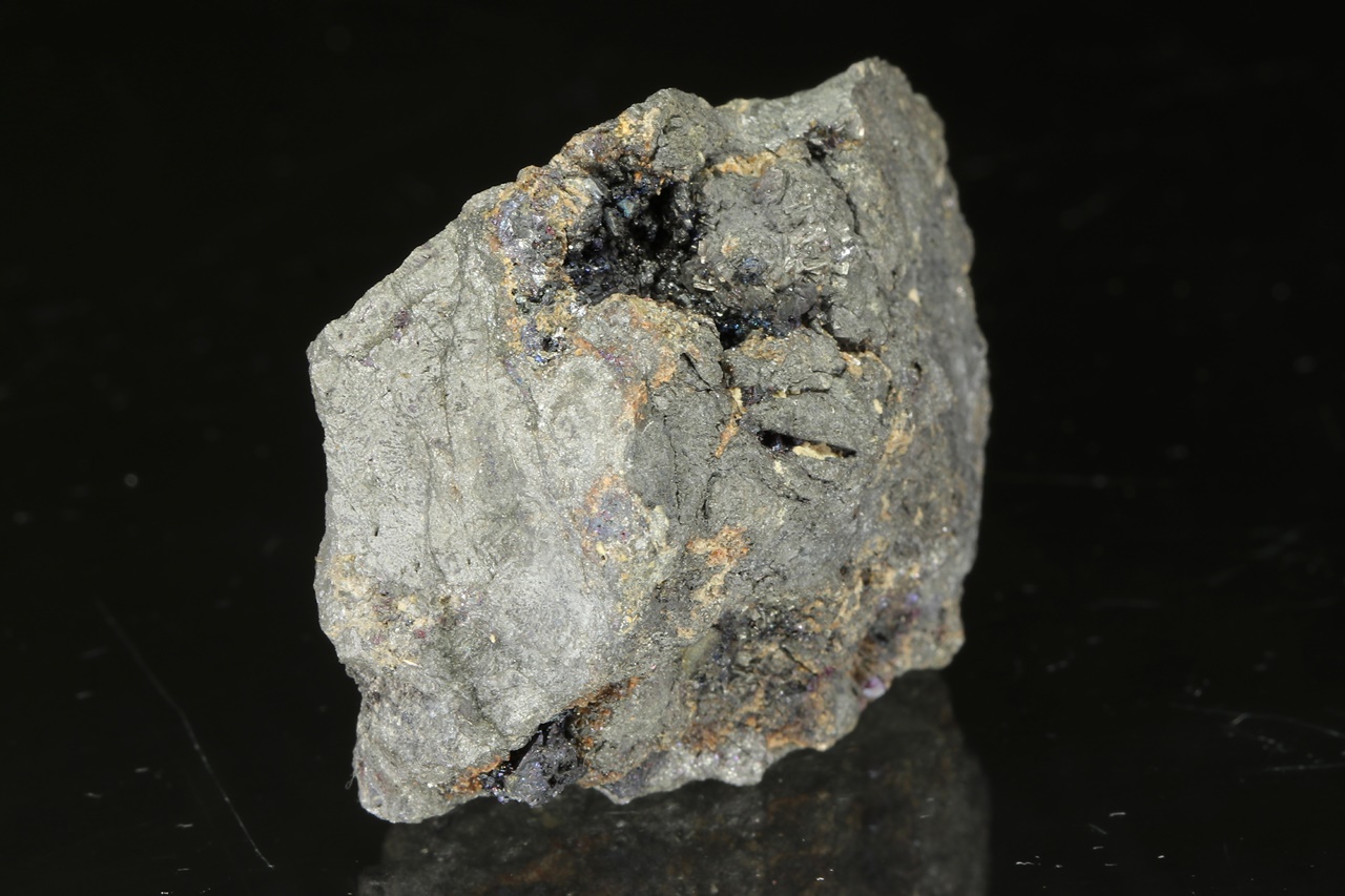 Fassförmige, sechseckige Kristalle von Argentopyrit mit Anlauffarben, die auf durchscheinende, metallisch glänzende rote Kristalle von Proustit wachsen. Die Höhlung im linken oberen Teil der Probe ist 1 cm groß .