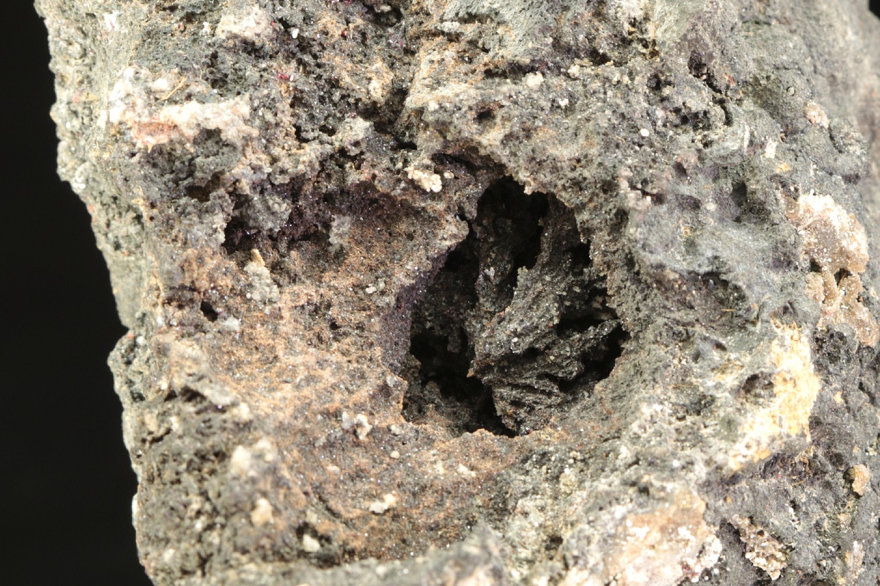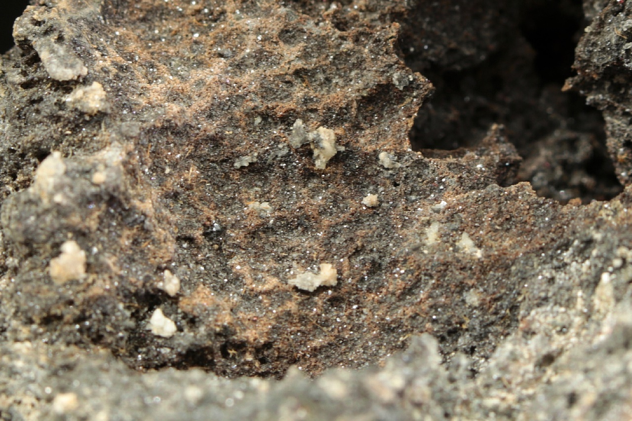 Stufe bestehend aus massivem Arsen, auf dem weißer Arsenolit in den Höhlen wächst, glänzende Kristalle von Arsen und rote Kristalle von Proustit.
