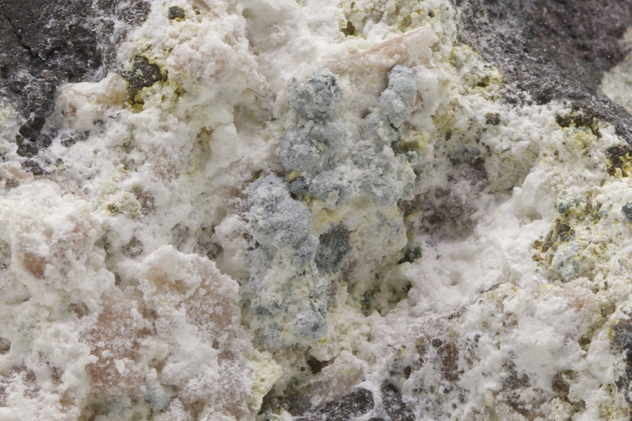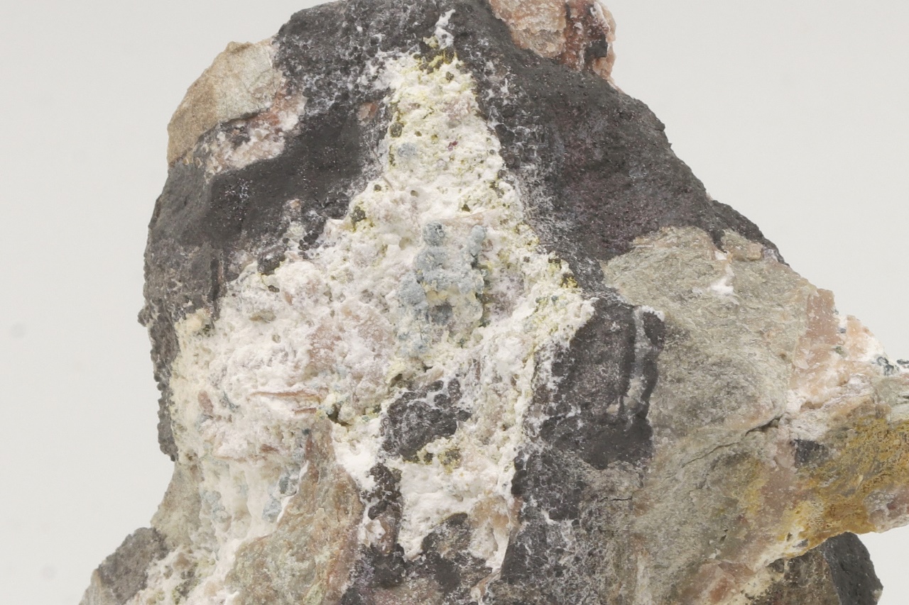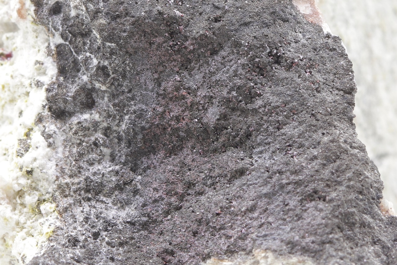 Schwarzer gediegener Arsen durchzogen mit roten Proustit-Kristallen und grünen Kügelchen von sekundärem Parasymplesit bis zu 2 mm groß.