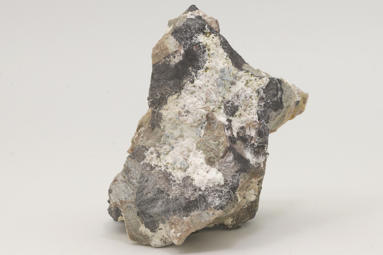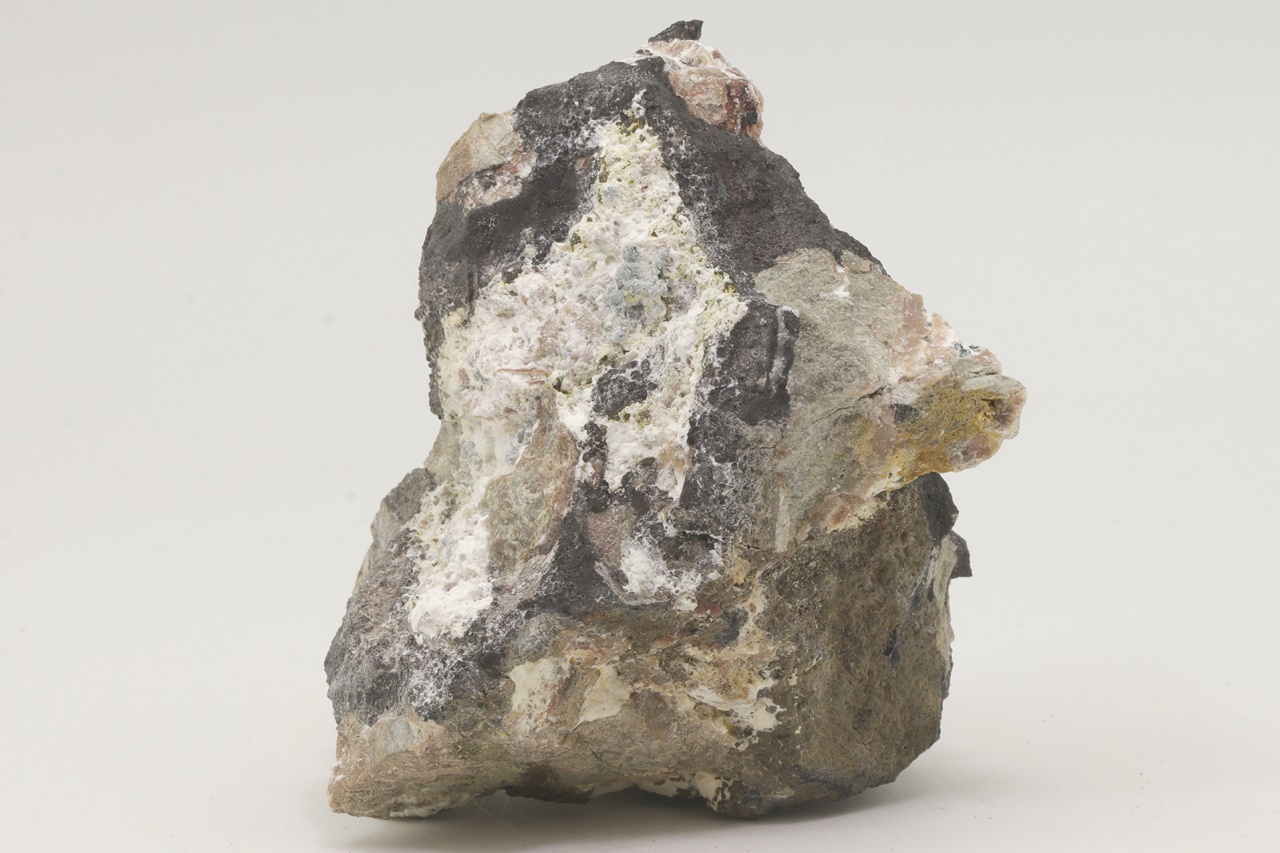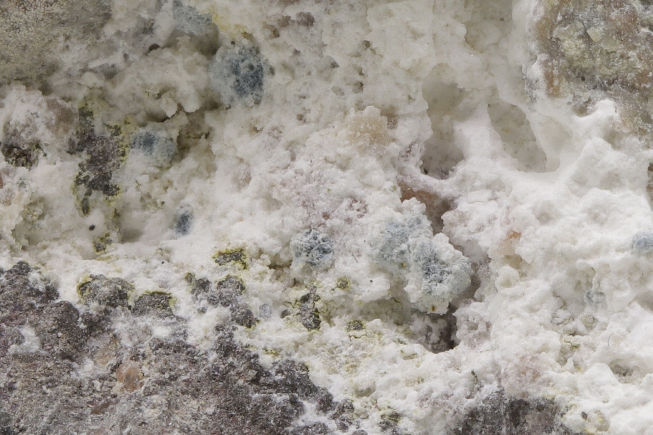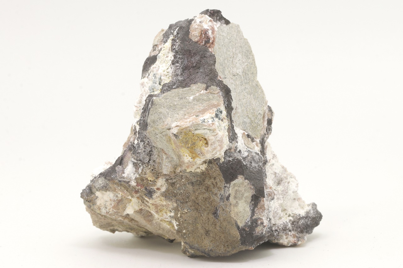 Schwarzer gediegener Arsen durchzogen mit roten Proustit-Kristallen und grünen Kügelchen von sekundärem Parasymplesit bis zu 2 mm groß.