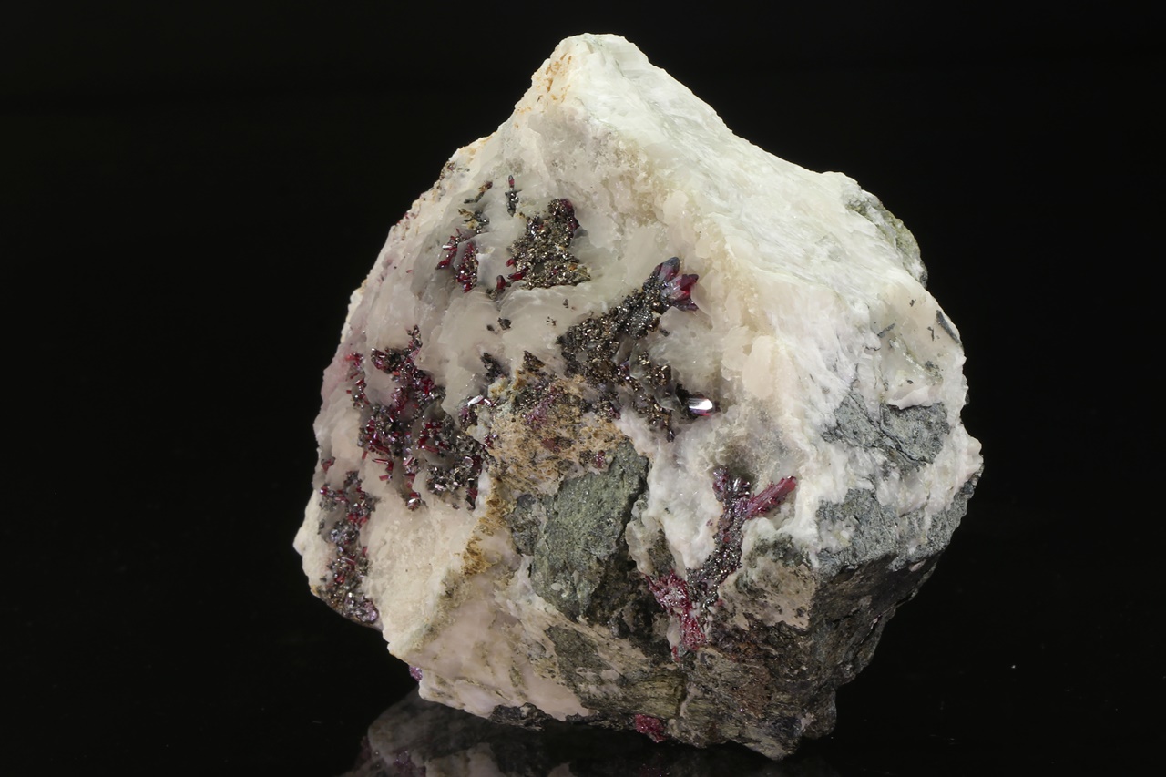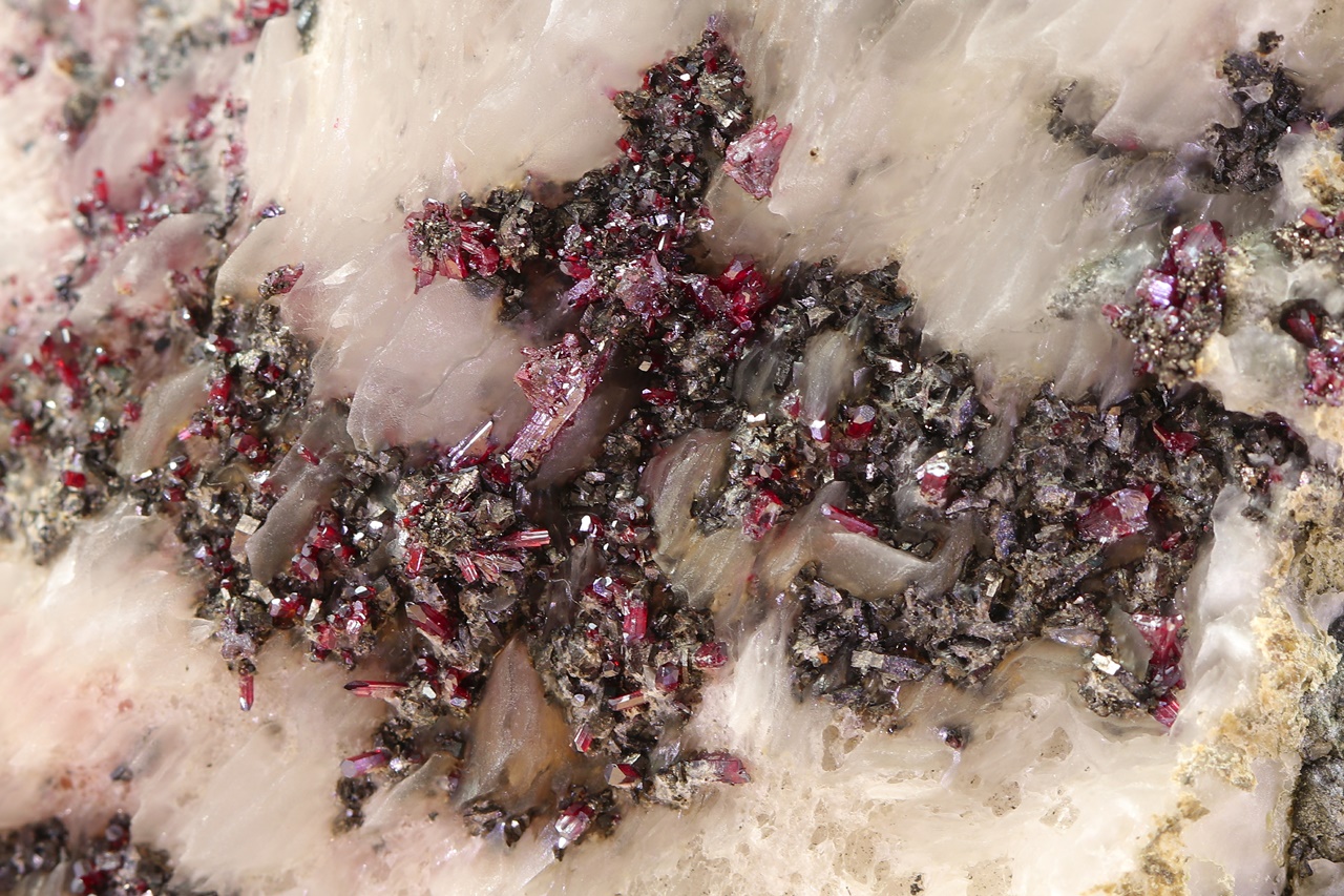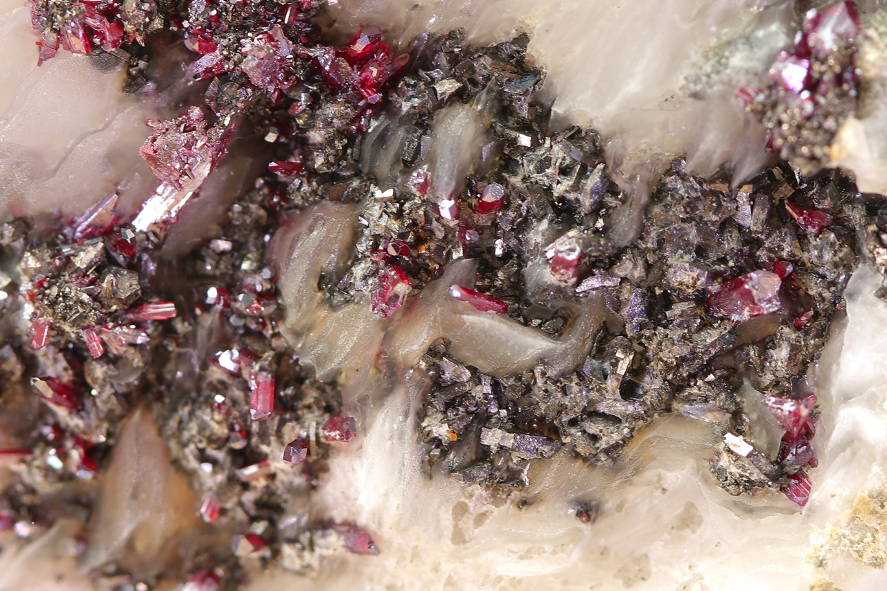 Muzejní ukázka, z Maroka dosud nepopsaných, krystalů argentopyritu obrůstajících sytě rudý proustit. Typické hexagonální krystaly argentopyritu s pestrými náběhovými barvami jsou až 1,5 mm velké, největší krystal proustitu je 8 mm velký.