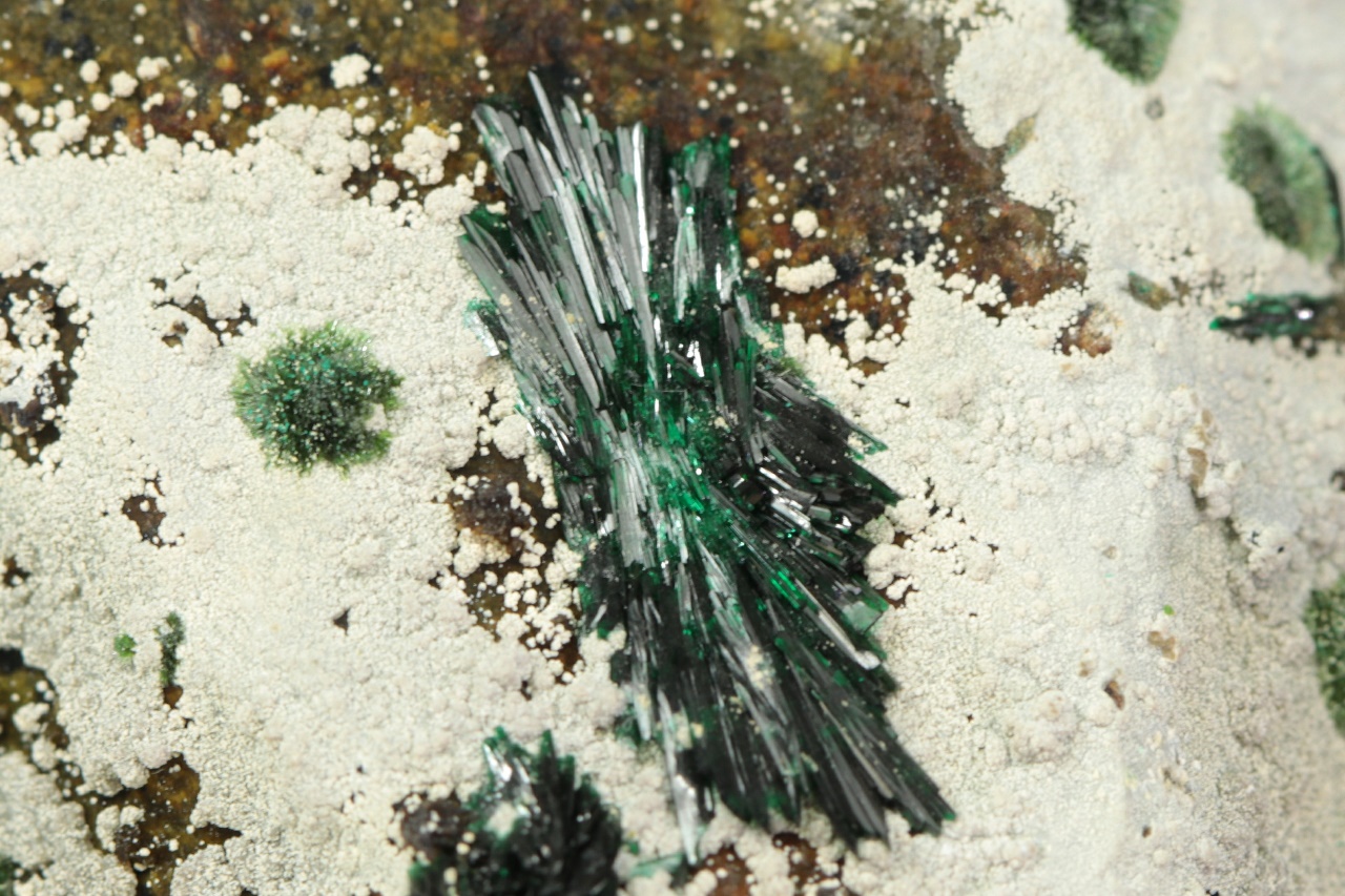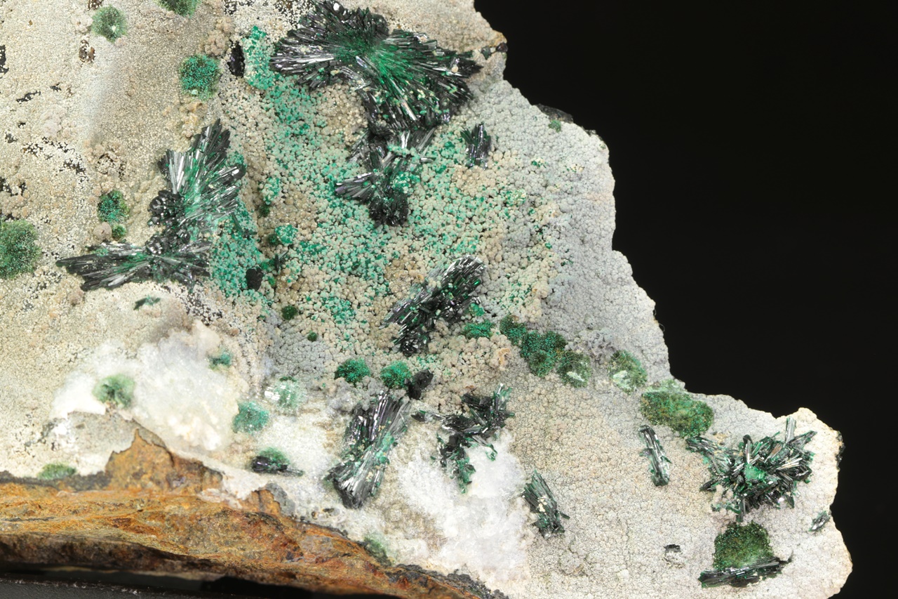 Ein ästhetisches Muster von intensiv grünen Atakamit-Kristallen, die attraktive „Blüten“ bilden.