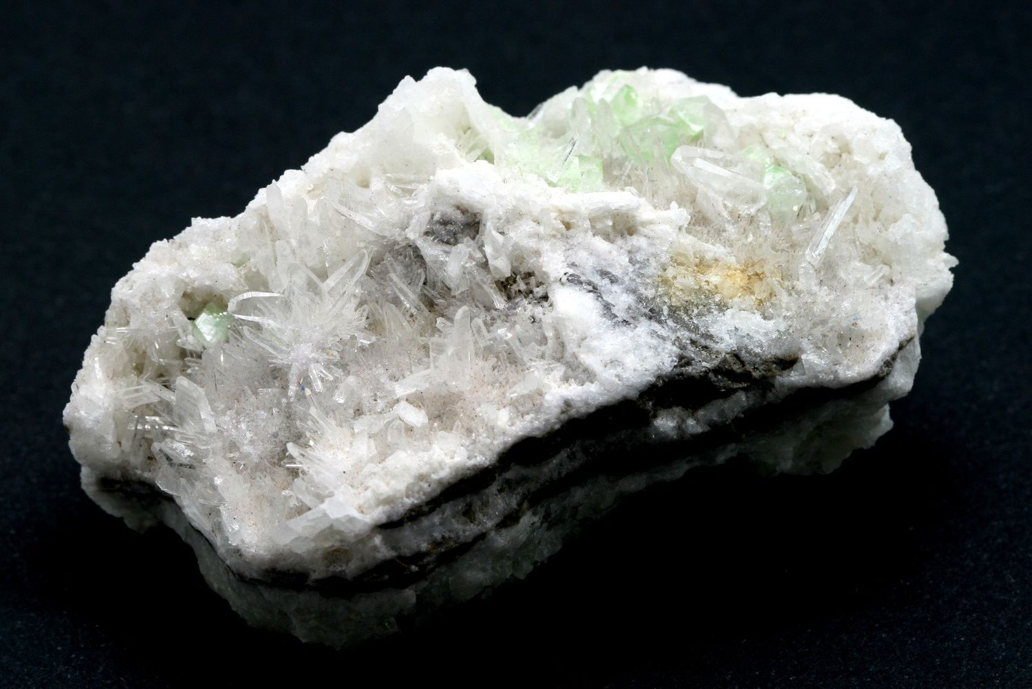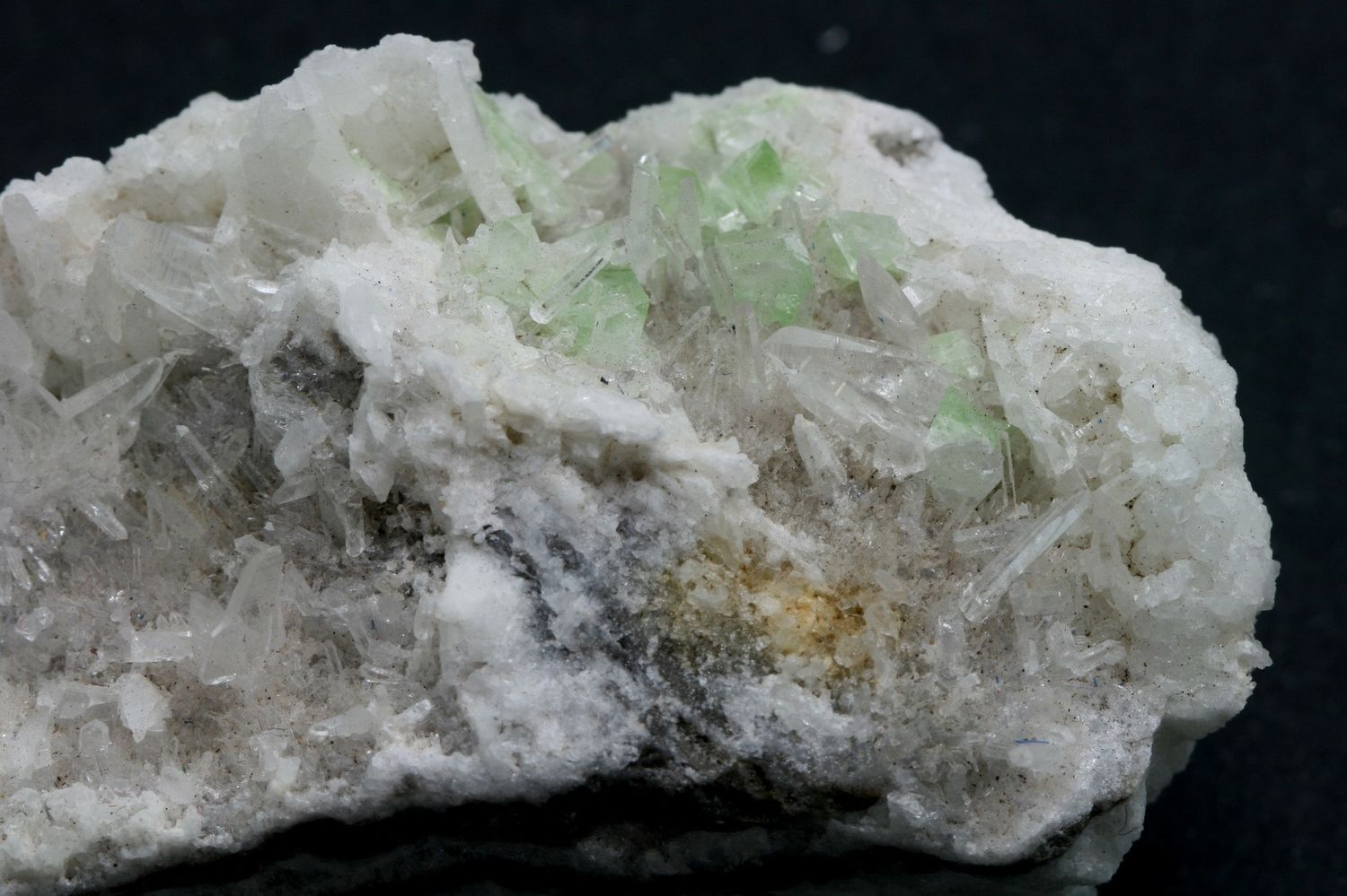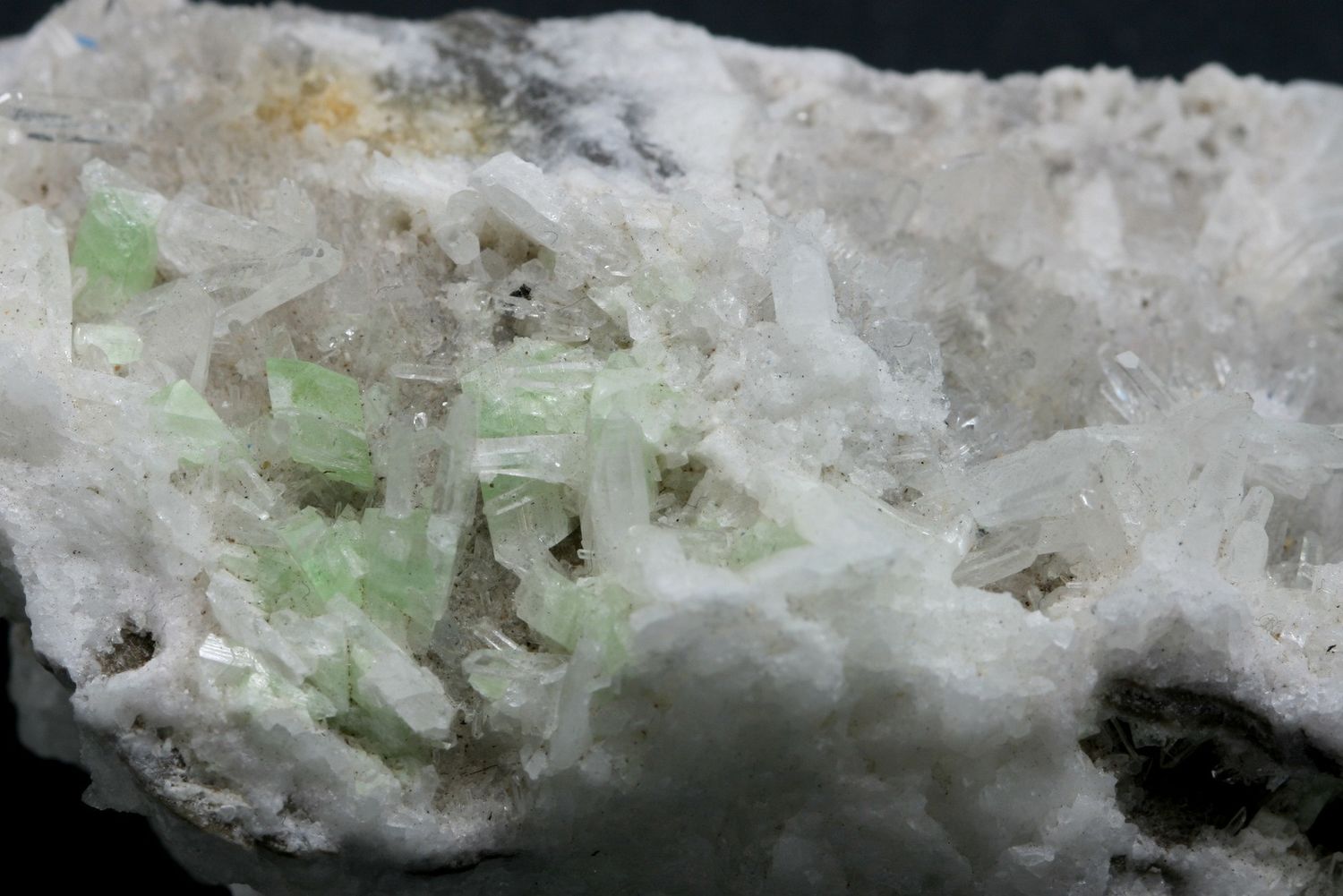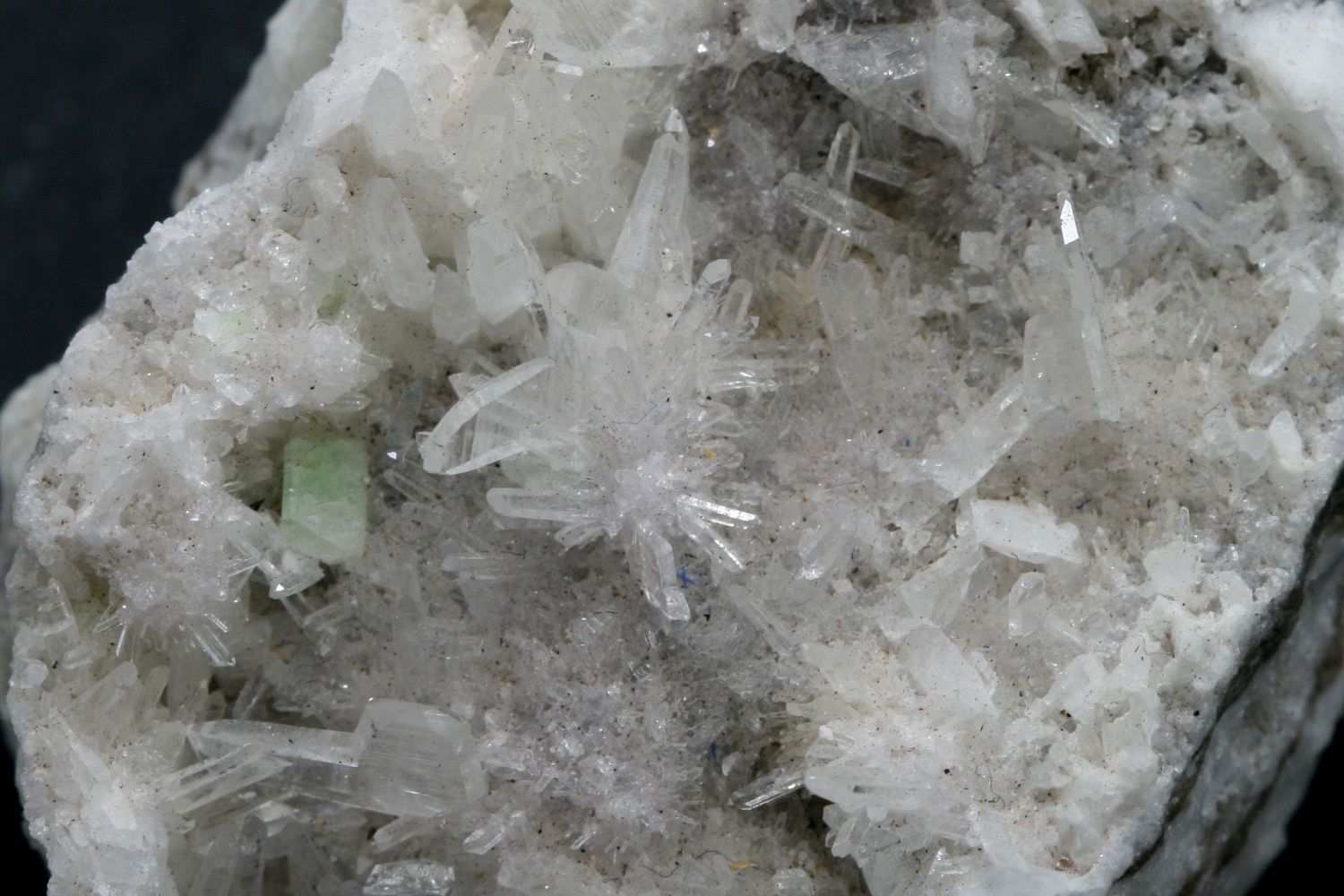 Grüne glänzende Augelit-Kristalle, gewachsen auf Bergkristall-Kristalle.