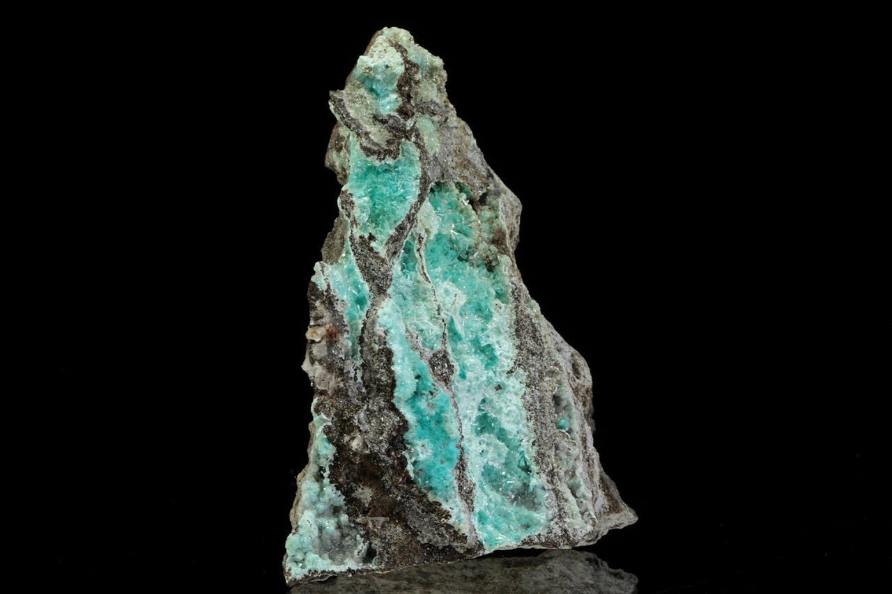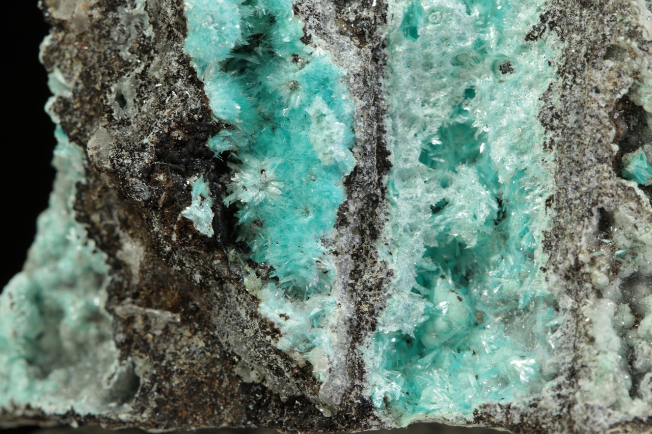 Zunahme nadelförmiger Aggregate aus türkisblauem Aurichalcit in den Höhlungen von grauem Smithsonit .