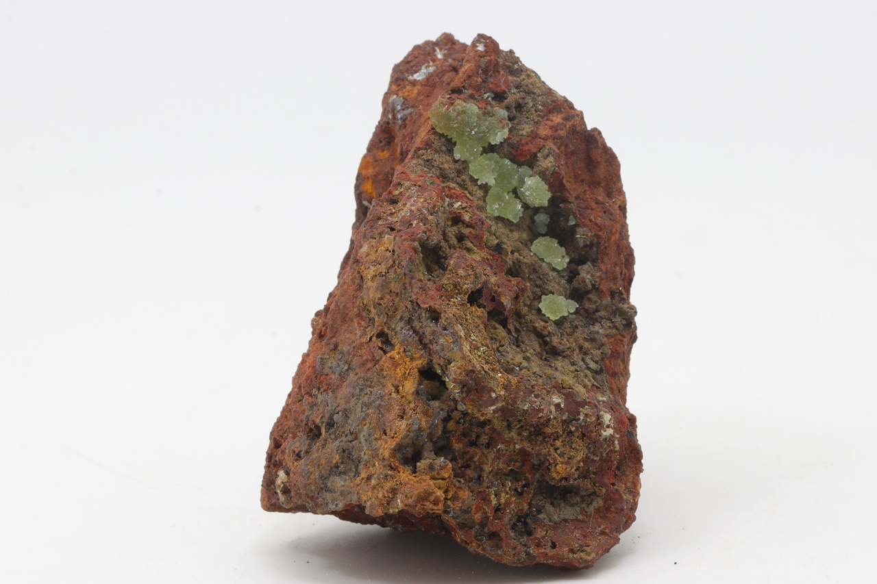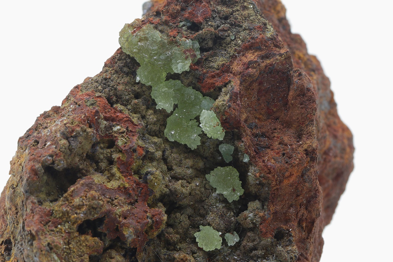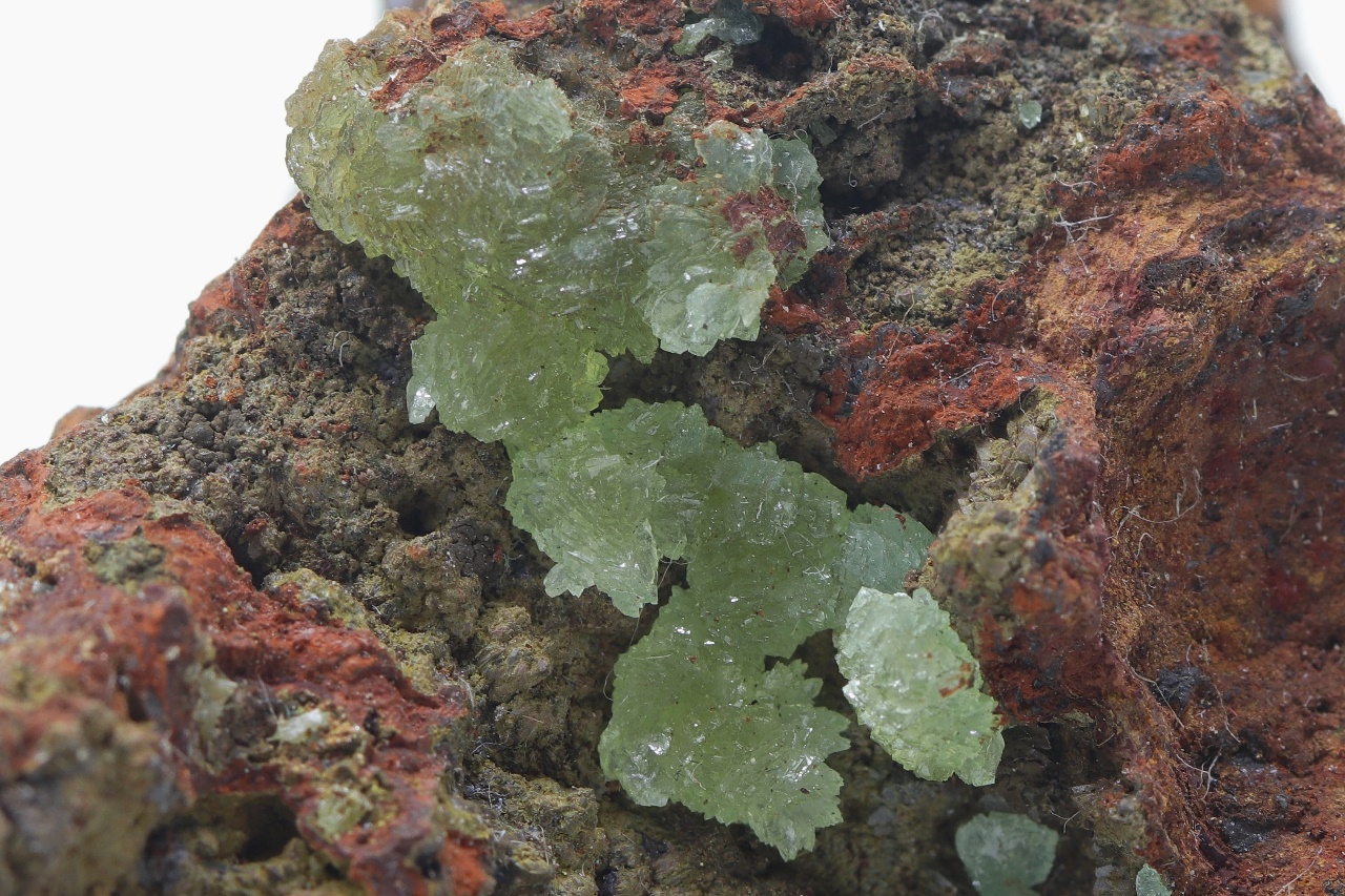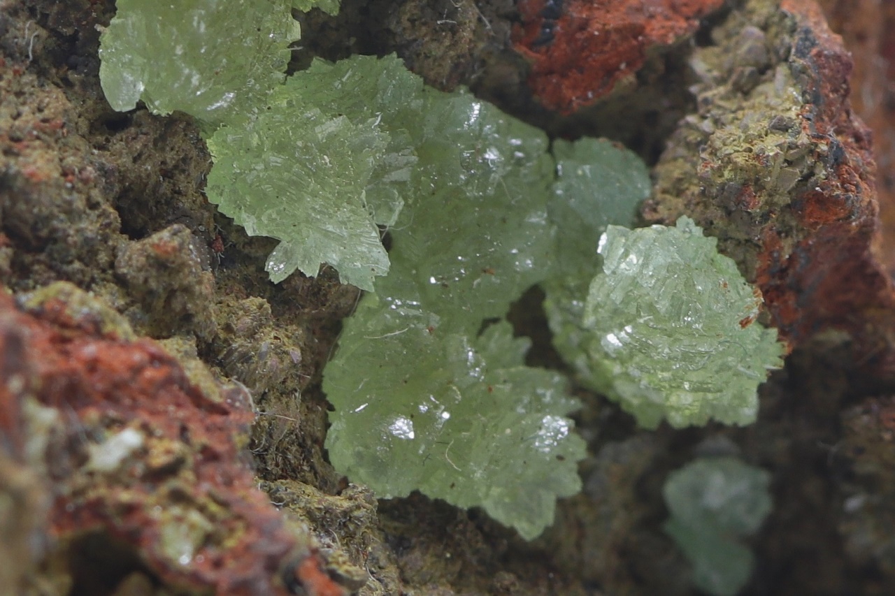 Kugelige Aggregate aus hellgrünem Calcium-Zink-Arsenat. Das größte Aggregat ist 5 mm groß.