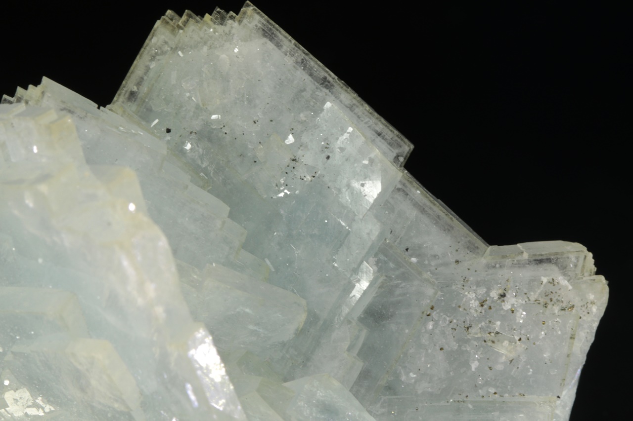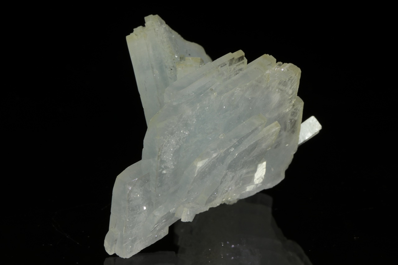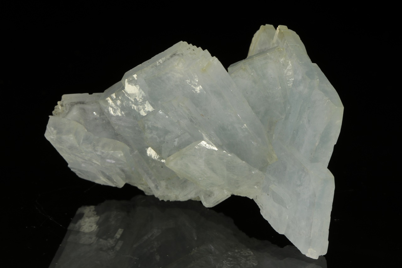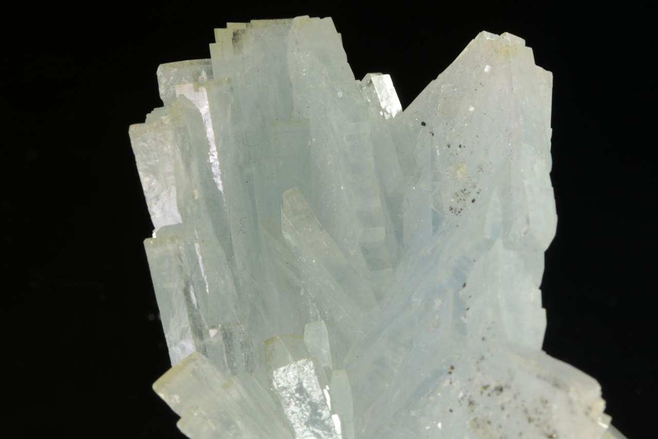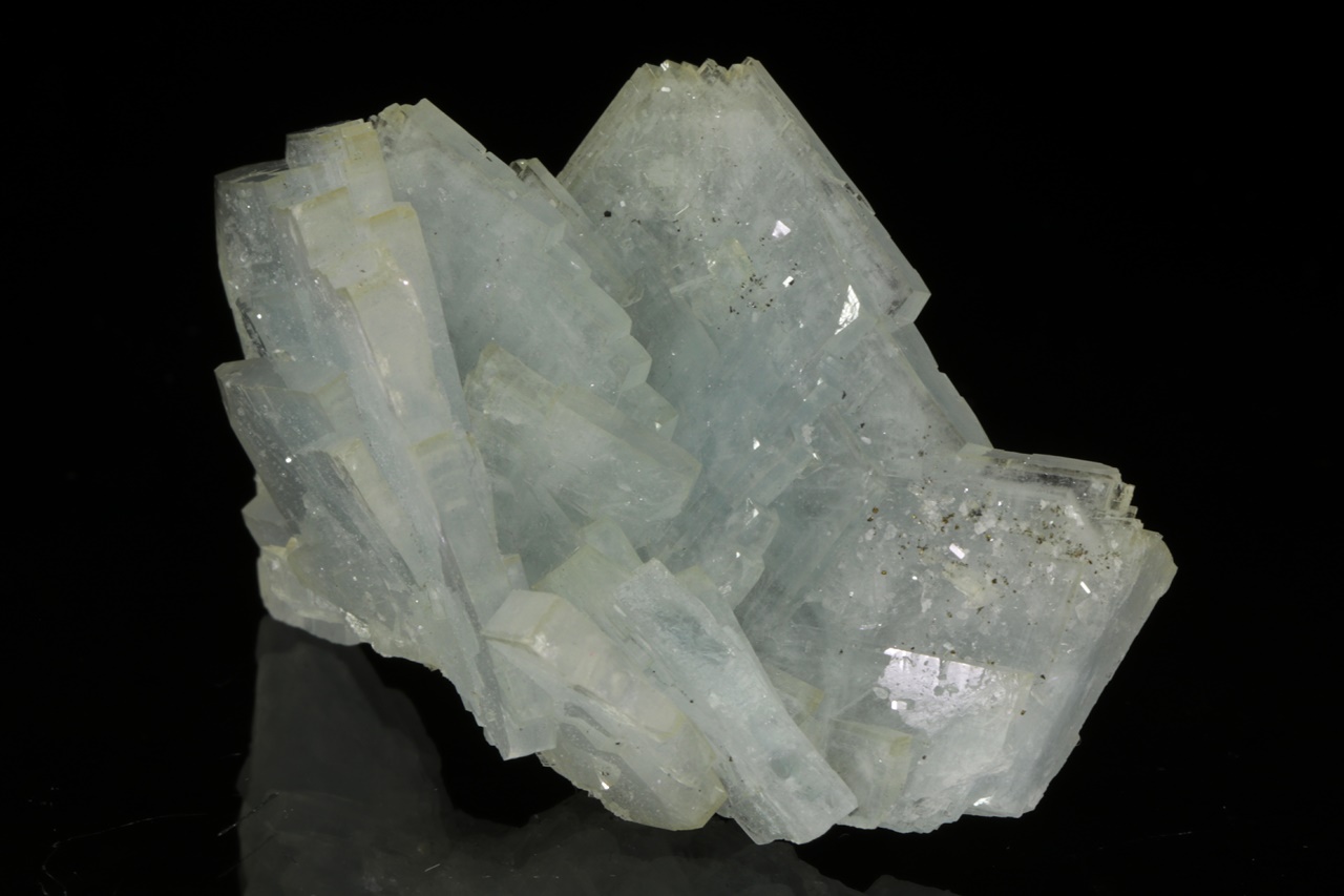 Cluster von tafelförmigen glänzenden Barytkristallen in hellblauer Farbe bis zu 3 cm groß .