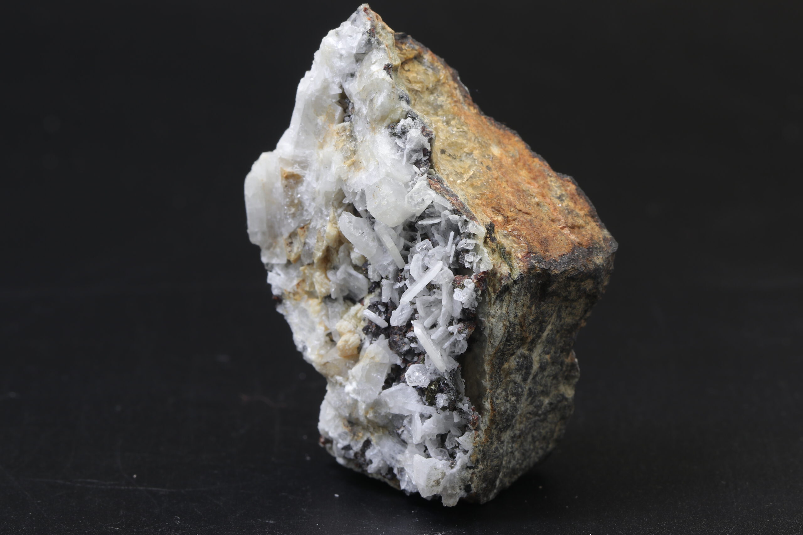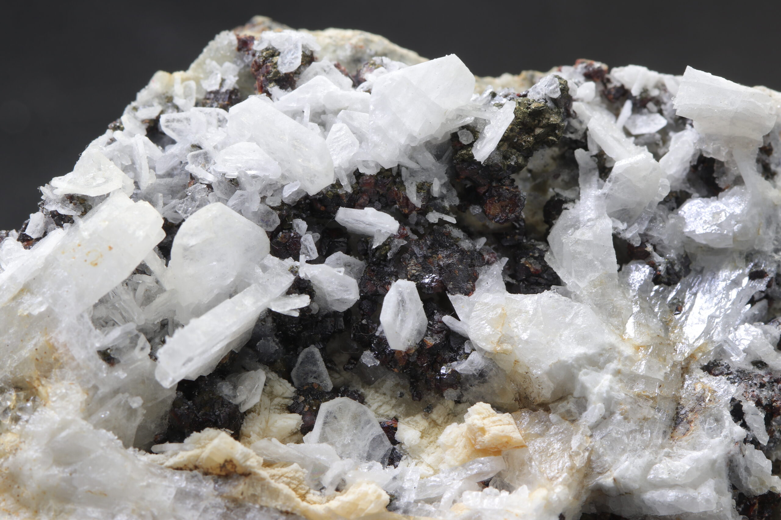 Schöner halbtransparenter, farblich zonaler Baryt aus der Grube Lill in Příbram mit Sfalerit, aus Kalcit-Gangart herausgeätzt.