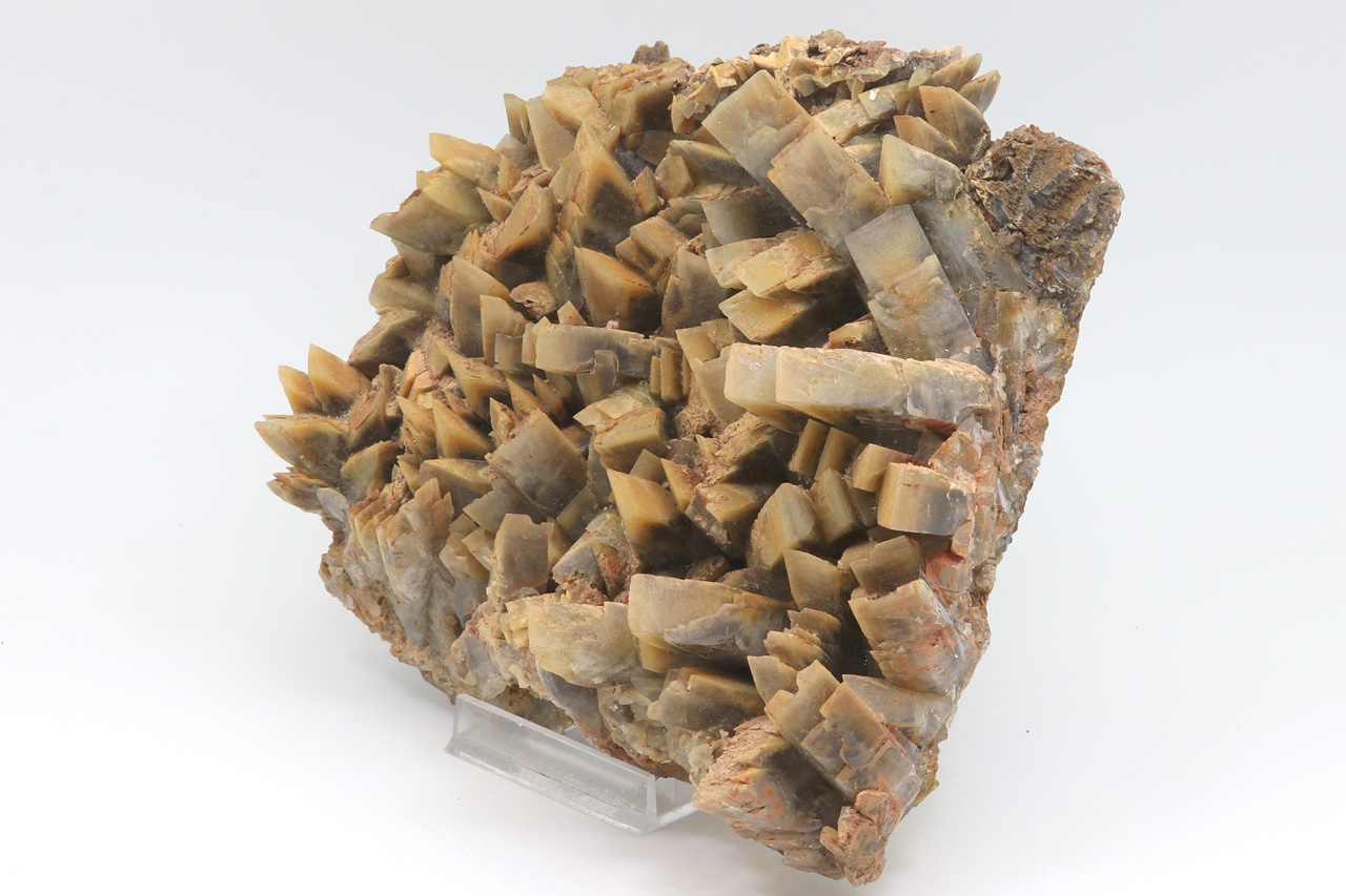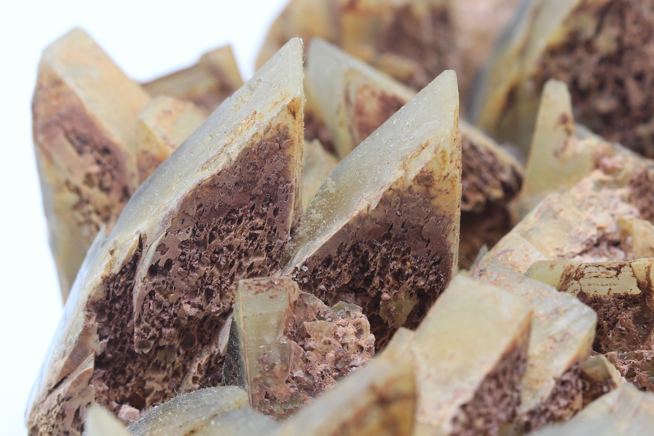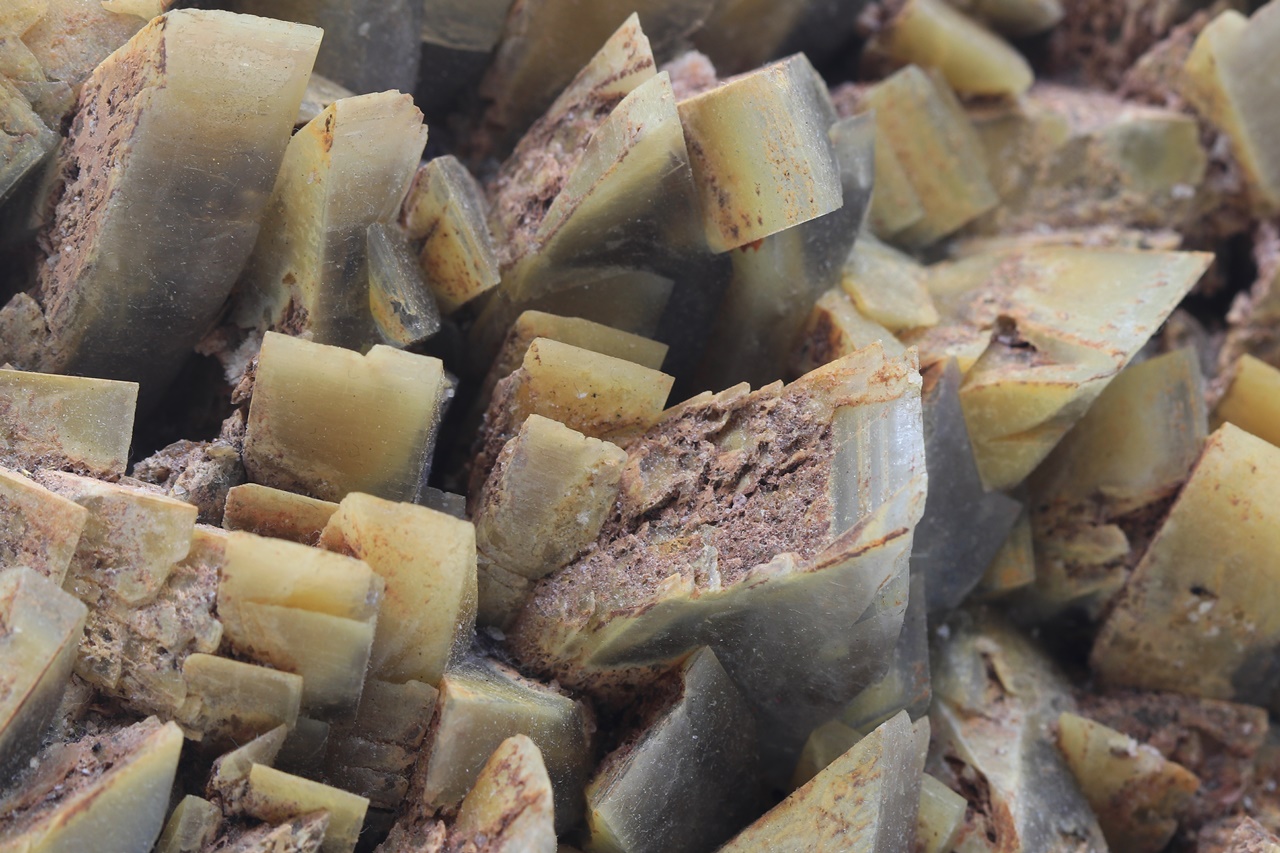 Große Druse am Rand von beigefarbenen, in der Mitte dunklen Baryt-Kristallen, die wegen ihrer für diesen Standort typischen meißelförmigen Form „Meißelspat“ genannt werden. Der größte Kristall ist 4 cm groß .