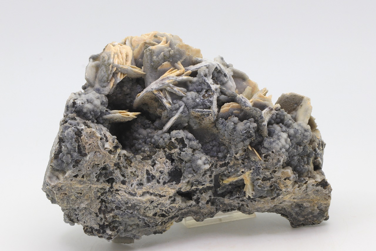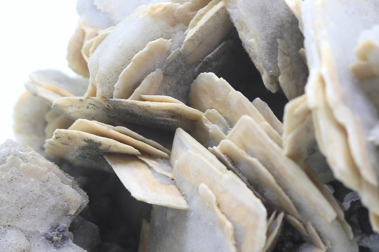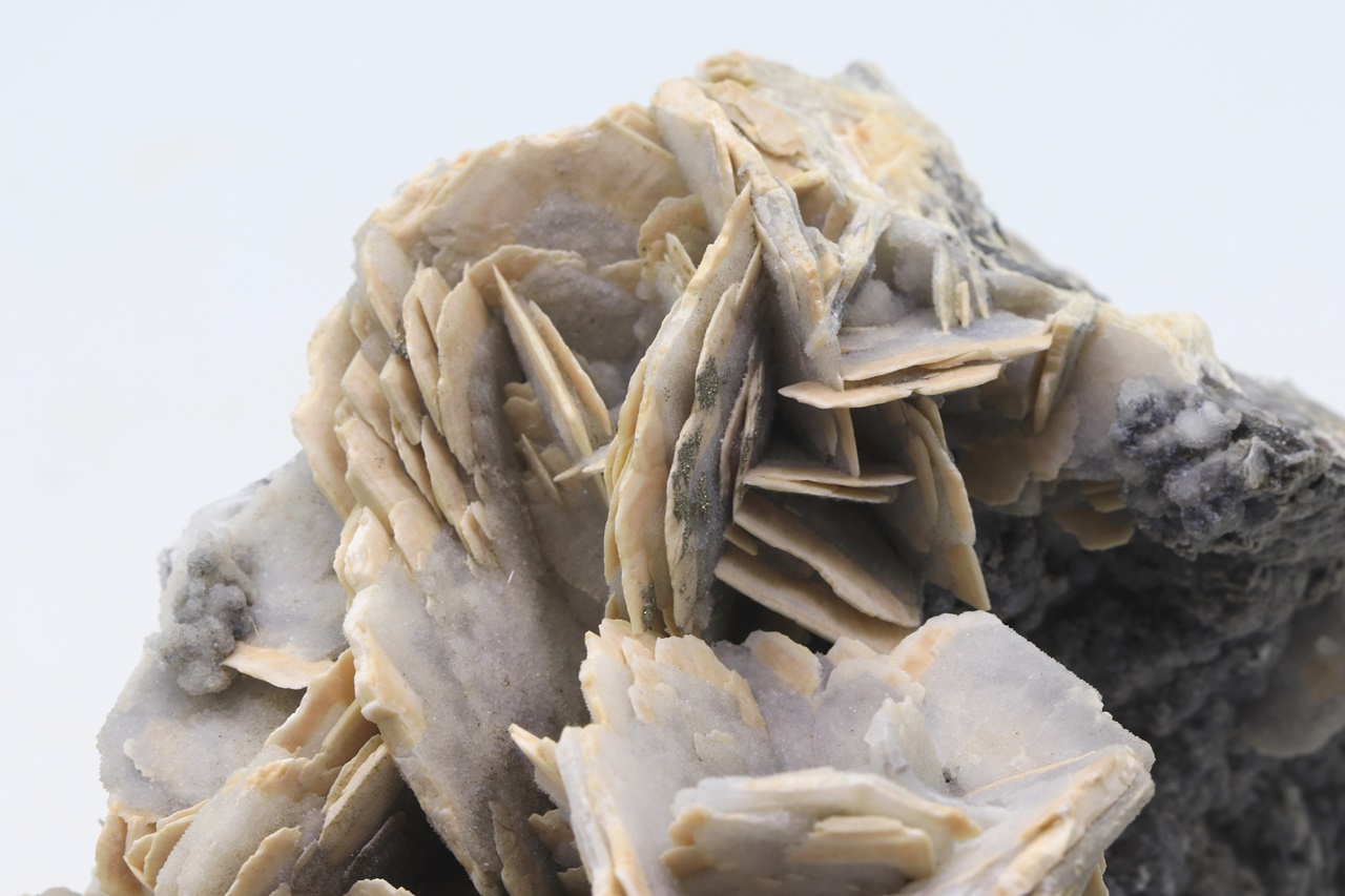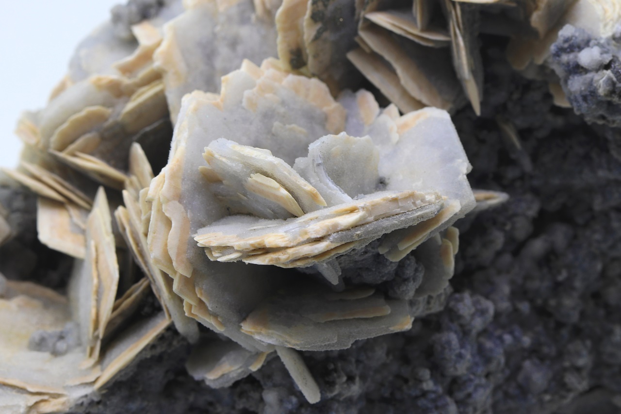 Ästhetischer Stufen aus Rosen, gebildet von tabularen Kristallen von hellem Baryt, gewachsen auf grauem feinkörnigem Křemen. Der größte Baryt-Kristall ist 4 cm groß.