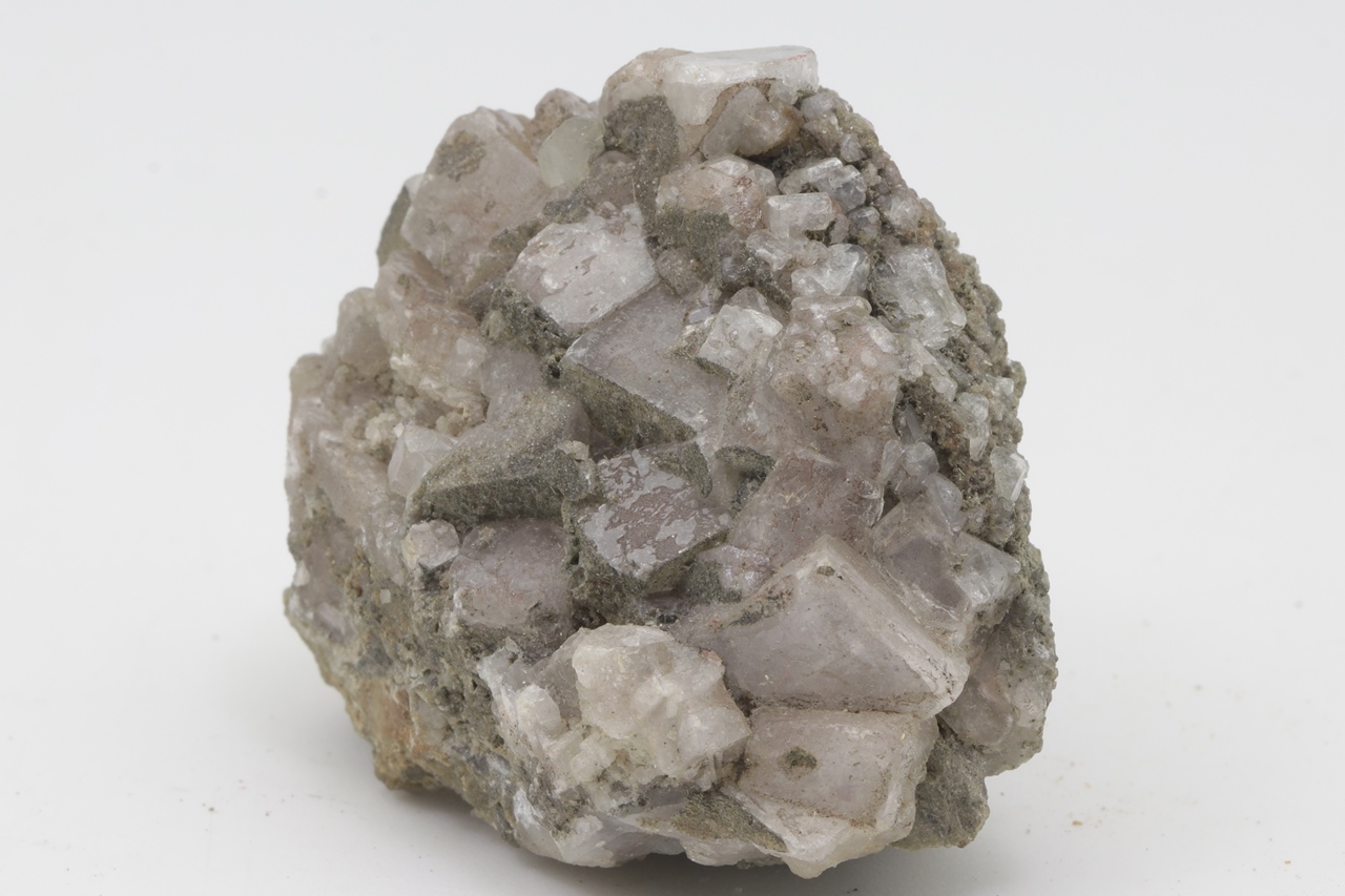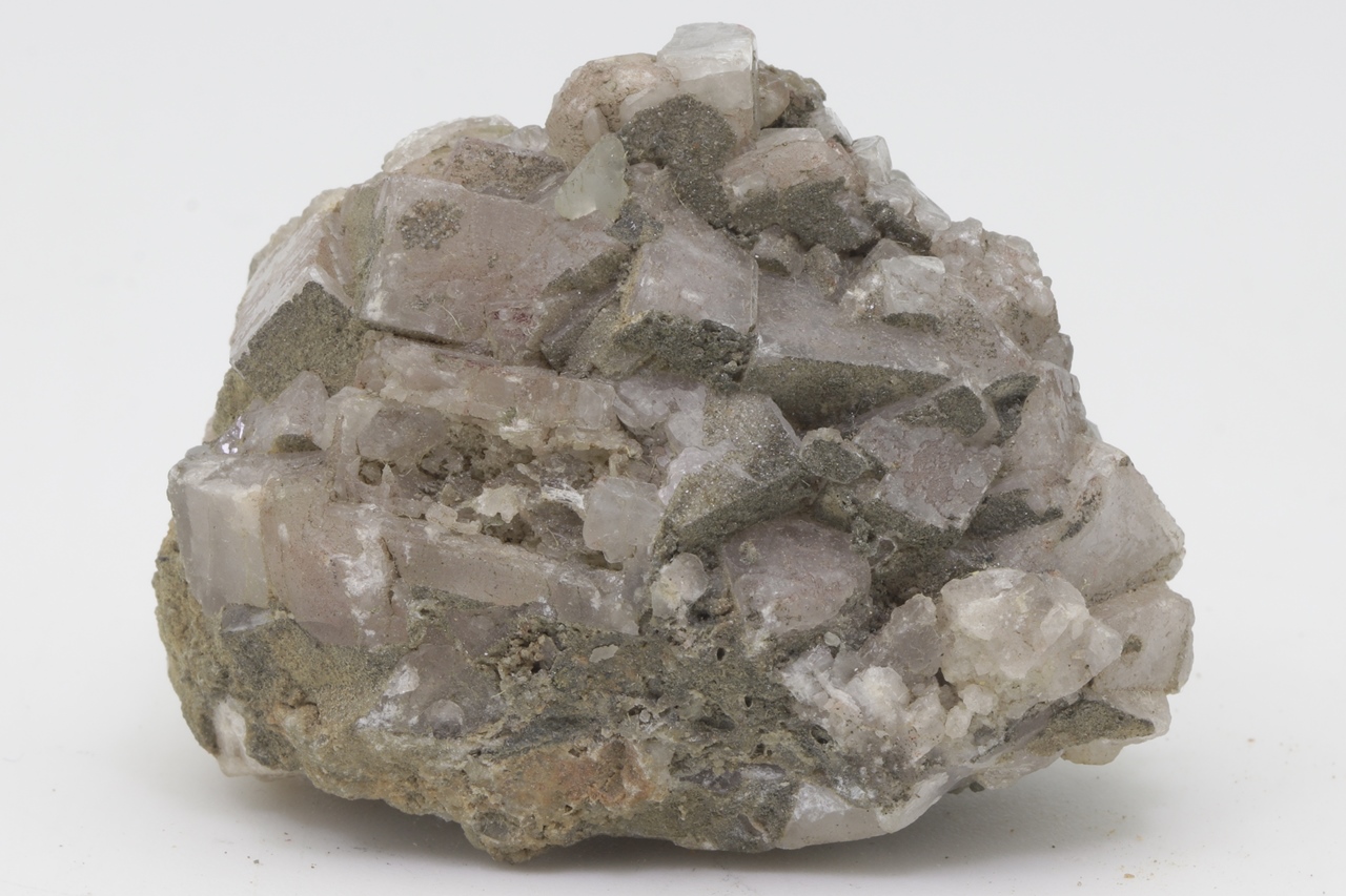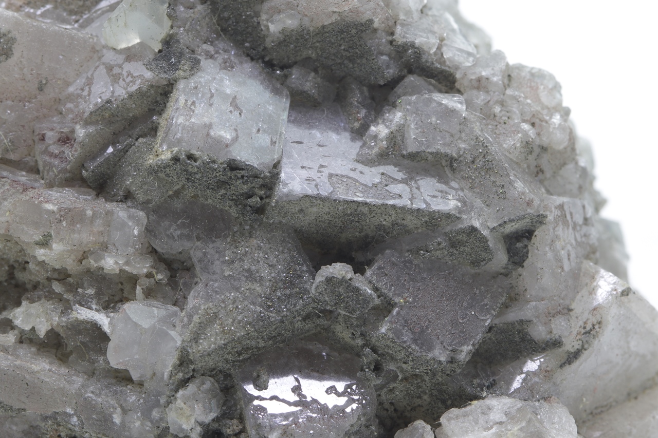 Druse von weißen, glänzenden Barytkristallen, die mit kleinem Pyrit verwachsen sind.