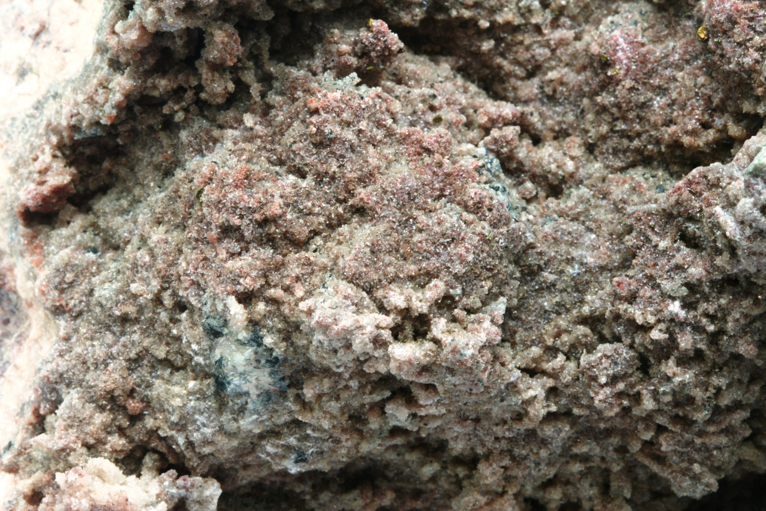 Massiver Baryt mit kleinen Kristallen und gelegentlichen Chalkopyrit-Kristallen .