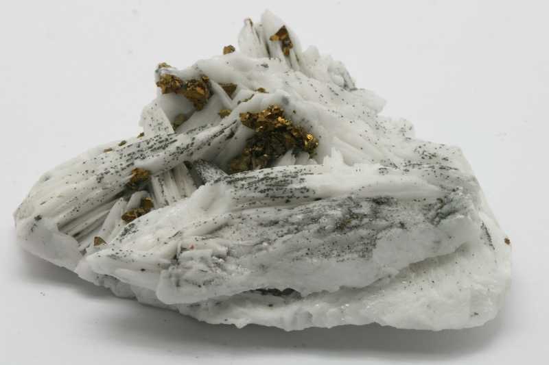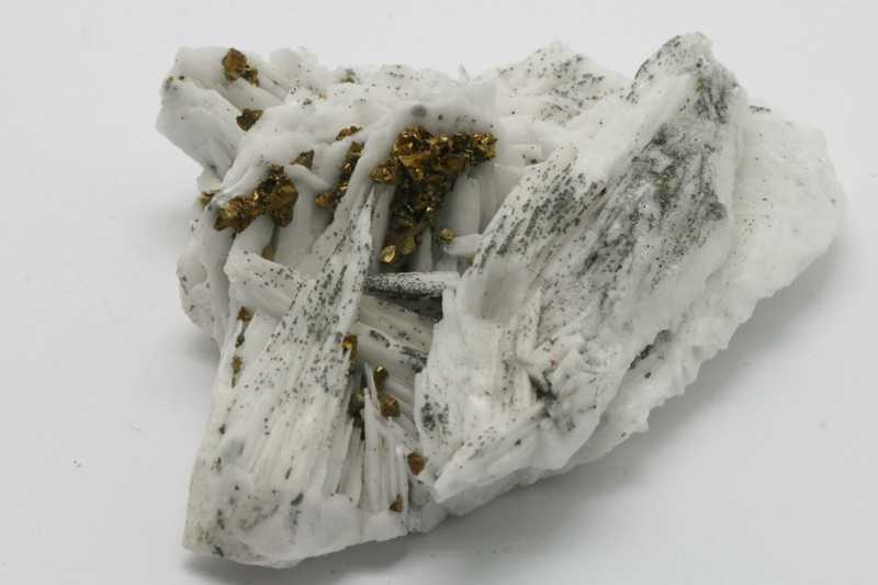 Gelber Chalkopyrit mit weißen Baryt-Leisten. 1 – 2 mm große Chalkopyritkristalle auf bis zu 3 cm großen Baryten.