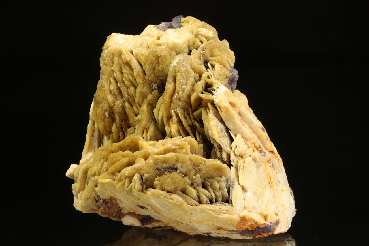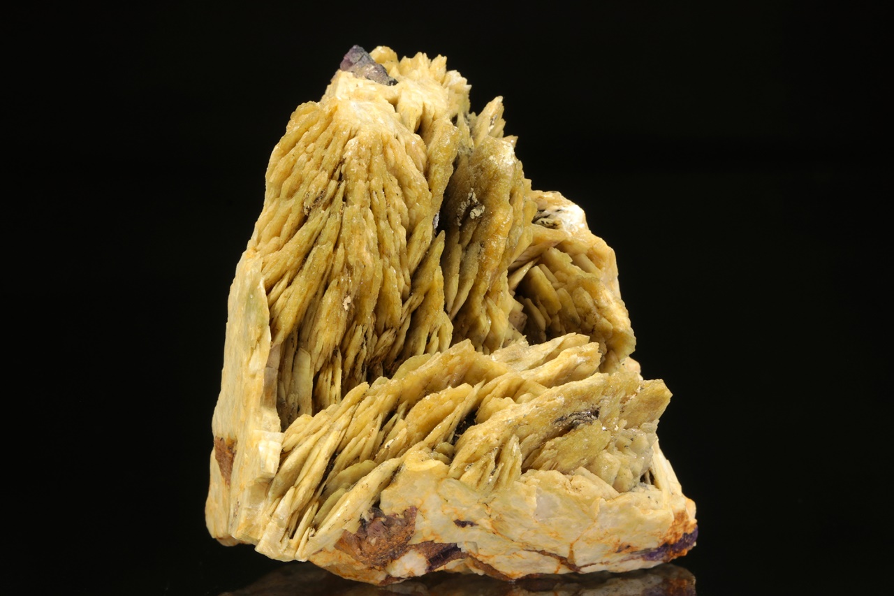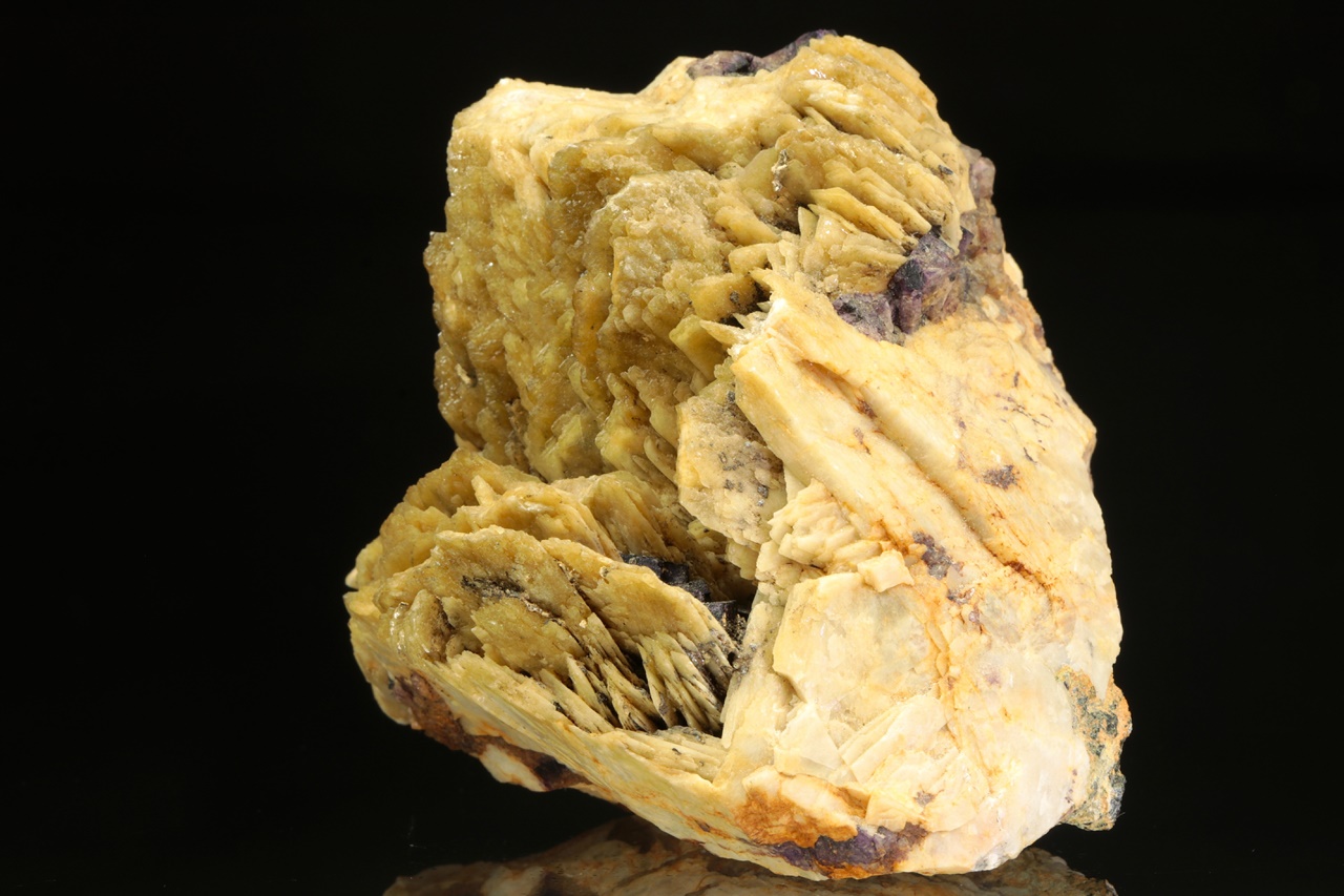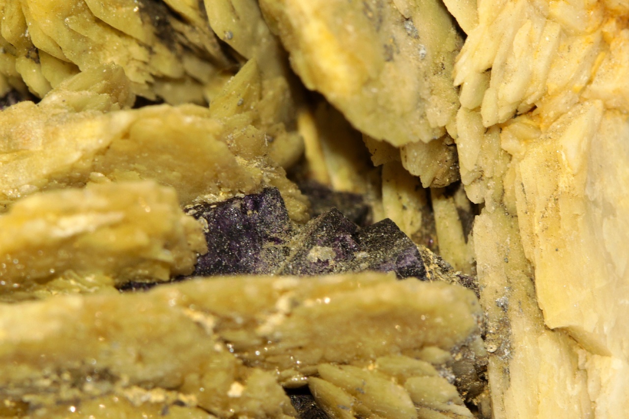 Tabulární krystaly okrového barytu prorůstající s fialovým fluoritem.