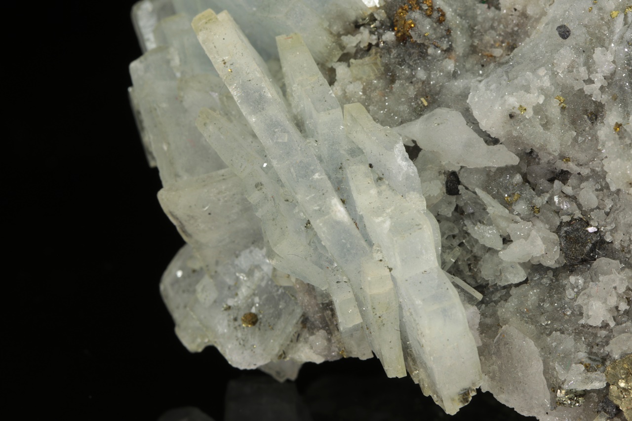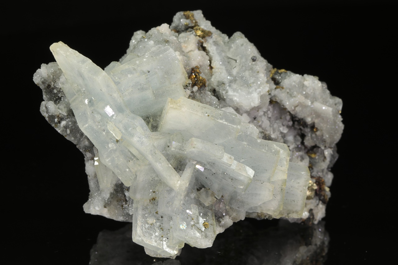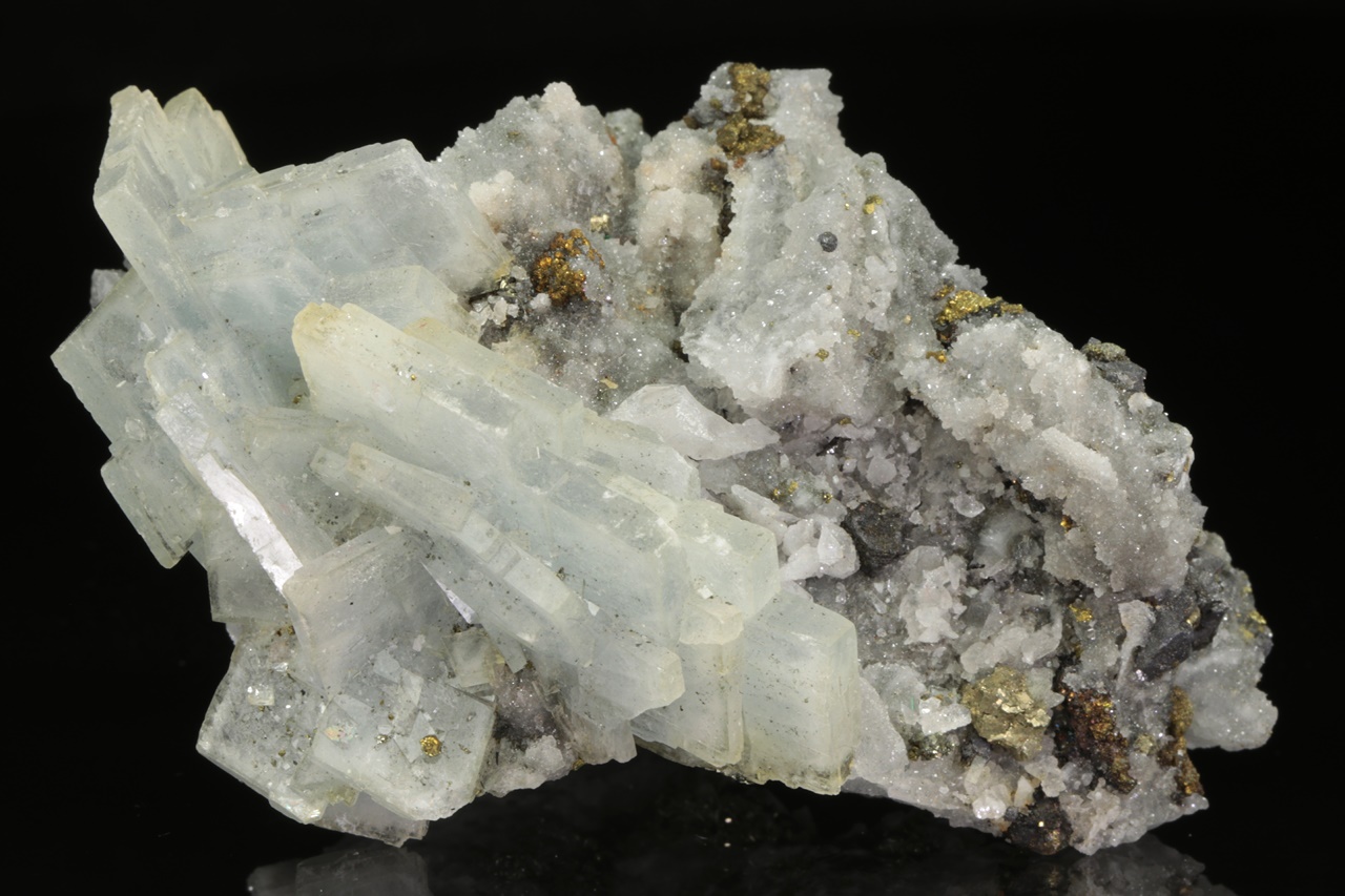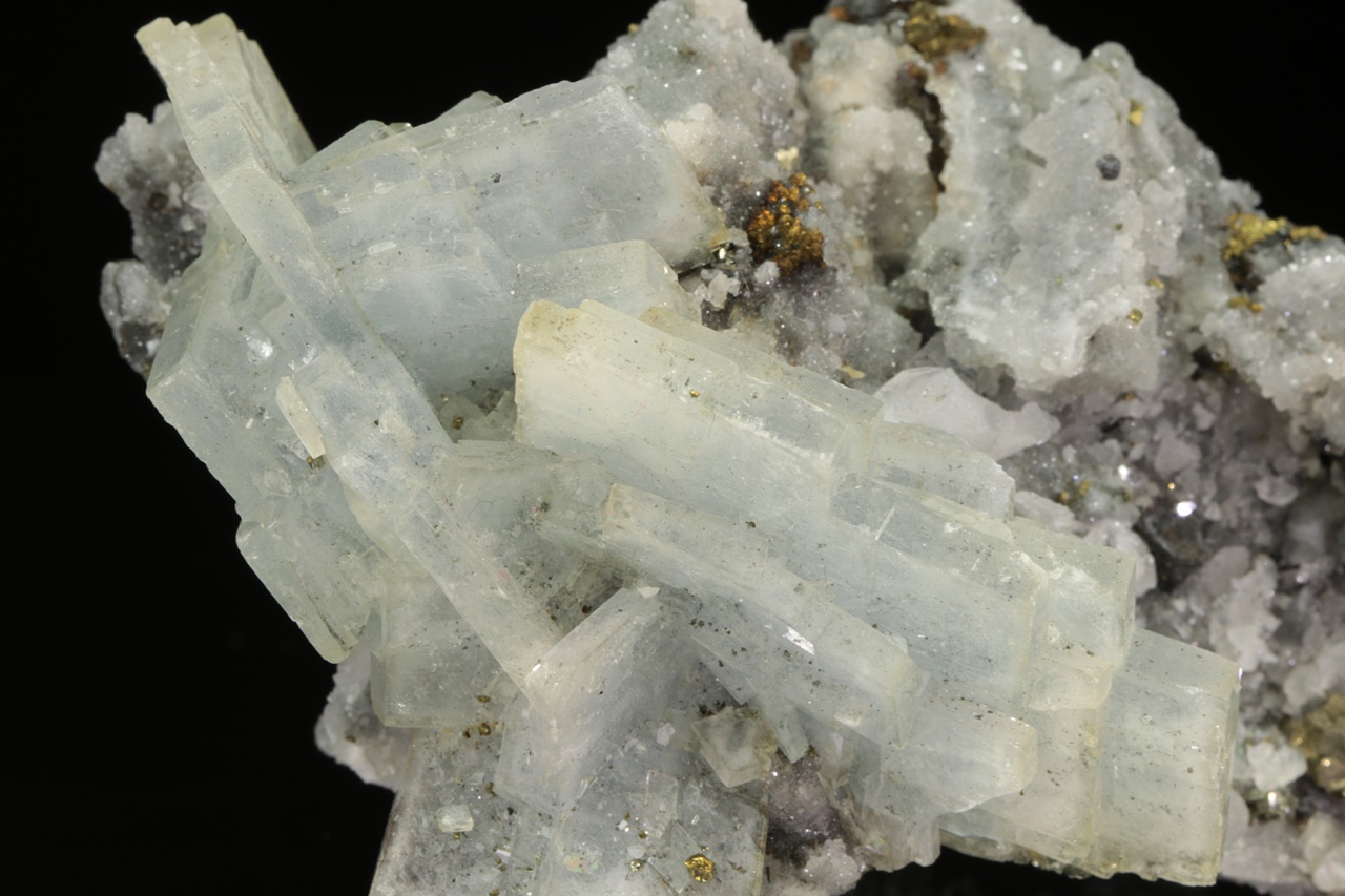 Ästhetische Probe von hellblauen, tafelförmigen Barytkristallen von bis zu 2,5 cm, begleitet von einem Cluster von Pyritkristallen und schwarzen, glänzenden Galenitkristallen von bis zu 5 mm Größe.