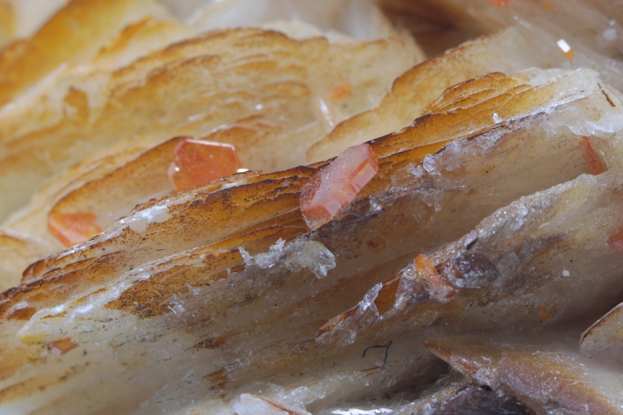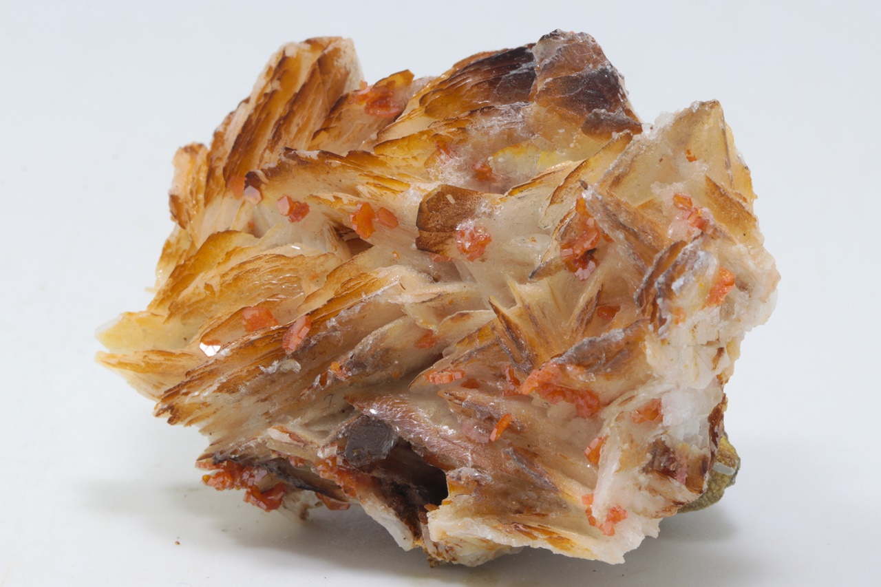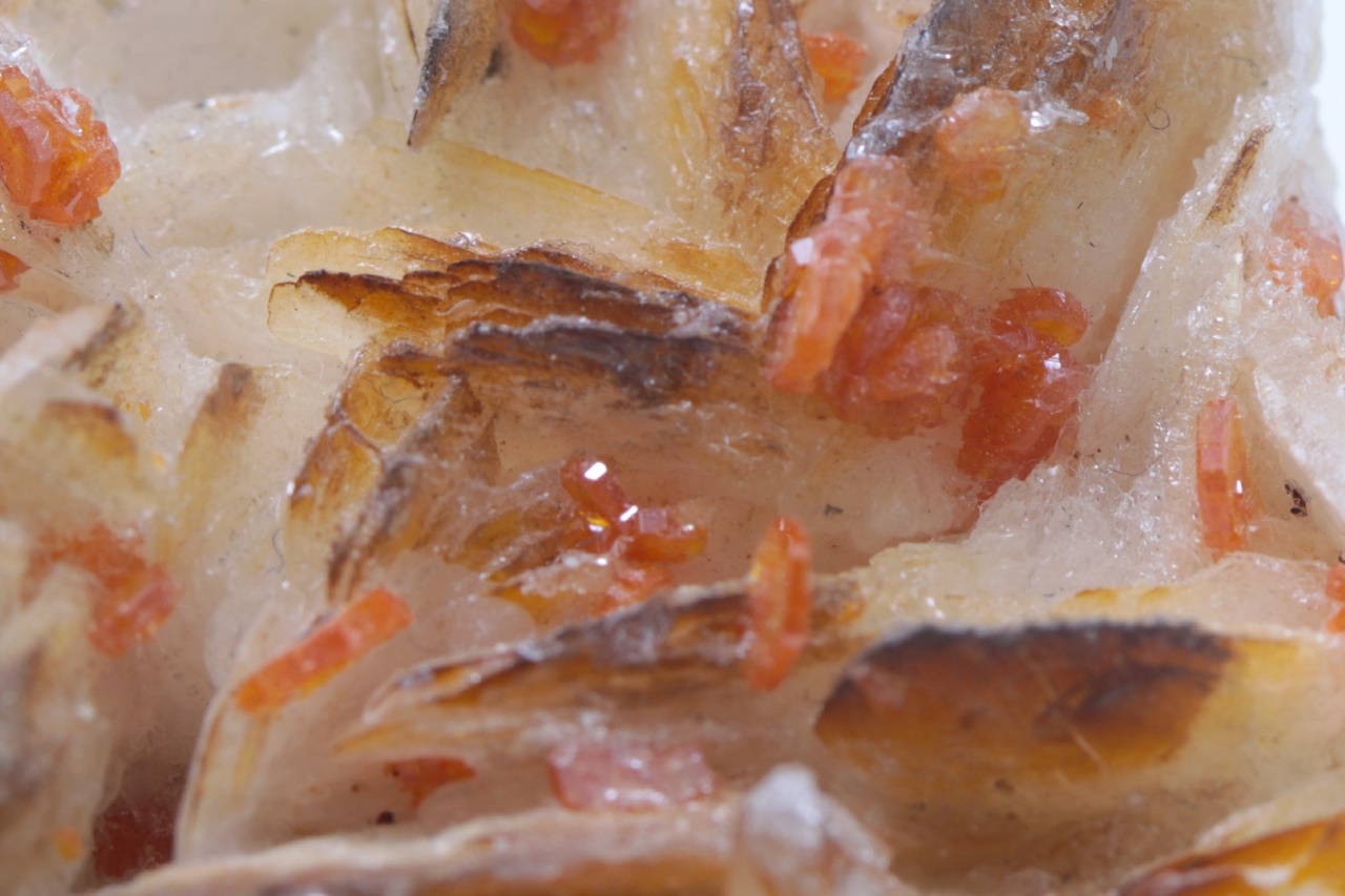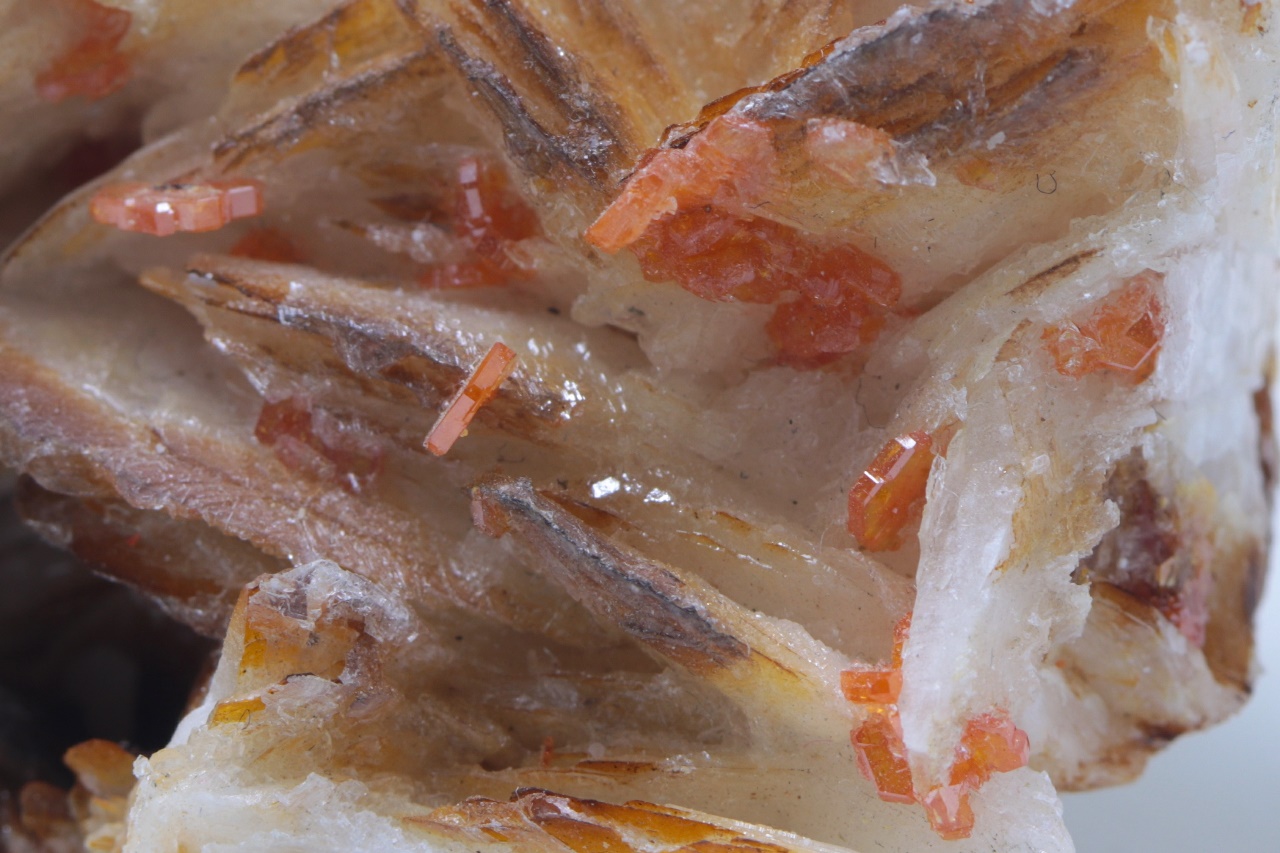 Tafelige Kristalle von weißem Baryt mit dunklen Rändern, bewachsen mit 3 mm großen glänzenden Kristallen von orangem Vanadinit.