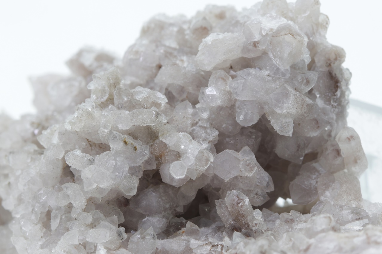 Ein Drusen von weißen bis leicht bräunlichen Quarzkristallen, etwa 6 mm groß, gesammelt im Jahr 1955.