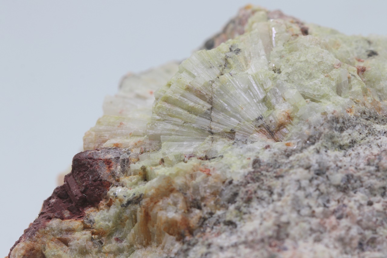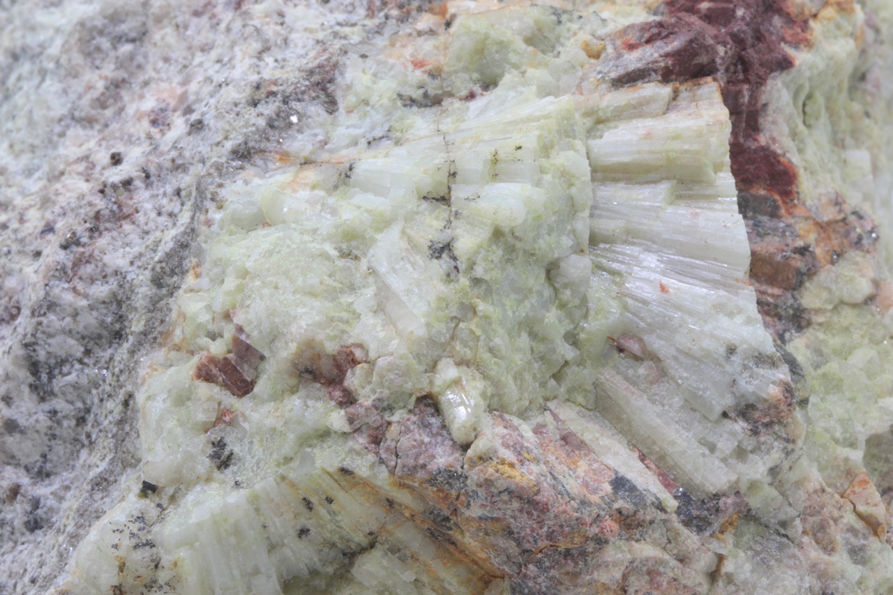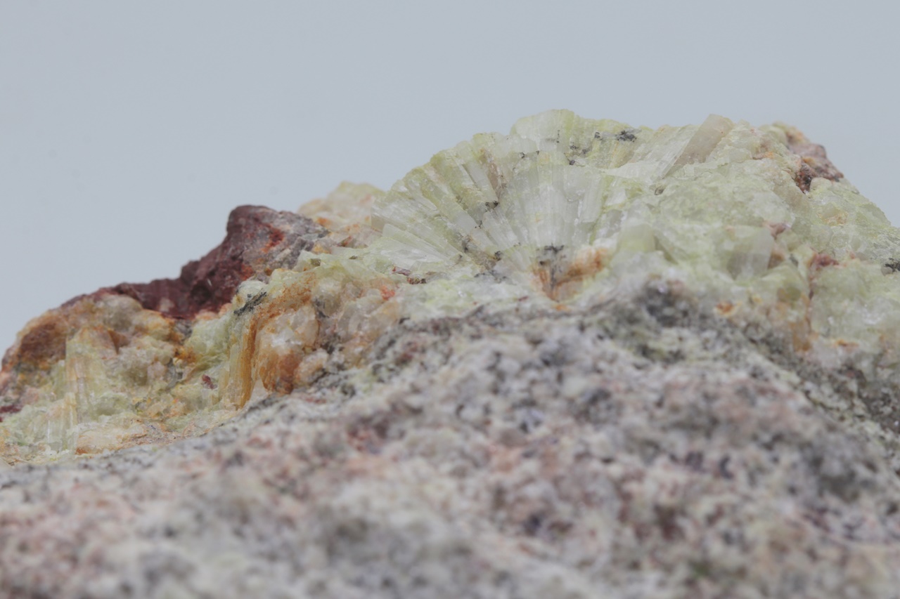Schönes Exemplar von unvollkommen kristallisiertem, grünlichem Beryll aus Krásno. An mehreren Stellen sind deutlich säulenförmige Beryll-Kristalle in fächerförmiger Anordnung dicht nebeneinander zu erkennen .