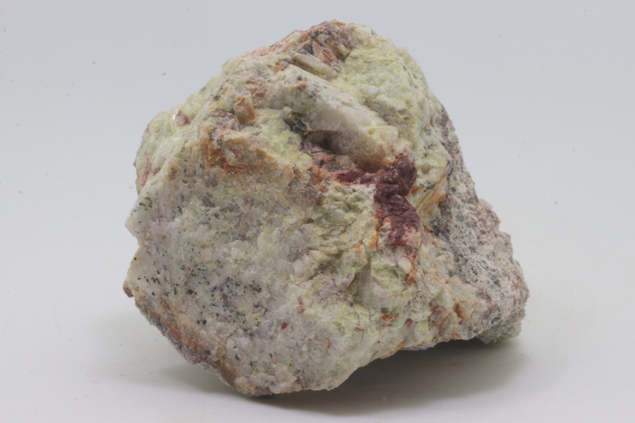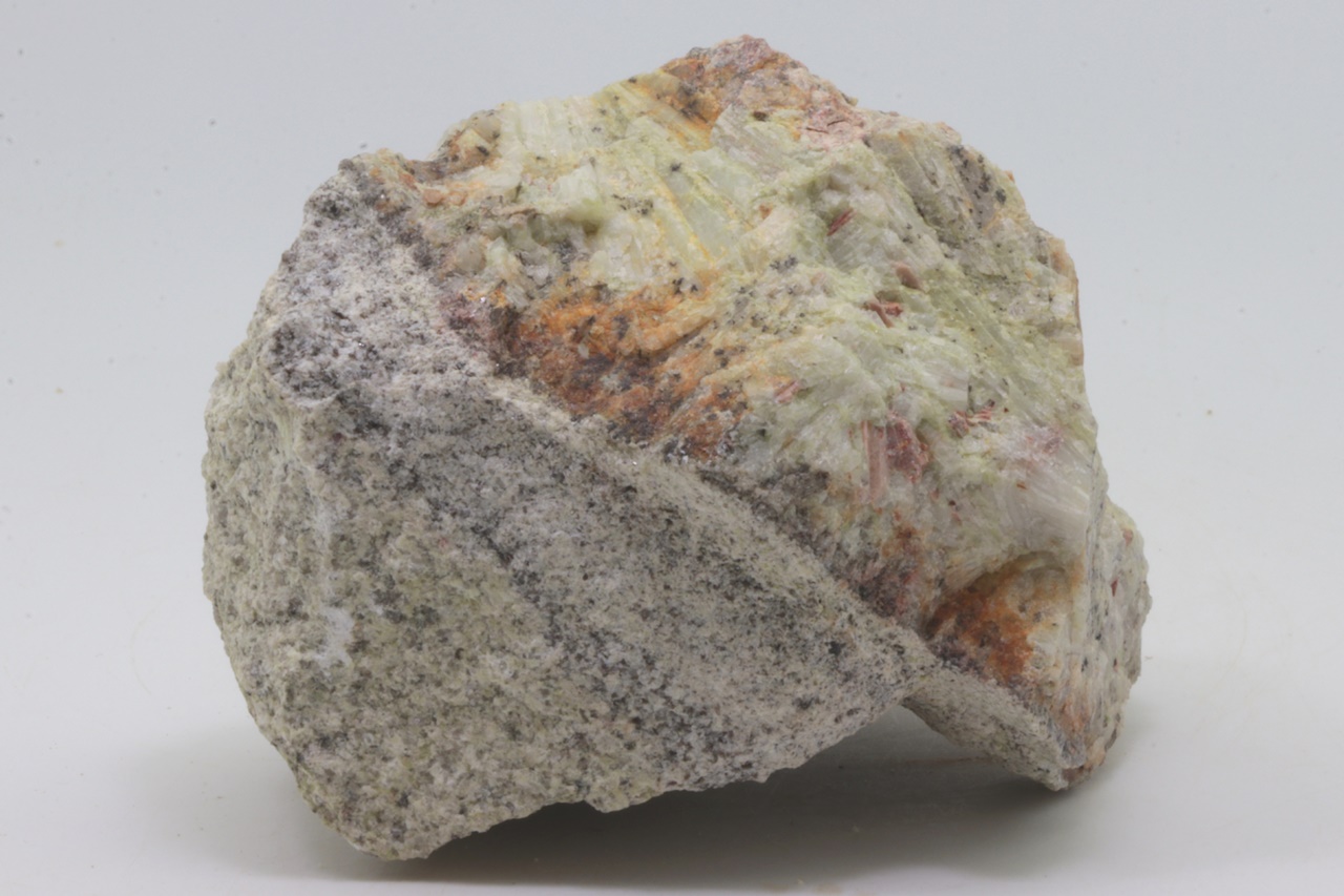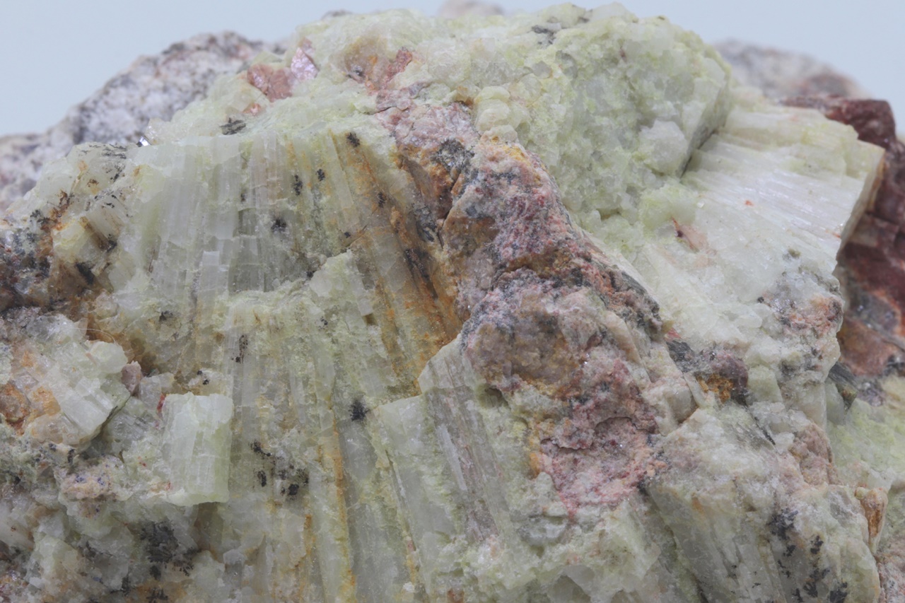 Schönes Exemplar von unvollkommen kristallisiertem, grünlichem Beryll aus Krásno. An mehreren Stellen sind deutlich säulenförmige Beryll-Kristalle in fächerförmiger Anordnung dicht nebeneinander zu erkennen .