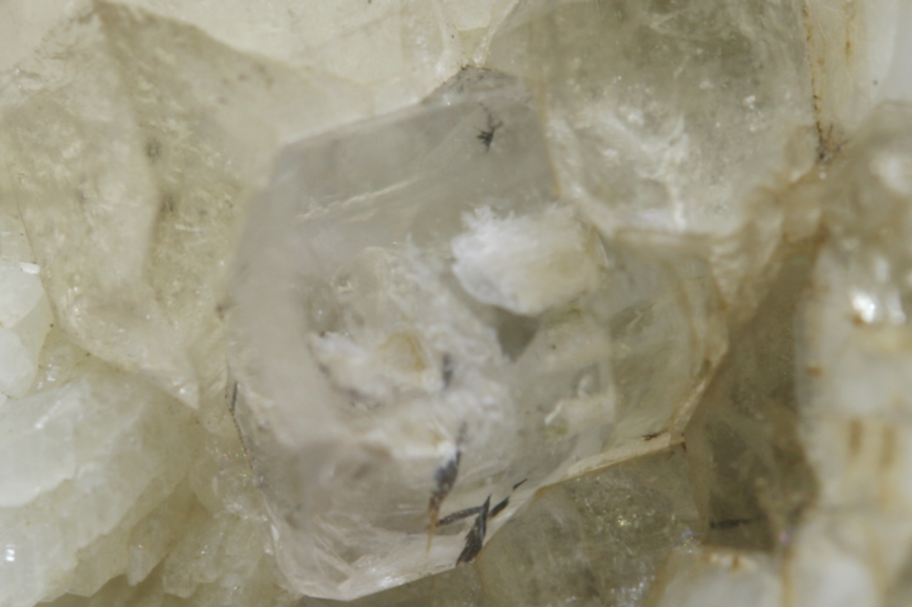 Kleiner, etwa 6 mm großer Kristall von klarem Beryll mit Kristallen von Quarz, aufgewachsen auf weißem Orthoklas.