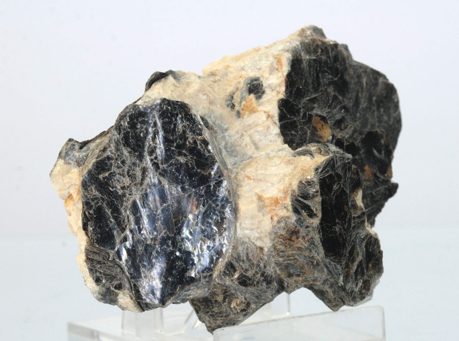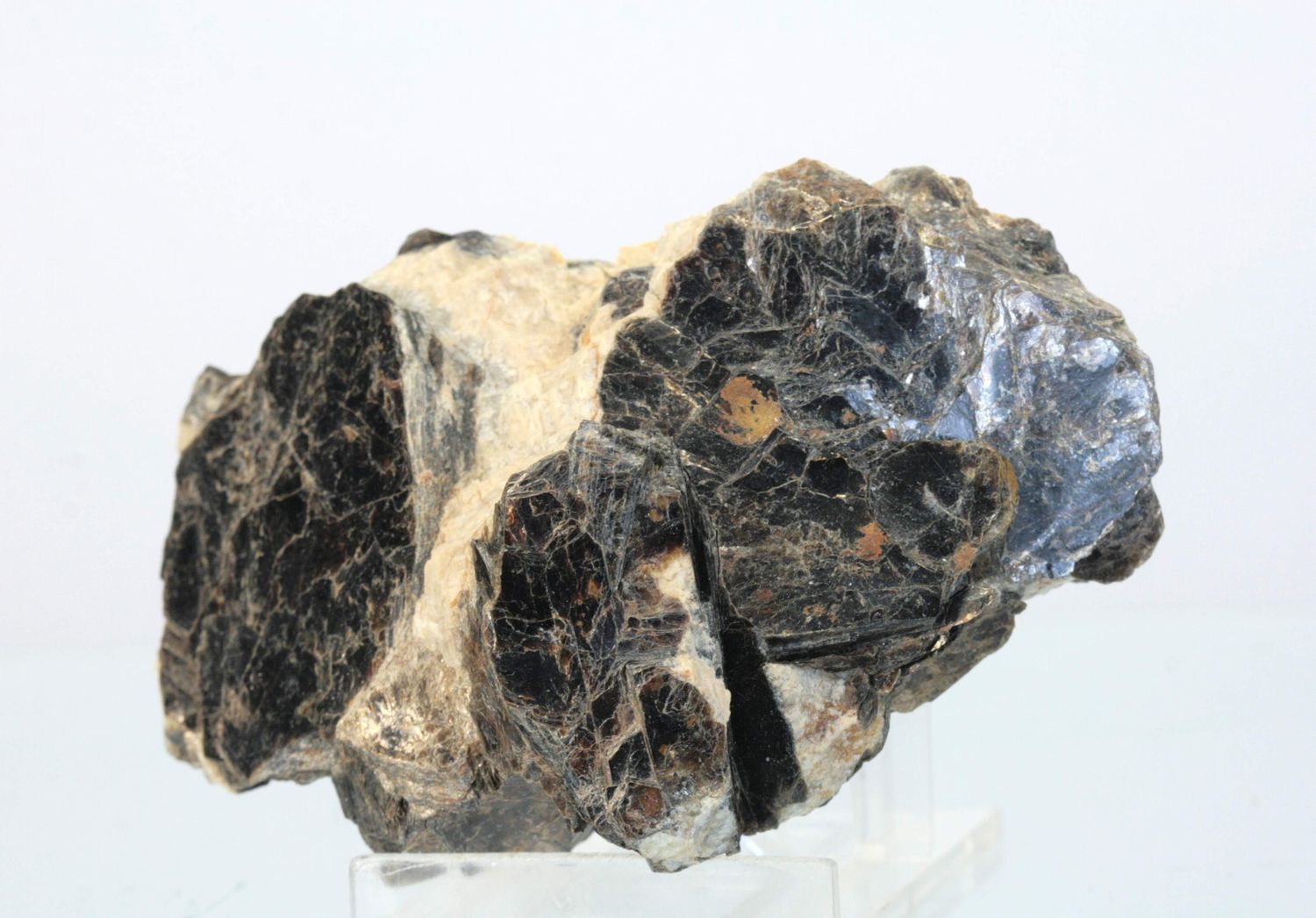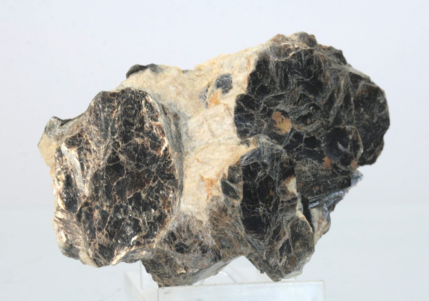 Schönes Beispiel für dunkelbraune tafelförmige Biotit-Kristalle, die in eine Feldspat-Matrix eingewachsen sind.