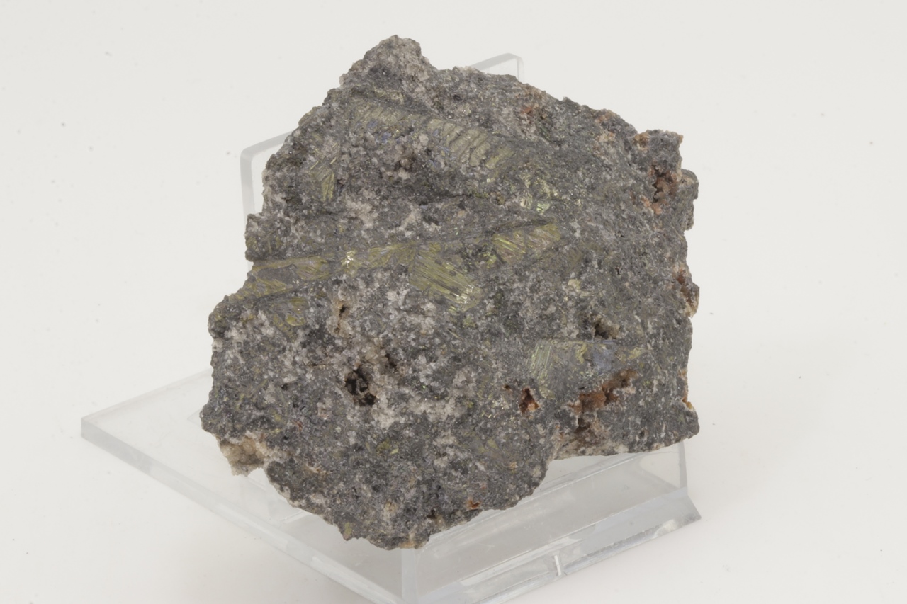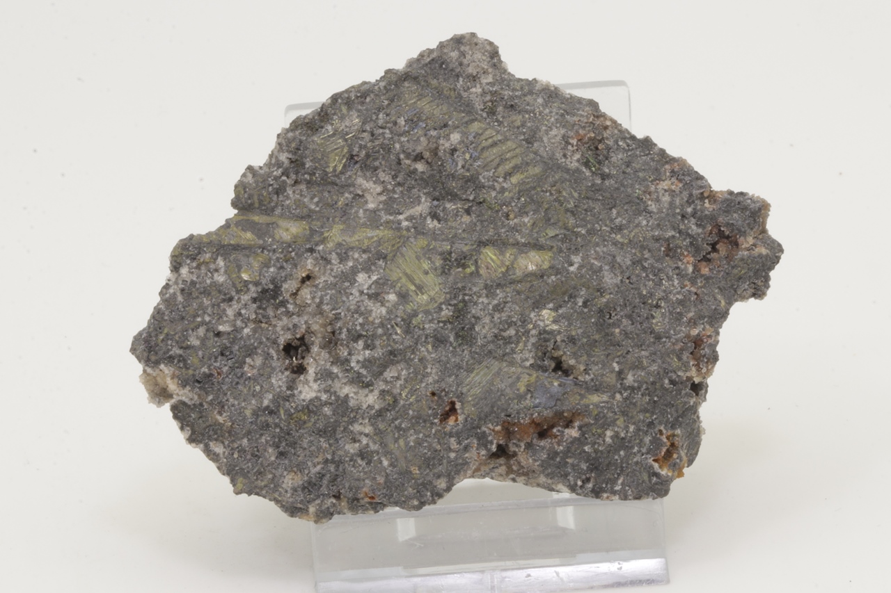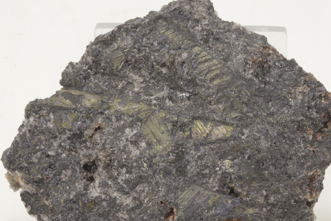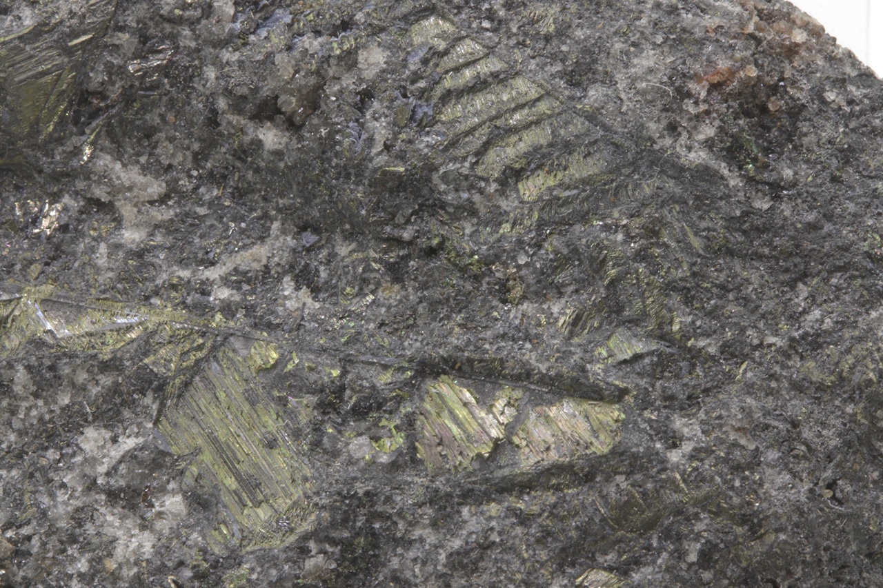 Bismut bildet metallisch glänzende, messingfarbene skelettartige Kristalle, die den gesamten Stufe durchwachsen. Auf der Stufe befindet sich auch ein ungewöhnlich großer Kristall in skelettartiger Form mit einer Größe von 4,3 cm. Es handelt sich um ein sehr reichhaltiges Exemplar dieses Minerals aus dem Bergwerk Eliáš .