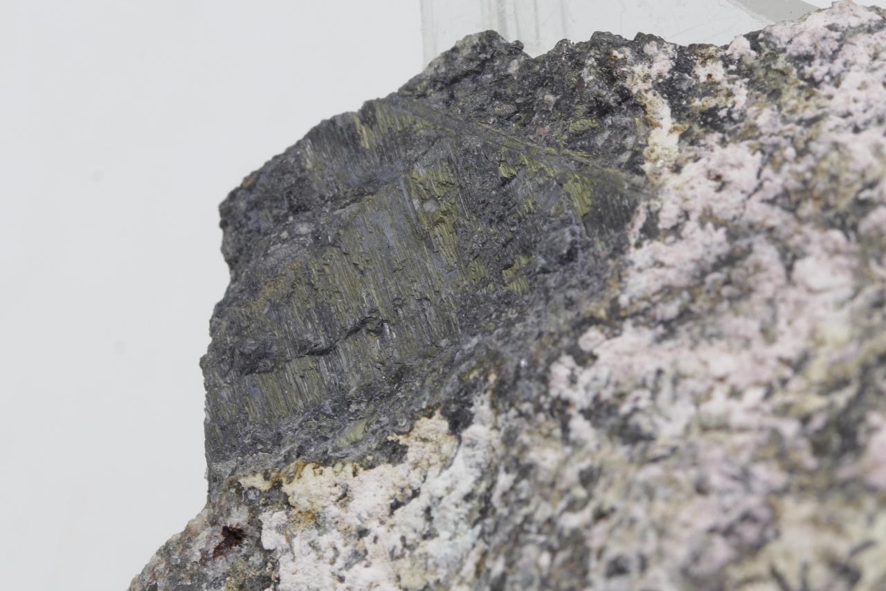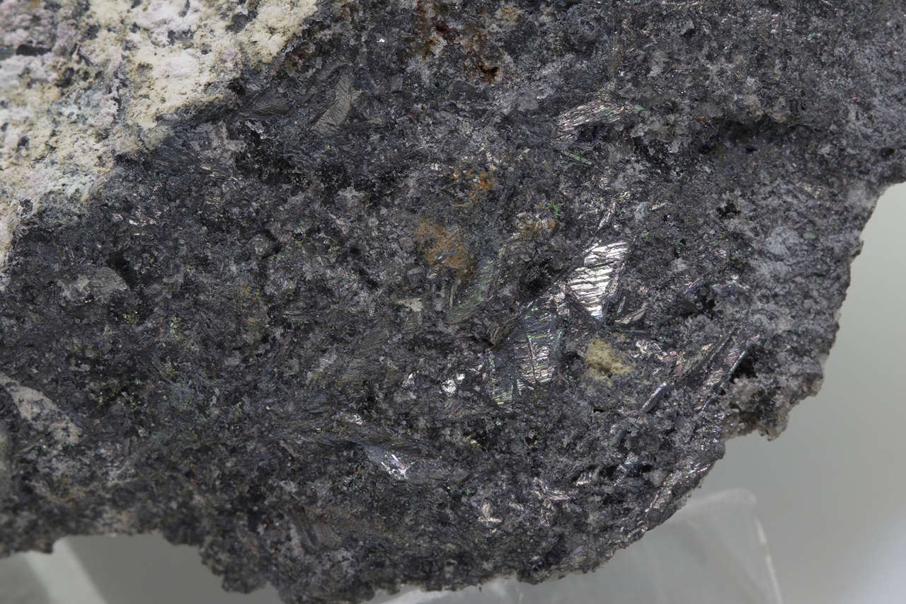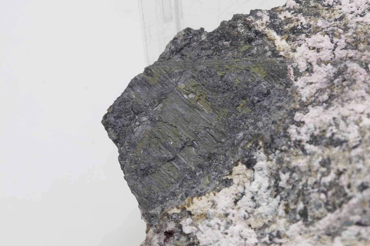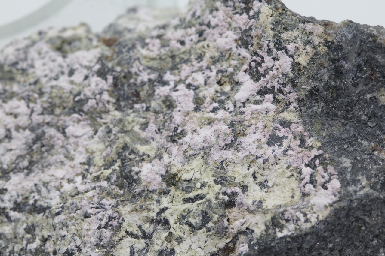 Bismut bildet metallische, messingfarbene, skelettartige Kristalle, die durch das gesamte Exemplar wachsen. Zudem befindet sich ein ungewöhnlich großer skelettartiger Habituskristall von 2,2 cm Größe auf dem Exemplar. Diese Probe enthält auch pulverige weiß-rosa Aggregate von sekundären Mineralien. Es ist ein sehr reichhaltiges Exemplar dieses Minerals aus Jáchymov.