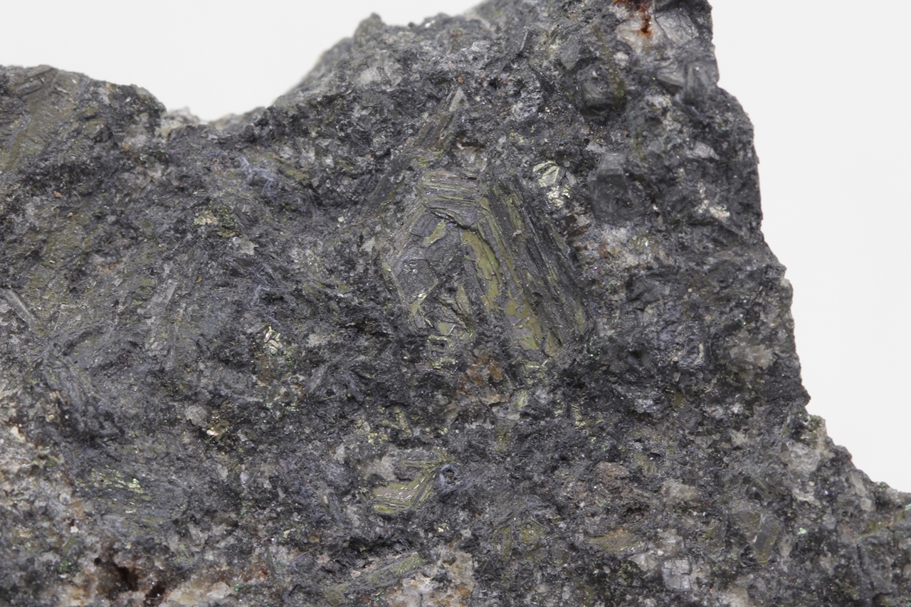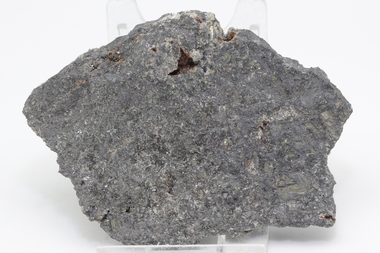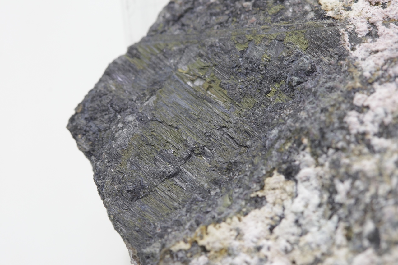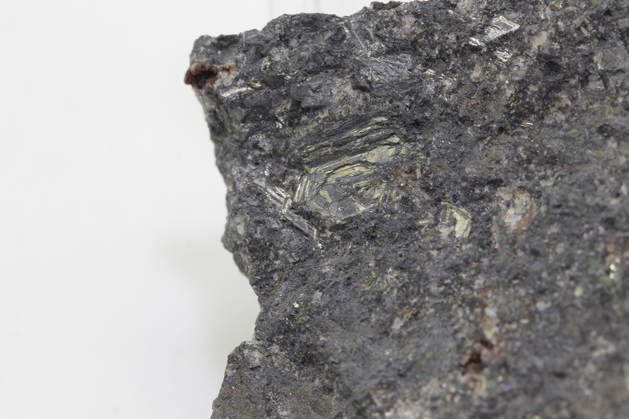 Bismut bildet metallische, messingfarbene, skelettartige Kristalle, die durch das gesamte Exemplar wachsen. Zudem befindet sich ein ungewöhnlich großer skelettartiger Habituskristall von 2,2 cm Größe auf dem Exemplar. Diese Probe enthält auch pulverige weiß-rosa Aggregate von sekundären Mineralien. Es ist ein sehr reichhaltiges Exemplar dieses Minerals aus Jáchymov.