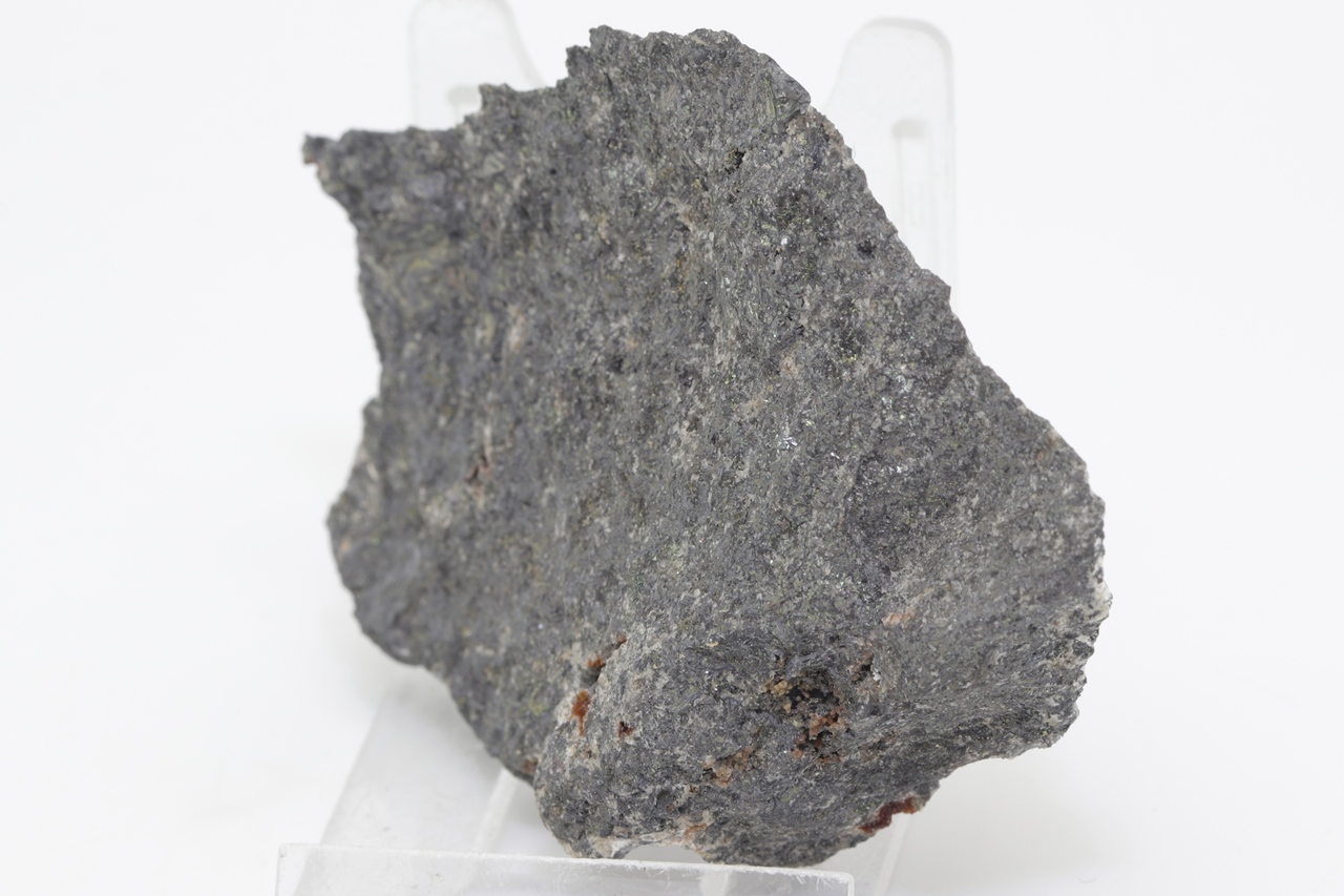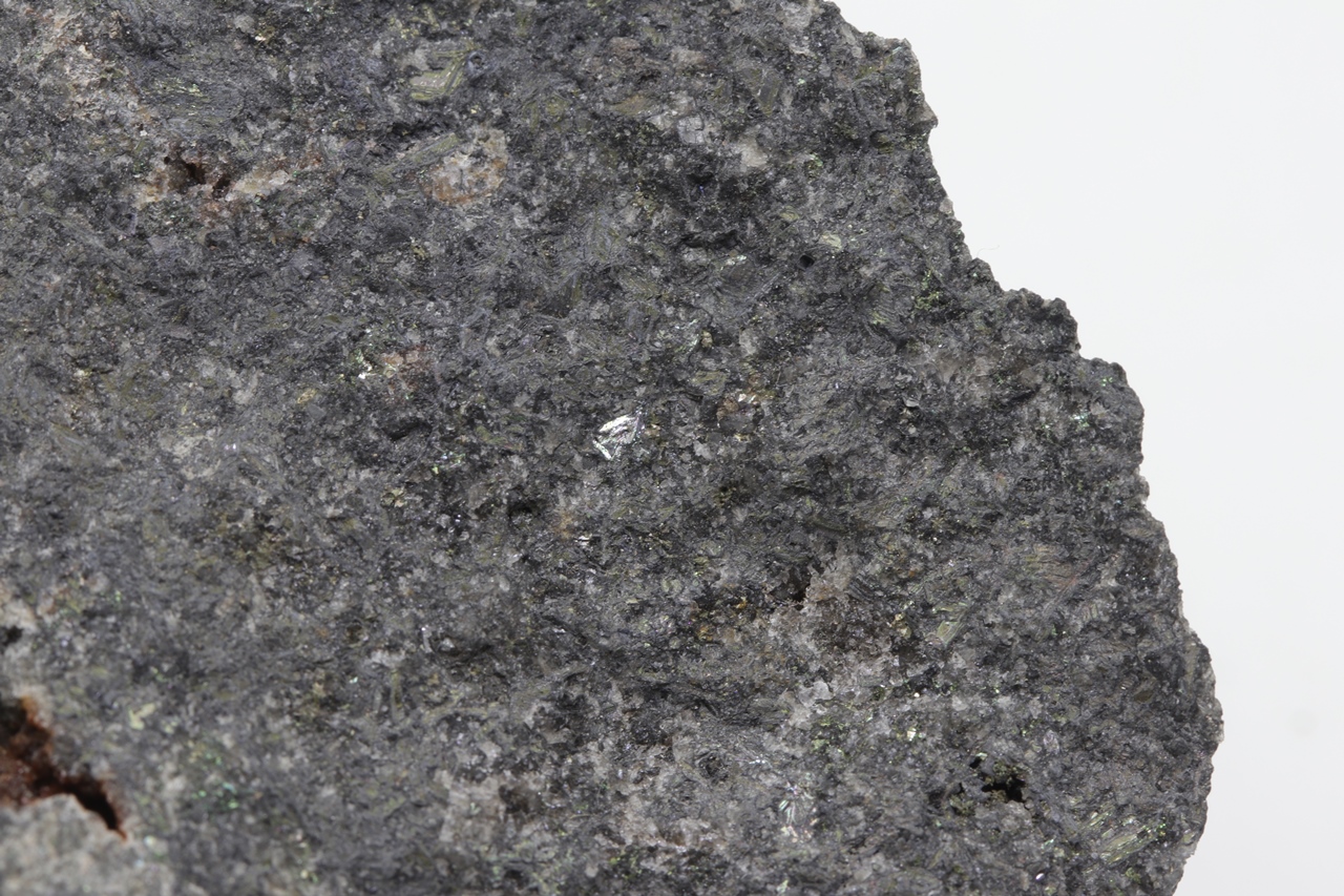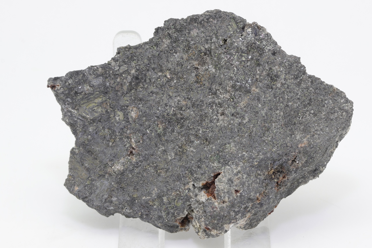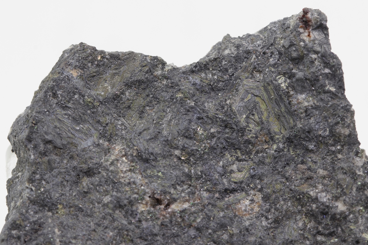 Bismut bildet metallische, messingfarbene, skelettartige Kristalle, die durch das gesamte Exemplar wachsen. Zudem befindet sich ein ungewöhnlich großer skelettartiger Habituskristall von 2,2 cm Größe auf dem Exemplar. Diese Probe enthält auch pulverige weiß-rosa Aggregate von sekundären Mineralien. Es ist ein sehr reichhaltiges Exemplar dieses Minerals aus Jáchymov.