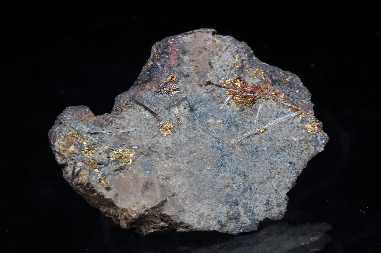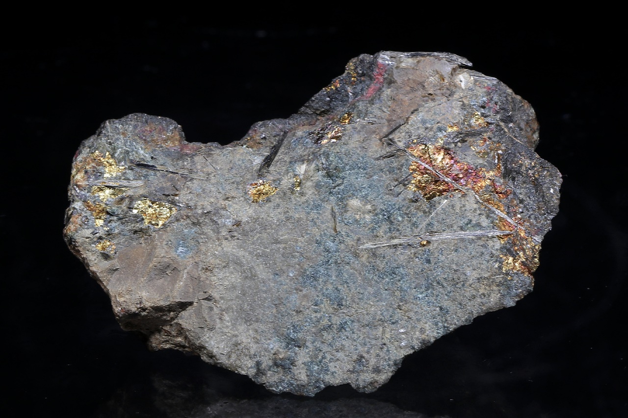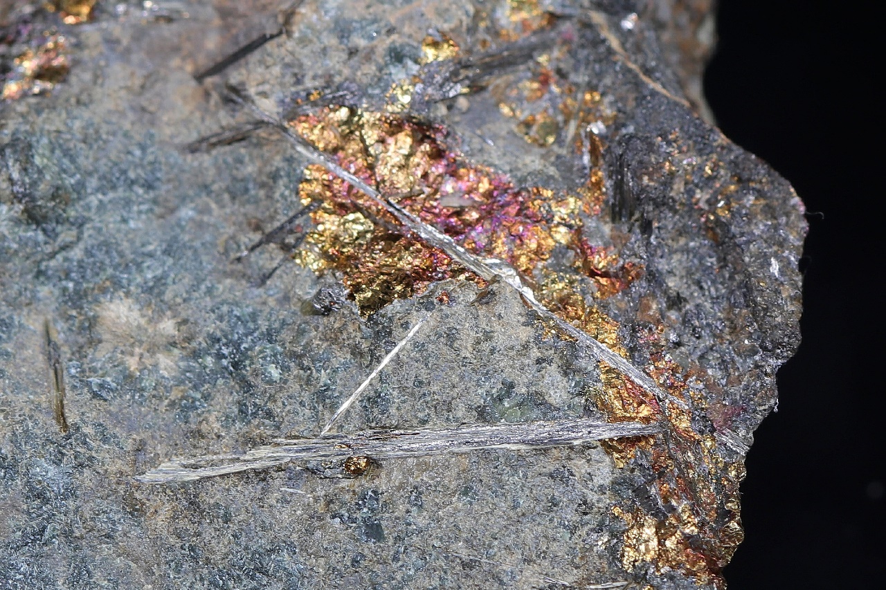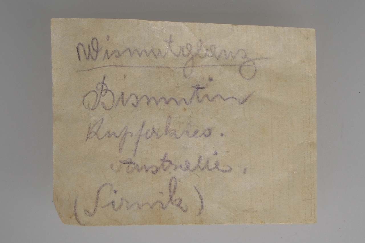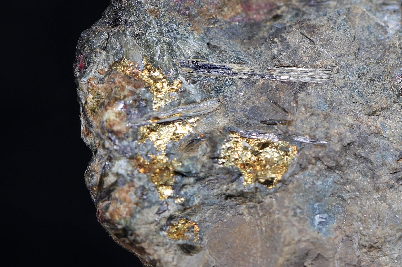 Krystalle von Bismutinit mit Chalkopyrit aus einer nicht näher bestimmten australischen Lokalität. Der größte Bismutinit-Kristall ist 18 mm groß.