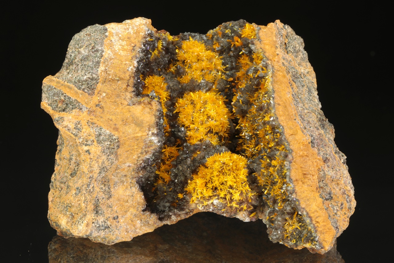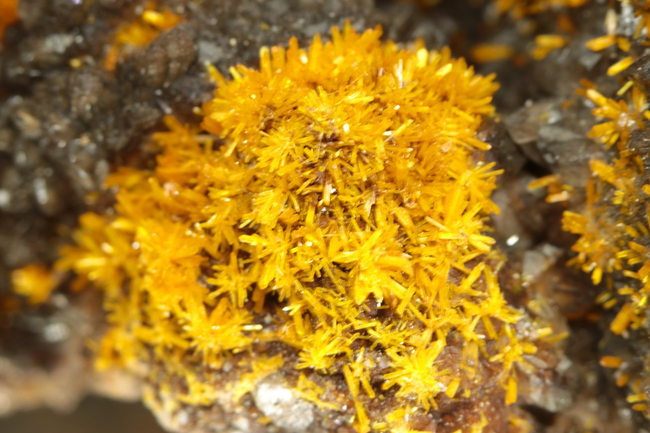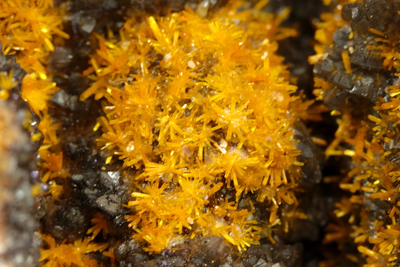Wunderschönes Exemplar von sattgelben Kristallen des Uranylsilikats, reichlich wachsend auf dunklem Kalkstein. Säulenförmig, bis zu zwei Millimeter große Kristalle bilden radiale Aggregate, die an Blüten erinnern .