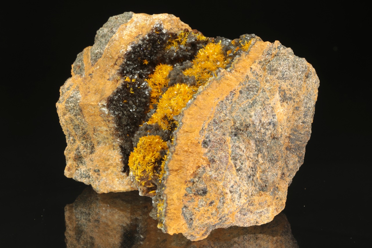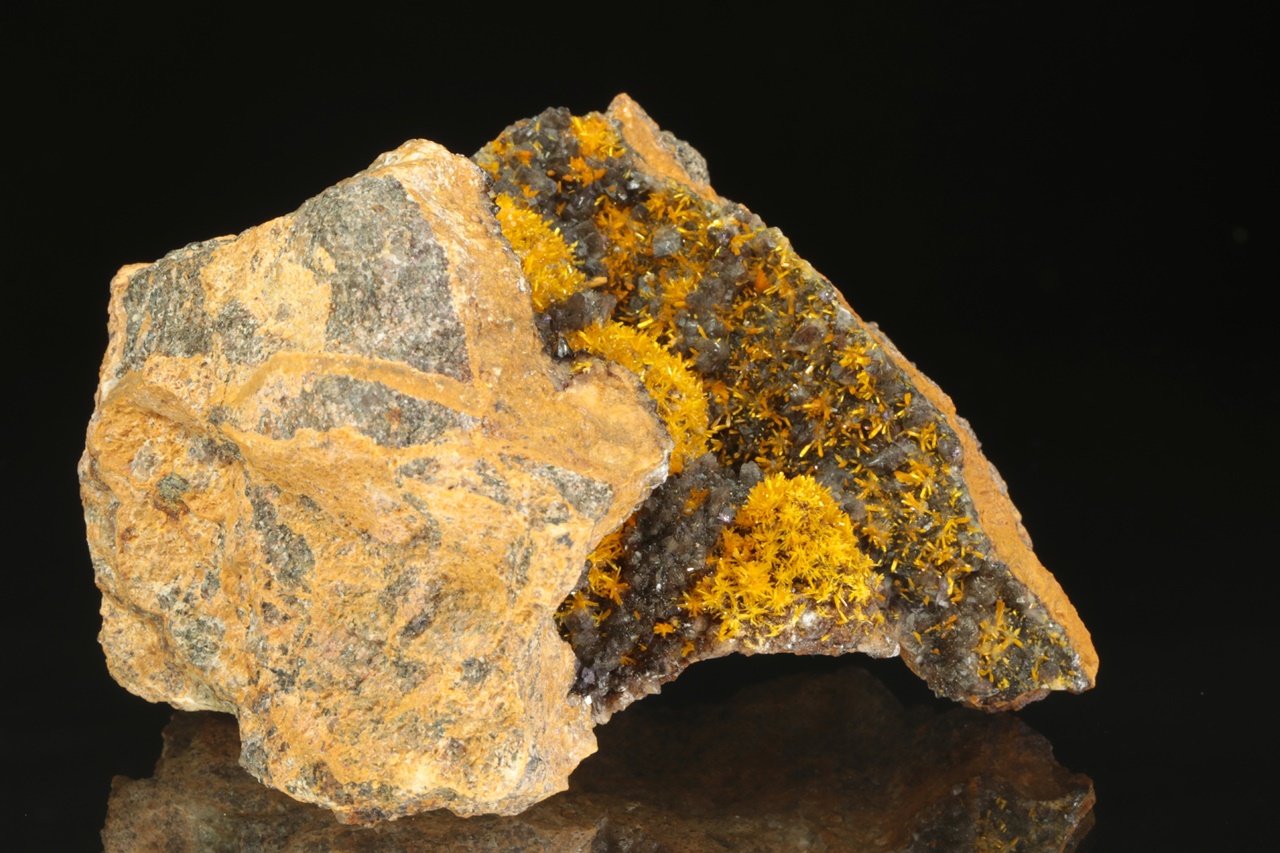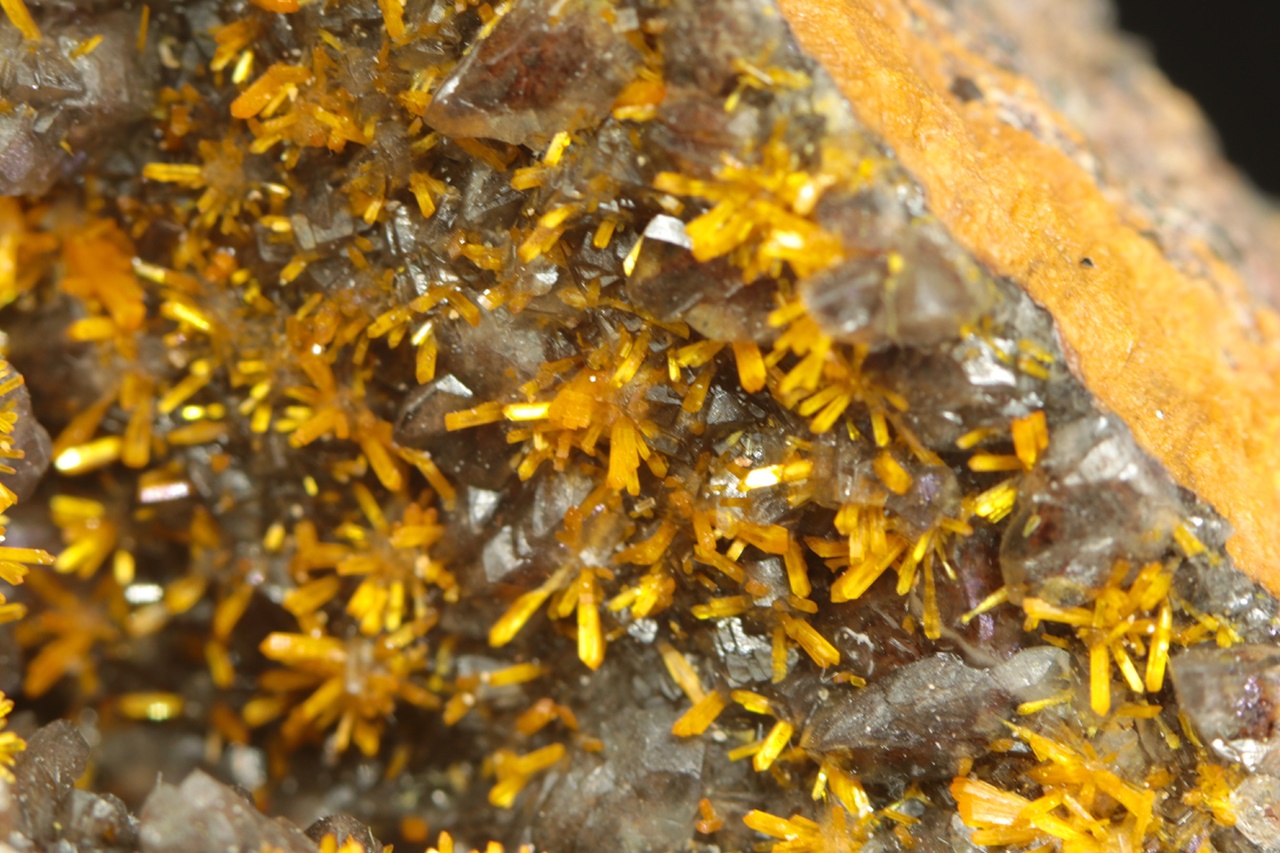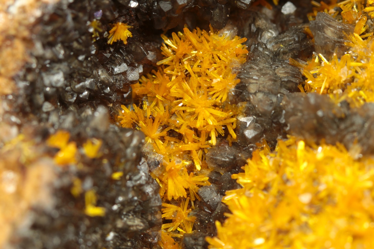 Wunderschönes Exemplar von sattgelben Kristallen des Uranylsilikats, reichlich wachsend auf dunklem Kalkstein. Säulenförmig, bis zu zwei Millimeter große Kristalle bilden radiale Aggregate, die an Blüten erinnern .