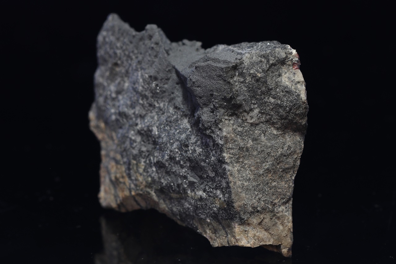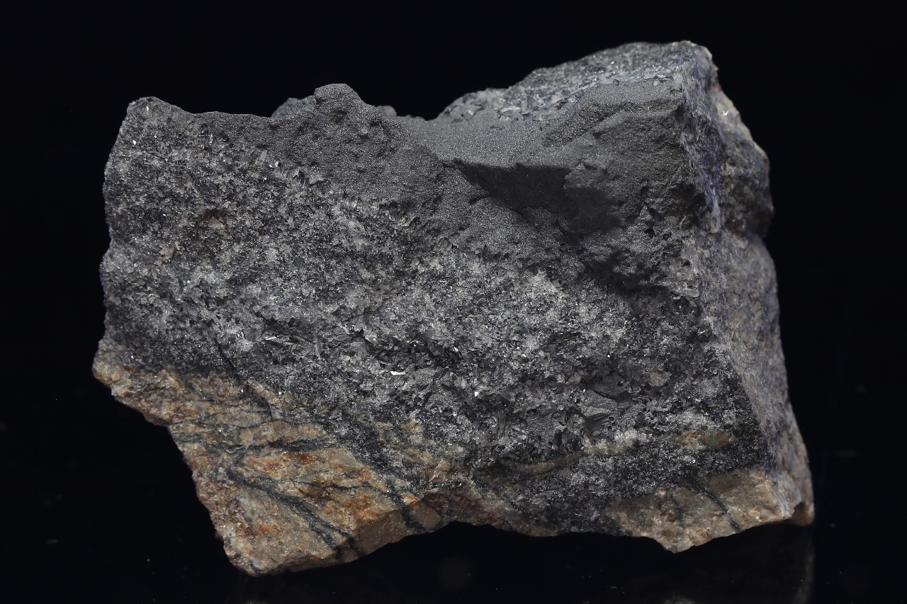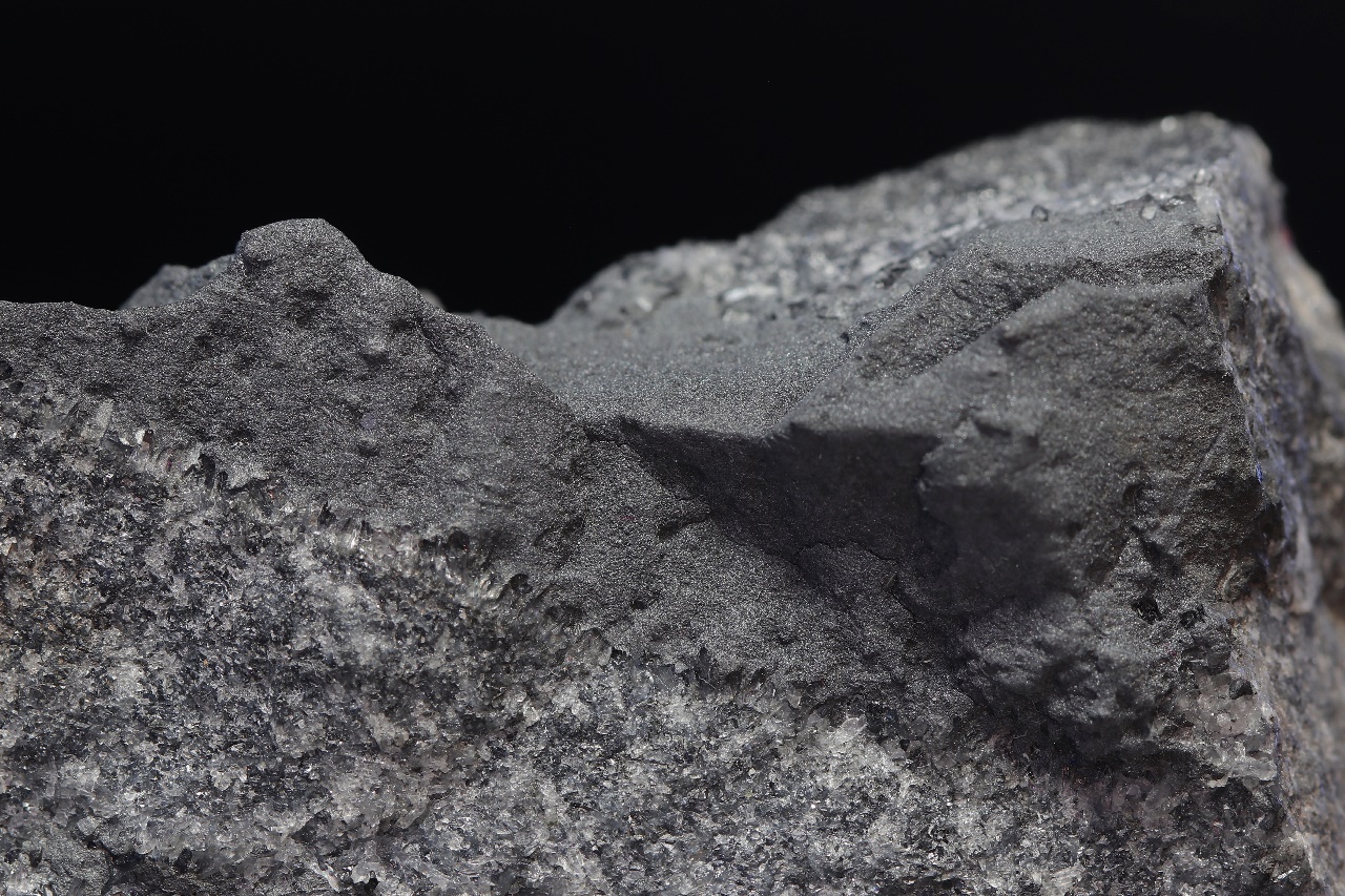 Grauer, matter, massiver Boulangerit, auf Antimonit sitzend, durchwachsen mit Quarz. Die Probe stammt aus dem Bergwerk 25. Februar.