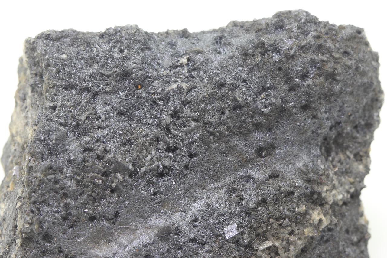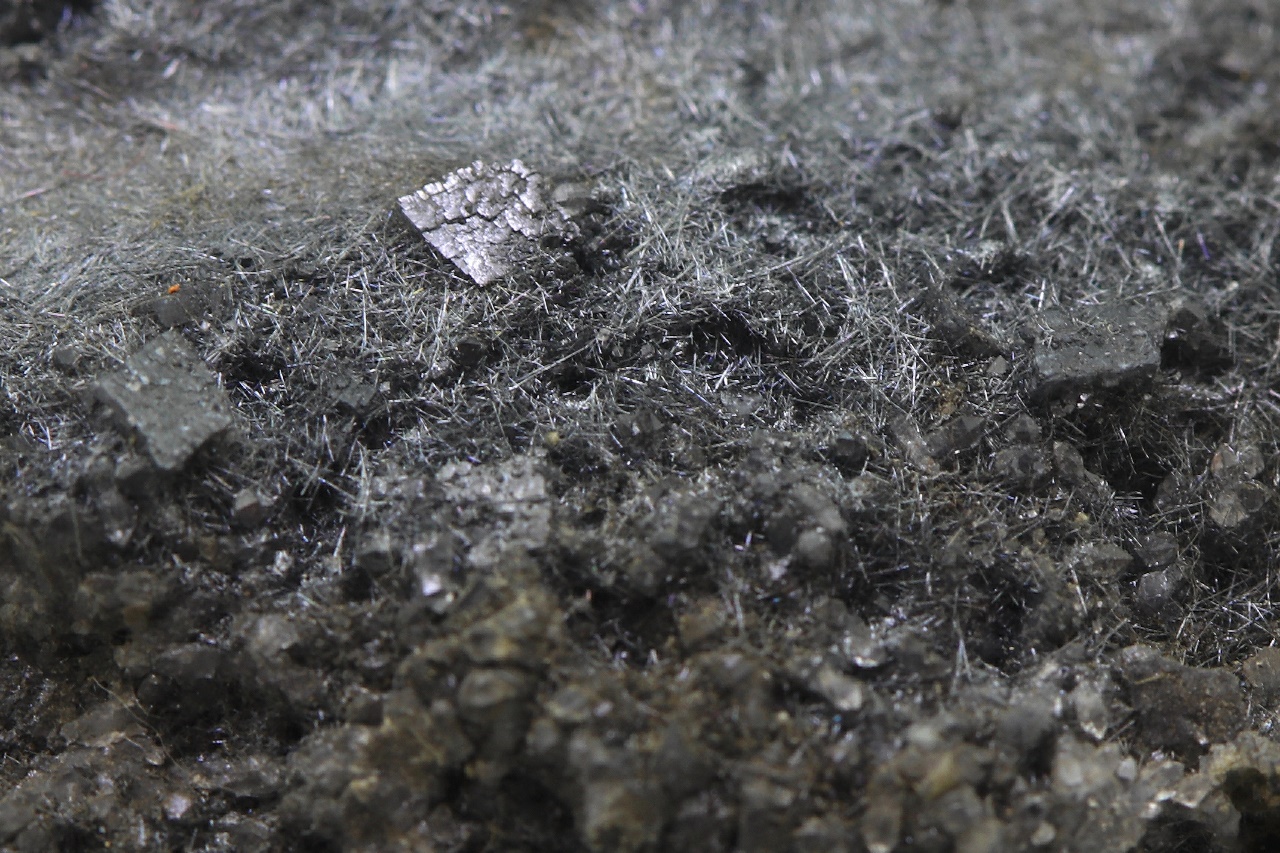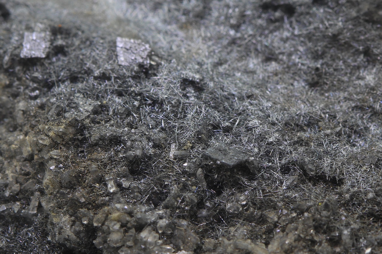 Bouhatý vzorek černých lesklých jehliček boulangeritu.