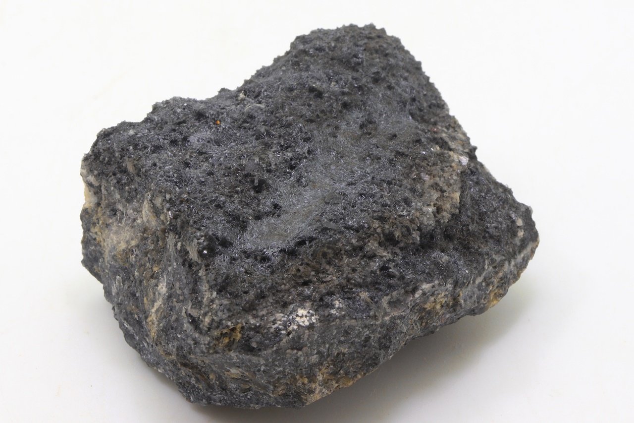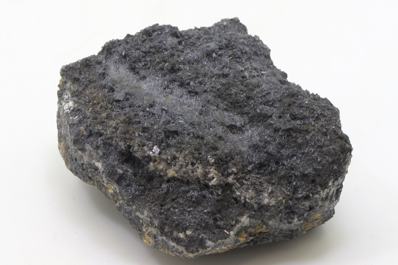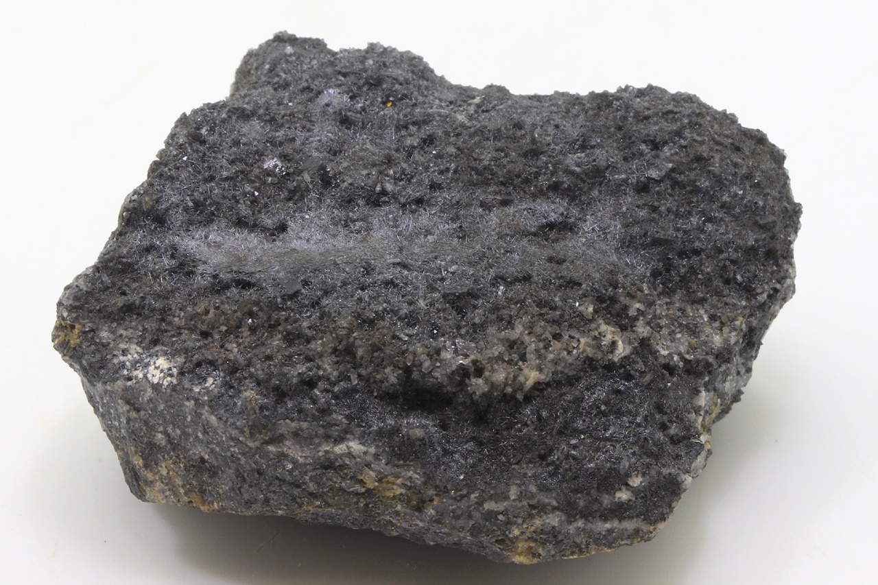 Bouhatý vzorek černých lesklých jehliček boulangeritu.