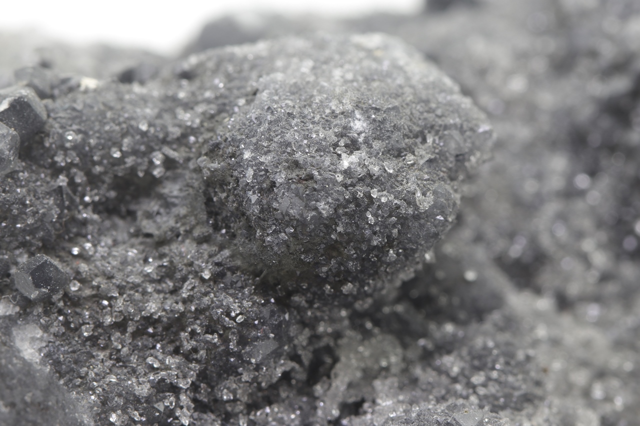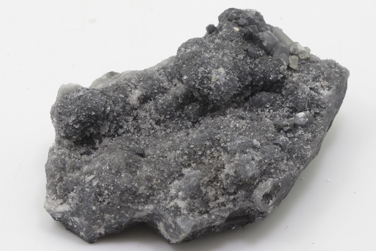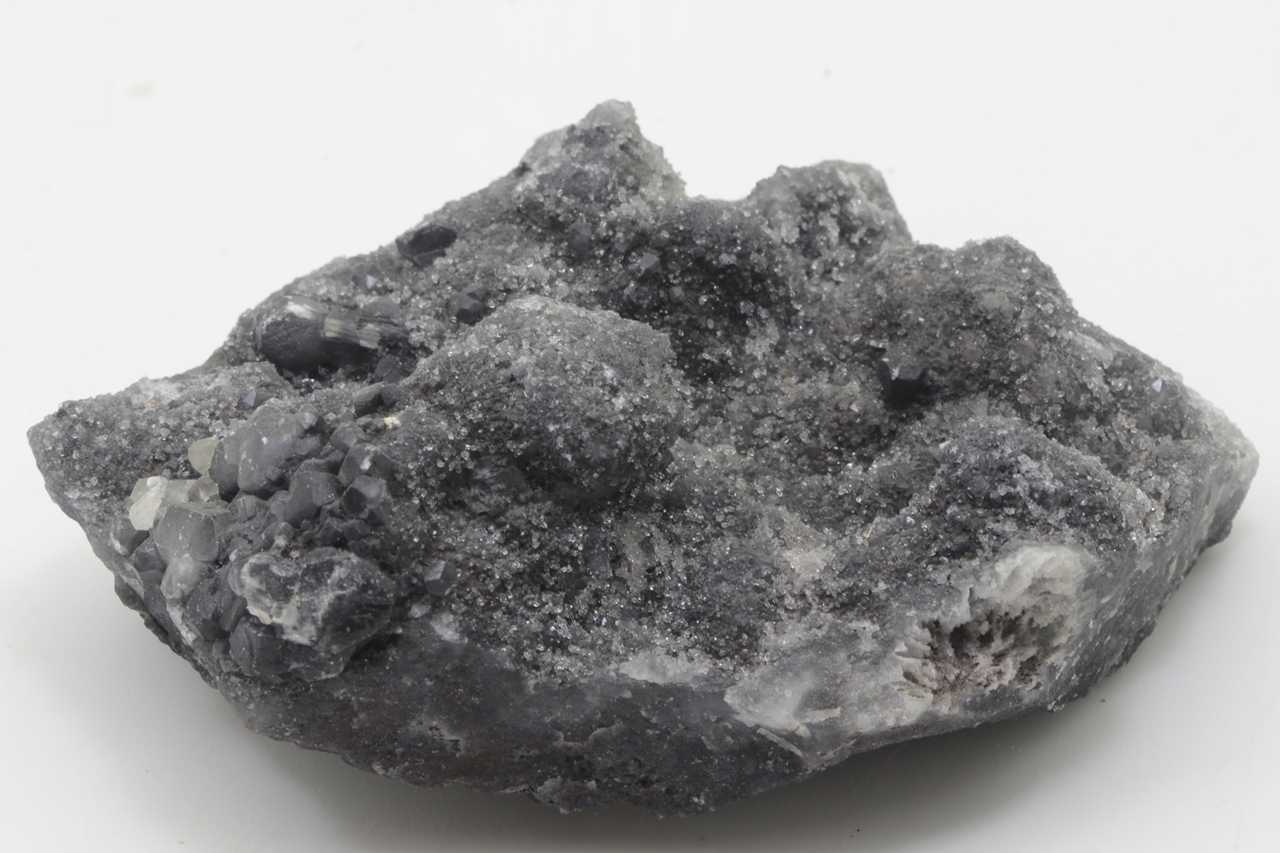 Dunkle Druse von kleinen Quarzkristallen, bewachsen mit prismatischen Calcitkristallen und einem 1 cm langen, dünnen Boulangeritkristall.