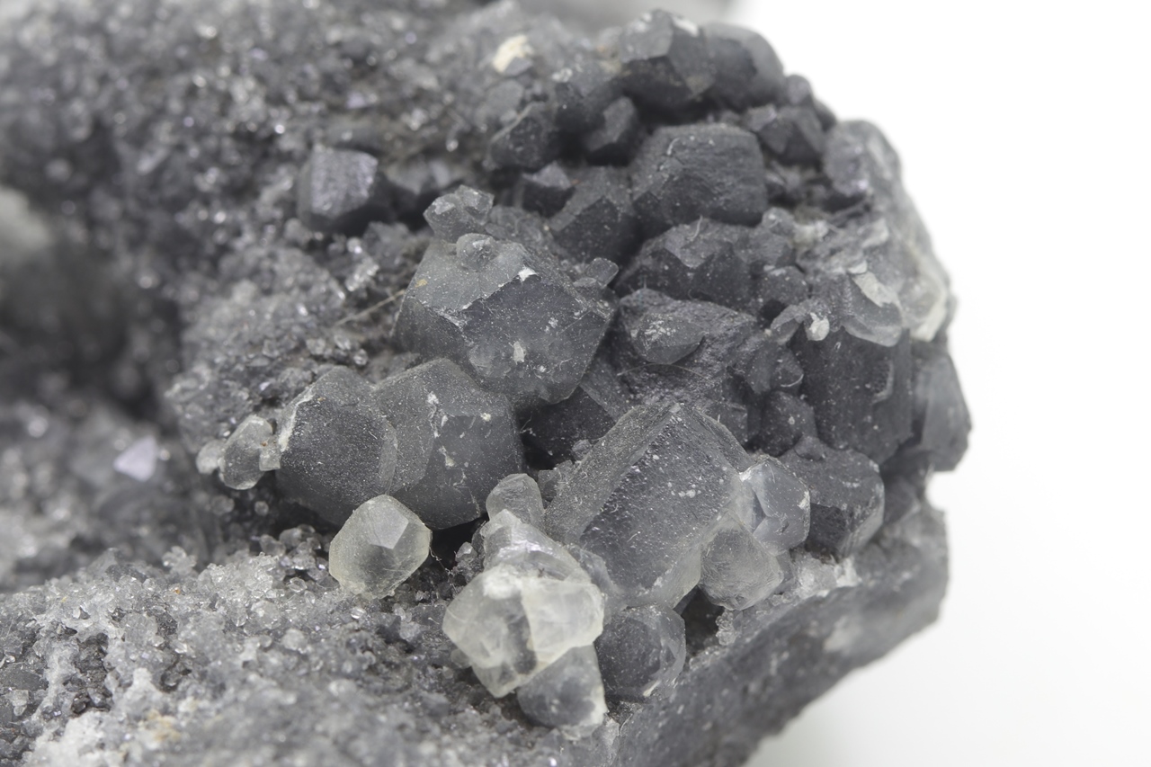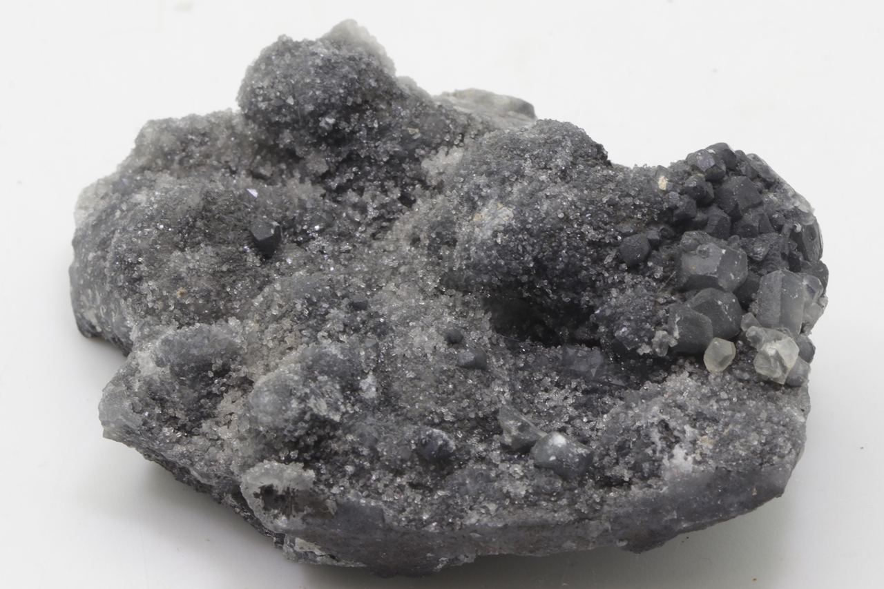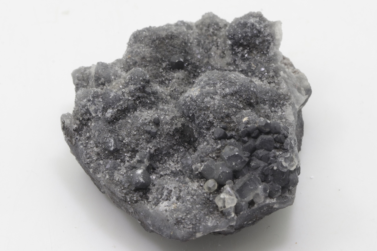 Dunkle Druse von kleinen Quarzkristallen, bewachsen mit prismatischen Calcitkristallen und einem 1 cm langen, dünnen Boulangeritkristall.