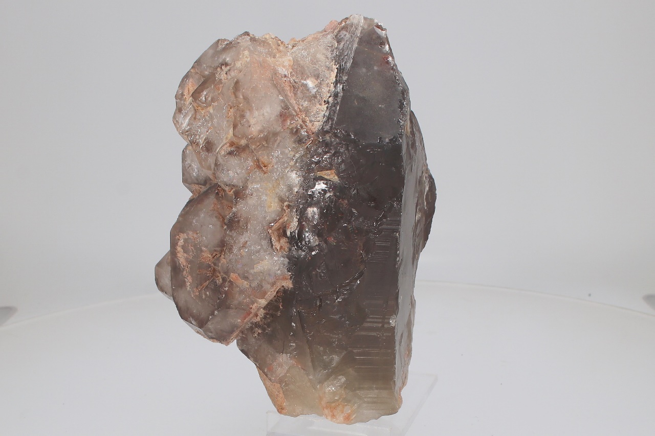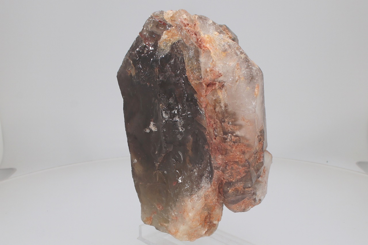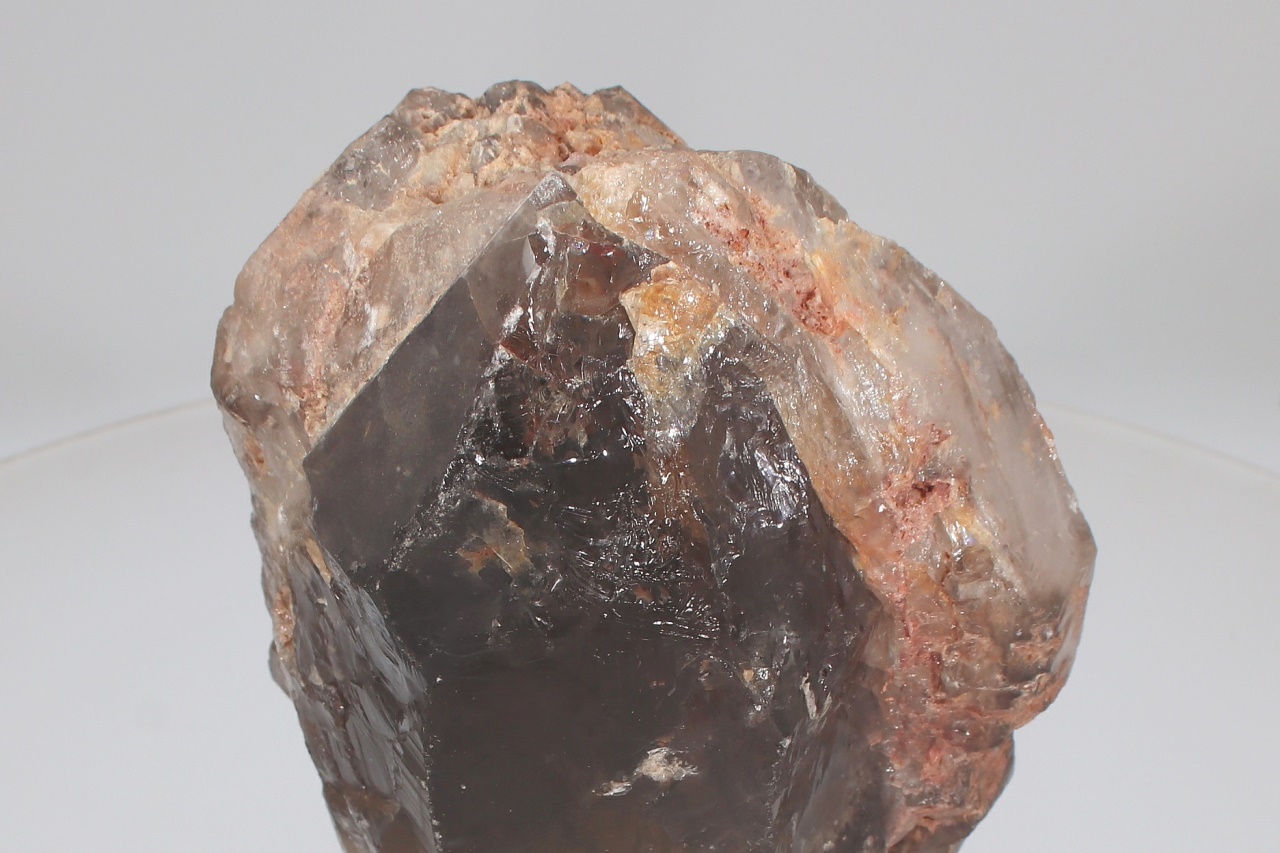 Jüngerer Kristall des dunklen Citrins, der mit hypopararelen Aggregaten der jüngeren hellen Záhněda überwachsen ist.