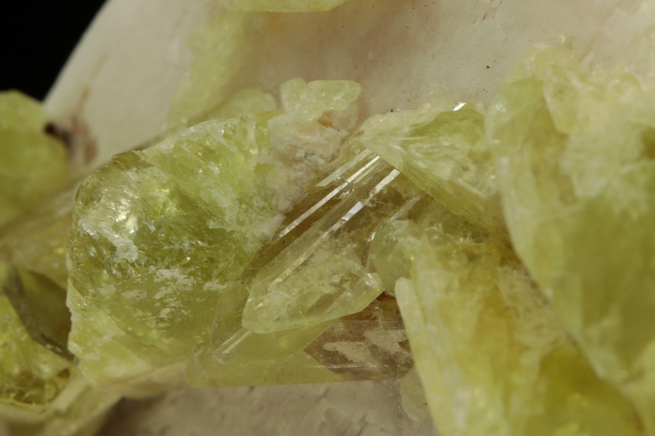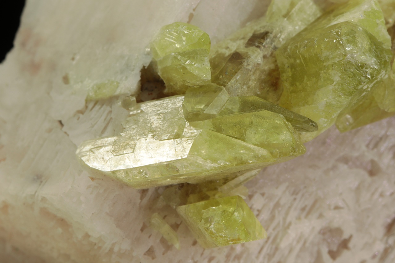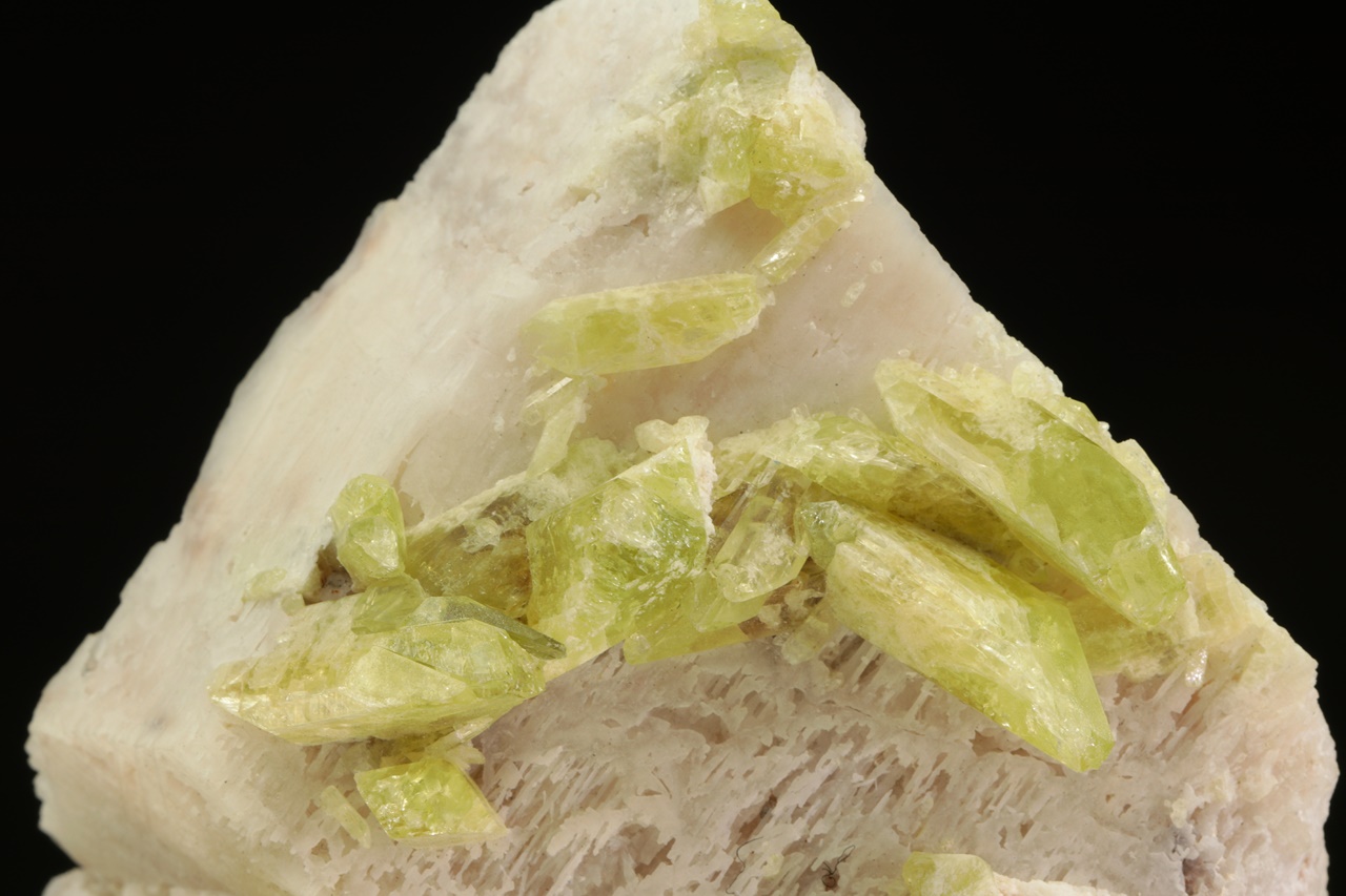 Probe eines grünen Edelstein-Brazilianits.. Beispiel von hellgrünen Brazilianitkristallen mit einer Größe von bis zu 25 mm, die auf Orthoklas gewachsen sind.