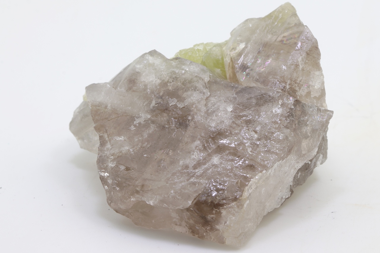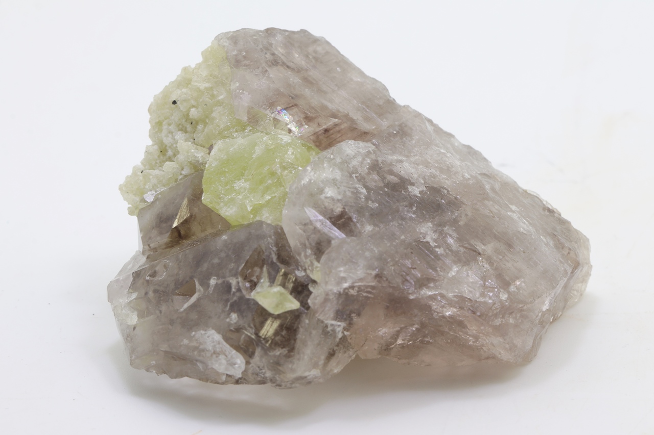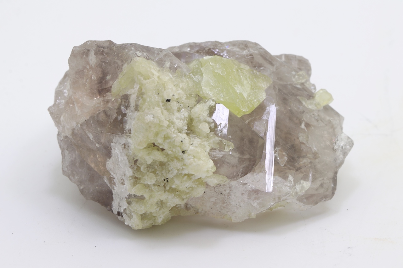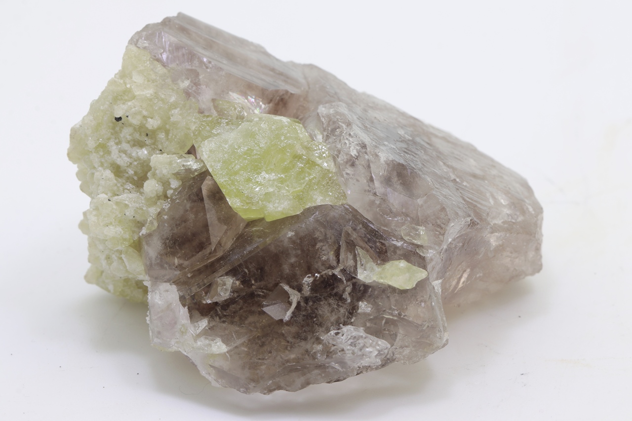 Giftig grüne Brazilianitkristalle, die auf Rauchquartz gewachsen sind .