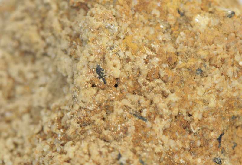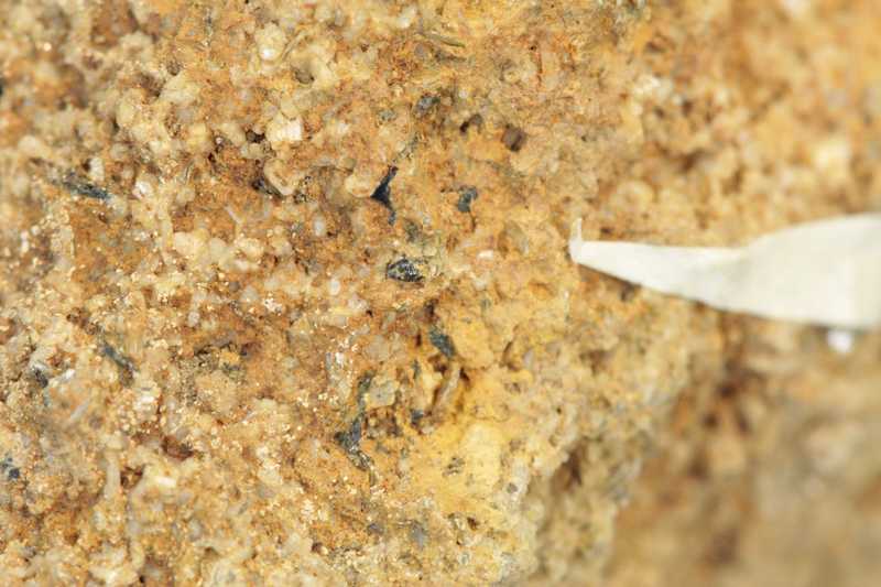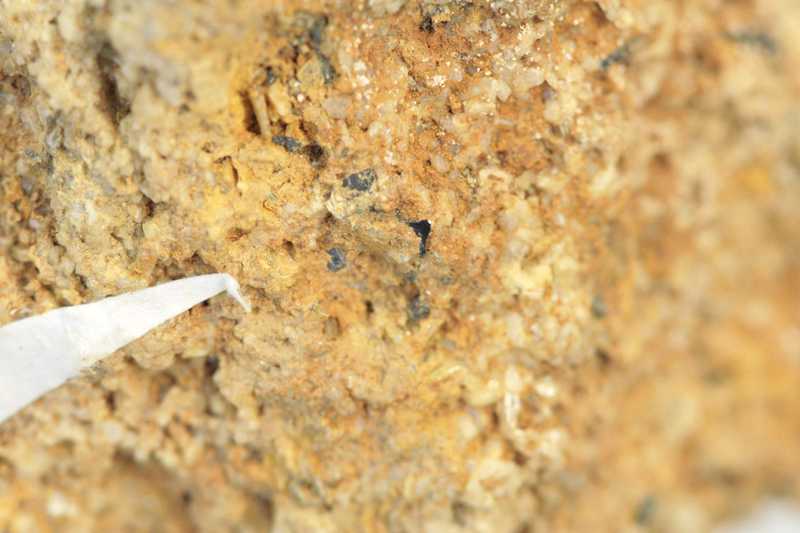 Beispiel einer pseudo-rhombischen Modifikation von Titanoxid Brookit aus dem Fundort Bobrůvka (1978). Reiche Probe von kleinen dunklen Brookit-Kristallen, die in einer pegmatitischen Matrix eingeschlossen sind .